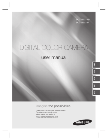 SCC-B2333(P) SCC-B2033P DIGITAL COLOR CAMERA user manual ENG RUS POL CZE TUR imagine the possibilities Thank you for purchasing this Samsung product. To receive more complete service, please register your product at www.samsungsecurity.com Safety information CAUTION RISK OF ELECTRIC SHOCK. DO NOT OPEN CAUTION: TO REDUCE THE RISK OF ELECTRIC SHOCK, DO NOT REMOVE REAR COVER. NO USER SERVICEABLE PARTS INSIDE. REFER TO QUALIFIED SERVICE PERSONNEL.. 10. W e CAUT 1. D s 2. D 1 This symbol indicates high voltage is present inside. It is dangerous to make any kind of contact with any inside part of this product. 3. If o This symbol alerts you that important literature concerning operation and maintenance has been included with this product. 4. R c 5. K WARNING 6. In • To prevent damage which may result in fire or electric shock hazard, do not expose this appliance to rain or moisture. 7. A d WARNING 1. Be sure to use only the standard adapter that is specified in the specification sheet. Using any other adapter could cause fire, electrical shock, or damage to the product 2. Incorrectly connecting the power supply or replacing battery may cause explosion, fire, electric shock, or damage to the product. 3. Do not connect multiple cameras to a single adapter. Exceeding the capacity may cause abnormal heat generation or fire. 4. Securely plug the power cord into the power receptacle. Insecure connection may cause fire. 5. When installing the camera, fasten it securely and firmly. A falling camera may cause personal injury. 6. Do not place conductive objects (e.g. screwdrivers, coins, metal things, etc.) or containers filled with water on top of the camera. Doing so may cause personal injury due to fire, electric shock, or falling objects. 7. Do not install the unit in humid, dusty, or sooty locations. Doing so may cause fire or electric shock. 8. If any unusual smells or smoke come from the unit, stop using the product. In such case, immediately disconnect the power source and contact the service center. Continued use in such a condition may cause fire or electric shock. 9. If this product fails to operate normally, contact the nearest service center. Never disassemble or modify this product in any way. (SAMSUNG is not liable for problems caused by unauthorized modifications or attempted repair.) 2 – DIGITAL COLOR CAMERA 8. A v 9. T Safety information 10. When cleaning, do not spray water directly onto parts of the product. Doing so may cause fire or electric shock. CAUTION 1. Do not drop objects on the product or apply strong shock to it. Keep away from a location subject to excessive vibrationor magnetic interference. 2. Do not install in a location subject to high temperature (over 50°C), low temperature (below 10°C), or high humidity. Doing so may cause fire or electric shock. d of nce nce 4. Remove the power plug from the outlet when then there is a lightning. Neglecting to do so may cause fire or damage to the product. 5. Keep out of direct sunlight and heat radiation sources. It may cause fire. 6. Install it in a place with good ventilation. 7. Avoid aiming the camera directly towards extremely bright objects such as sun, as this may damage the CCD image sensor. 8. Apparatus shall not be exposed to dripping or splashing and no objects filled with liquids, such as vases, shall be placed on the apparatus. 9. The Mains plug is used as a disconnect device and shall stay readily operable at any time. c ed k, uch e zed English – 3 ENG y 3. If you want to relocate the already installed product, be sure to turn off the power and then move or reinstall it. Important Safety Instructions 1. Read these instructions. 2. Keep these instructions. 3. Heed all warnings. 4. Follow all instructions. 5. Do not use this apparatus near water. 6. Clean only with dry cloth. 7. Do not block any ventilation openings. Install in accordance with the manufacturer’s instructions. 8. Do not install near any heat sources such as radiators, heat registers, or other apparatus (including amplifiers) that produce heat. 9. Do not defeat the safety purpose of the polarized or grounding-type plug. A polarized plug has two blades with one wider than the other. A grounding type plug has two blades and a third grounding prong. The wide blade or the third prong is provided for your safety. If the provided plug does not fit into your outlet, consult an electrician for replacement of the obsolete outlet. 10.Protect the power cord from being walked on or pinched particularly at plugs, convenience receptacles, and the point where they exit from the apparatus. 11.Only use attachments/accessories specified by the manufacturer. 12.Use only with cart, stand, tripod, bracket, or table specified by the manufacturer, or sold with the apparatus. 13.Unplug this apparatus when a card is used. Use caution when moving the cart/ apparatus combination to avoid injury from tip-over. 14.Refer all servicing to qualified service personnel. Servicing is required when the apparatus has been damaged in any way, such as powersupply cord or plug is damaged, liquid has been spilled or objects have fallen into the apparatus, the apparatus has been exposed to rain or moisture, does not operate normally, or has been dropped. 4 – DIGITAL COLOR CAMERA es wide sult Introduction Features PRODUCT & ACCESSORIES Part Names and Functions 6 7 8 Installation Connecting the Auto Iris Lens Connector Mounting the lens Connecting cables and checking operation 11 11 12 How to use OSD Menu Using Icons in the Menu Main Menu Profile Camera Setup Intelligence Privacy Zone Setup Other Set Communication System Information Language 13 13 14 16 22 24 25 26 26 26 Specifications Specifications 28 English – 5 ENG have y, or Contents Introduction FEATURES ❖ High Resolution • This camera has realized high resolution of 600 lines using the top-notch full digital image processing and special algorithm technologies. ❖ Intelligent Motion Detection & Tracking • This is an int