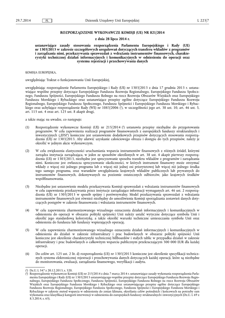 29.7.2014 Dziennik Urzędowy Unii Europejskiej PL L 223/7 ROZPORZĄDZENIE WYKONAWCZE KOMISJI (UE) NR 821/2014 z dnia 28 lipca 2014 r. ustanawiające zasady stosowania rozporządzenia Parlamentu Europejskiego i Rady (UE) nr 1303/2013 w zakresie szczegółowych uregulowań dotyczących transferu wkładów z programów i zarządzania nimi, przekazywania sprawozdań z wdrażania instrumentów finansowych, charakte rystyki technicznej działań informacyjnych i komunikacyjnych w odniesieniu do operacji oraz systemu rejestracji i przechowywania danych KOMISJA EUROPEJSKA, uwzględniając Traktat o funkcjonowaniu Unii Europejskiej, uwzględniając rozporządzenie Parlamentu Europejskiego i Rady (UE) nr 1303/2013 z dnia 17 grudnia 2013 r. ustana wiające wspólne przepisy dotyczące Europejskiego Funduszu Rozwoju Regionalnego, Europejskiego Funduszu Społecz nego, Funduszu Spójności, Europejskiego Funduszu Rolnego na rzecz Rozwoju Obszarów Wiejskich oraz Europejskiego Funduszu Morskiego i Rybackiego oraz ustanawiające przepisy ogólne dotyczące Europejskiego Funduszu Rozwoju Regionalnego, Europejskiego Funduszu Społecznego, Funduszu Spójności i Europejskiego Funduszu Morskiego i Rybac kiego oraz uchylające rozporządzenie Rady (WE) nr 1083/2006 (1), w szczególności jego art. 38 ust. 10, art. 46 ust. 3, art. 115 ust. 4 oraz art. 125 ust. 8 akapit drugi, a także mając na uwadze, co następuje: (1) Rozporządzenie wykonawcze Komisji (UE) nr 215/2014 (2) ustanawia przepisy niezbędne do przygotowania programów. W celu zapewnienia realizacji programów finansowanych z europejskich funduszy strukturalnych i inwestycyjnych („EFSI”) konieczne jest ustanowienie dodatkowych przepisów dotyczących stosowania rozporzą dzenia (UE) nr 1303/2013. Aby ułatwić uzyskanie całościowego obrazu i dostępu do tych przepisów, należy je określić w jednym akcie wykonawczym. (2) W celu zwiększenia elastyczności uruchamiania wsparcia instrumentów finansowych z różnych źródeł, którymi zarządza instytucja zarządzająca, w jeden ze sposobów określonych w art. 38 ust. 4 akapit pierwszy rozporzą dzenia (UE) nr 1303/2013, niezbędne jest sprecyzowanie sposobu transferu wkładów z programów i zarządzania nimi. Konieczne jest zwłaszcza sprecyzowanie okoliczności, w których instrument finansowy może otrzymać wkłady z więcej niż jednego programu lub z więcej niż jednej osi priorytetowej lub więcej niż jednego środka tego samego programu, oraz warunków uwzględniania krajowych wkładów publicznych lub prywatnych do instrumentów finansowych, dokonywanych na poziomie ostatecznych odbiorców, jako krajowych środków współfinansowania. (3) Niezbędne jest ustanowienie modelu przekazywania Komisji sprawozdań z wdrażania instrumentów finansowych w celu zapewnienia przekazywania przez instytucje zarządzające informacji wymaganych art. 46 ust. 2 rozporzą dzenia (UE) nr 1303/2013 w sposób spójny i porównywalny. Model przekazywania sprawozdań z wdrażania instrumentów finansowych jest również niezbędny do umożliwienia Komisji sporządzania zestawień danych doty czących postępów w zakresie finansowania i wdrażania instrumentów finansowych. (4) W celu zapewnienia zharmonizowanego wizualnego oznaczenia działań informacyjnych i komunikacyjnych w odniesieniu do operacji w obszarze polityki spójności Unii należy ustalić wytyczne dotyczące symbolu Unii i określić jego standardową kolorystykę, a także określić warunki techniczne umieszczania symbolu Unii oraz odniesienia do funduszu lub funduszy wspierających operację. (5) W celu zapewnienia zharmonizowanego wizualnego oznaczenia działań informacyjnych i komunikacyjnych w odniesieniu do działań w zakresie infrastruktury i prac budowlanych w obszarze polityki spójności Unii konieczne jest określenie charakterystyki technicznej billboardów i stałych tablic w przypadku działań w zakresie infrastruktury i prac budowlanych o całkowitym wsparciu publicznym przekraczającym 500 000 EUR dla każdej operacji. (6) Do celów art. 125 ust. 2 lit. d) rozporządzenia (UE) nr 1303/2013 konieczne jest określenie specyfikacji technicz nych systemu elektronicznej rejestracji i przechowywania danych dotyczących każdej operacji, które są niezbędne do monitorowania, ewaluacji, zarządzania finansowego, weryfikacji i audytu. (1) Dz.U. L 347 z 20.12.2013, s. 320. (2) Rozporządzenie wykonawcze Komisji (UE) nr 215/2014 z dnia 7 marca 2014 r. ustanawiające zasady wykonania rozporządzenia Parla mentu Europejskiego i Rady (UE) nr 1303/2013 ustanawiającego wspólne przepisy dotyczące Europejskiego Funduszu Rozwoju Regio nalnego, Europejskiego Funduszu Społecznego, Funduszu Spójności, Europejskiego Funduszu Rolnego na rzecz Rozwoju Obszarów Wiejskich oraz Europejskiego Funduszu Morskiego i Rybackiego oraz ustanawiającego przepisy ogólne dotyczące Europejskiego Funduszu Rozwoju Regionalnego, Europejskiego Funduszu Społecznego, Funduszu Spójności i Europejskiego Funduszu Morskiego i Rybackiego w zakresie metod wsparcia w odniesieniu do zmian klimatu, określania celów pośrednich i końcowych na potrzeby ram wykonania oraz klasyfikacji kategorii interwencji w odniesieniu do europejskich funduszy strukturalnych i inwestycyjnych (Dz.U. L 69 z 8.3.2014, s. 65). L 223/8 Dziennik Urzędowy Unii Europejskiej PL 29.7.2014 (7) Do celów skutecznego wykonania art. 122 ust. 3 akapit drugi rozporządzenia (UE) nr 1303/2013 niezbędne jest zapewnienie tego, aby specyfikacje techniczne systemu rejestracji i przechowywania danych gwarantowały pełną interoperacyjność z systemem, o którym mowa w art. 122 ust. 3 tego rozporządzenia, na poziomie struktu ralnym, technicznym i semantycznym. (8) Szczegółowe specyfikacje techniczne systemu rejestracji i przechowywania danych powinny być wystarczająco udokumentowane, aby zapewnić ścieżkę audytu zgodności z wymogami prawnymi. (9) System rejestracji i przechow