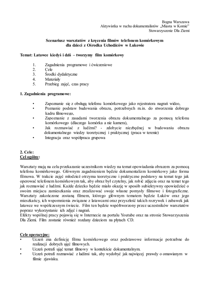 Bogna Warszawa Aktywistka w ruchu dokumentalistów „Miasta w Komie” Stowarzyszenie Dla Ziemi Scenariusz warsztatów z kręcenia filmów telefonem komórkowym dla dzieci z Ośrodka Uchodźców w Łukowie Temat: Latawce kiedyś i dziś – tworzymy film komórkowy 1. 2. 3. 4. 5. Zagadnienia programowe i ćwiczeniowe Cele Środki dydaktyczne Materiały Przebieg zajęć, czas pracy 1. Zagadnienia programowe: • • • • • Zapoznanie się z obsługą telefonu komórkowego jako rejestratora nagrań wideo, Poznanie podstaw budowania obrazu, potrzebnych m.in. do stworzenia dobrego kadru filmowego, Zapoznanie z zasadami tworzenia obrazu dokumentalnego za pomocą telefonu komórkowego (dlaczego komórka a nie kamera), Jak rozmawiać z ludźmi? - zdobycie niezbędnej w budowaniu obrazu dokumentalnego wiedzy teoretycznej i praktycznej (praca w terenie) Integracja oraz współpraca grupowa 2. Cele: Cel ogólny: Warsztaty mają na celu przekazanie uczestnikom wiedzy na temat opowiadania obrazem za pomocą telefonu komórkowego. Głównym zagadnieniem będzie dokumentalizm komórkowy jako forma filmowa. W trakcie zajęć młodzież otrzyma teoretyczne i praktyczne podstawy na temat tego jak operować telefonem komórkowym tak, aby obraz był czytelny, jak rob ić zdjęcia oraz na temat tego jak rozmawiać z ludźmi. Każde dziecko będzie miało okazję w sposób subiektywny opowiedzieć o swoim miejscu zamieszkania oraz zrealizować swoje własne pomysły filmowe i fotograficzne. Warsztaty zakończone zostaną filmem, którego głównym tematem będzie Łuków oraz jego mieszkańcy, ich wspomnienia związane z latawcami oraz przyszłość takich rozrywek i zabawek jak latawce we współczesnym świecie. Film ten będzie współtworzony przez uczestników warsztatów poprzez wykorzystanie ich zdjęć i nagrań. Efekty wspólnej pracy pojawią się w Internecie na portalu Youtube oraz na stronie Stowarzyszenia Dla Ziemi. Film zostanie również rozdany dzieciom na płytach CD. Cele operacyjne: • Uczeń zna definicję filmu komórkowego oraz podstawowe informacje potrzebne do realizacji dobrych ujęć filmowych. • Uczeń potrafi ująć temat filmowy w kontekście dokumentalnym. • Uczeń potrafi rozmawiać z ludźmi tak, aby wydobyć jak najwięcej prawdy o omawianym w filmie zjawisku. Cele wychowawcze: • • • • • Rozwijanie i stymulowanie wyobraźni twórczej, Pobudzanie kreatywnego oraz obrazowego myślenia, Otworzenie ucznia na otaczające go zjawiska, Pokazanie uczniowi potencjału osobistego widzenia świata, Rozwijanie ciekawości świata i przeniesienie tego na kreatywną pracę. 3. Środki dydaktyczne: • • Przykładowe filmy komórkowe wyświetlane na laptopie, 2 telefony komórkowe z możliwością nagrywania wideo. 4. Materiały: Praca nad filmem dokumentalnym nie będzie wymagała żadnych dodatkowych materiałów. Uczniowie będą pracować „na żywym organizmie” poprzez rozmowy z ludźmi na temat ich wspomnień związanych z latawcami oraz na temat przyszłości tego typu zabaw, rozrywek. 5. Przebieg zajęć: • • • • • • • Czynności porządkowo organizacyjne, Wprowadzenie w problematykę i temat lekcji: „Latawce kiedyś i dziś – tworzymy film komórkowy”, Wyjaśnienie pojęcia „film komórkowy”, opis działalności ruchu „ Miasta w Komie”, przedstawienie przykładów filmu komórkowego, Stworzenie wideo-wizytówek grupy, mających na celu wzajemne poznanie się oraz wstępne zobaczenie tego, do czego może służyć telefon komórkowy. Uczestnik warsztatów opowiada o sobie - o tym skąd jest i czym się zajmuje. Wypowiedź rejestrowana jest przez telefon komórkowy. Nagranie wykorzystane będzie w materiale końcowym z przebiegu warsztatów. Zapoznanie z wiedzą niezbędną do prawidłowego kadrowania obrazu, prostymi zabiegami uatrakcyjniającymi filmowanie, Wyjście w plener - filmowanie i fotografowanie Łukowa, nagrywanie ludzi w kontekście tematu zajęć. Zgrywanie nagranych materiałów na komputer, omówienie wybranych przykładów.