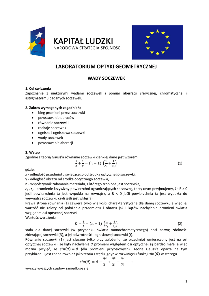 LABORATORIUM OPTYKI GEOMETRYCZNEJ WADY SOCZEWEK 1. Cel dwiczenia Zapoznanie z niektórymi wadami soczewek i pomiar aberracji sferycznej, chromatycznej i astygmatyzmu badanych soczewek. 2. Zakres wymaganych zagadnieo: bieg promieni przez soczewki powstawanie obrazów równanie soczewki rodzaje soczewek ognisko i ogniskowa soczewki wady soczewek powstawanie aberacji 3. Wstęp Zgodnie z teorią Gauss'a równanie soczewki cienkiej dane jest wzorem: (1) gdzie: x - odległośd przedmiotu świecącego od środka optycznego soczewki, y - odległośd obrazu od środka optycznego soczewki, n - współczynnik załamania materiału, z którego zrobiona jest soczewka, r1 , r2 - promienie krzywizny powierzchni ograniczających soczewkę, (przy czym przyjmujemy, że R > 0 jeśli powierzchnia ta jest wypukła na zewnątrz, a R < 0 jeśli powierzchnia ta jest wypukła do wewnątrz soczewki, czyli jeśli jest wklęsła). Prawa strona równania (1) zawiera tylko wielkości charakterystyczne dla danej soczewki, a więc jej wartośd nie zależy od położenia przedmiotu i obrazu jak i kątów nachylenia promieni światła względem osi optycznej soczewki. Wartośd wyrażenia (2) stała dla danej soczewki (w przypadku światła monochromatycznego) nosi nazwę zdolności zbierającej soczewki (D), a jej odwrotnośd - ogniskowej soczewki (f). Równanie soczewki (1) jest słuszne tylko przy założeniu, że przedmiot umieszczony jest na osi optycznej soczewki i że kąty nachylenia promieni względem osi optycznej są bardzo małe, a więc można przyjąd, że (dla promieni przyosiowych). Teoria Gauss'a oparta na tym przybliżeniu jest znana również jako teoria I rzędu, gdyż w rozwinięciu funkcji w szeregu wyrazy wyższych rzędów zaniedbuje się. 1 oś optyczna punkt świecący r1 f f‚ F O1 O2 F r2 obraz punktu Rys.1 Soczewka W praktycznych układach optycznych apertury są zwykle tak duże, że promienie przyosiowe stanowią zaledwie niewielką częśd promieni tworzących obraz (apertura-kąt zawarty między skrajnym promieniem wchodzącym np. do obiektywu, a osią optyczną jego soczewek, lub przesłona ograniczająca bieg promieni świetlnych w układzie. Dla soczewki aperturą jest jej oprawka). Dla promieni o dużych kątach nachylenia względem osi optycznej wzory wynikające z teorii Gauss'a (soczewka cienka) odbiegają od rzeczywistości - różnice te są miarą aberracji sferycznej i zniekształceo obrazów. Ludwig von Seidel rozwinął teorię Gauss`a, uwzględniając wyraz III-ego rzędu w rozwinięciu jak również promienie skośne (tzn. wychodzące z przedmiotu nie leżącego na osi optycznej soczewki). Teoria Seidel`a zwana również teorią III-ego rzędu rozszerza teorię Gauss`a dodając do niej 5 poprawkowych wyrażeo, które przyjmują wartości zerowe w przypadku, gdy rozważane promienie zachowują się tak samo jak promienie przyosiowe opisane równaniem (1). Jeśli jedno lub więcej z tych z tych wyrażeo różni się od zera, to mówimy, że promienie nie zachowują się zgodnie z teorią Gauss`a, lub że soczewka posiada wady – aberracje. Poprawkowe wyrażenia Seidel`a są podstawą do klasyfikacji pięciu aberracji III-ego rzędu. Są nimi: 1. aberracja sferyczna, 2. koma, 3. astygmatyzm, 4. krzywizna obrazu, 5. dystorsja Wymienione wyżej wady soczewek dotyczą światła monochromatycznego. Przy użyciu światła białego, z powodu dyspersji szkła, z którego zrobiona jest soczewka, pojawiają się dodatkowo dwie aberracje: aberracja chromatyczna podłużna i poprzeczna. Teoretycznie problem tworzenia obrazu pozbawionego aberracji wprowadzonych przez dany układ optyczny polega na dobraniu promieni krzywizny w taki sposób, aby każde z pięciu wyrażeo Seidel`a było równe zeru. W praktyce te poprawkowe równania Seidel`a są mało przydatne, ponieważ żaden układ optyczny nie zawiera dostatecznej liczby powierzchni załamujących, aby zapewnid znikanie wszystkich pięciu wyrażeo. Układy optyczne mają na celu wyeliminowanie lub przynajmniej zredukowanie do minimum omawianych wad. 4. Wady soczewek Aberracja sferyczna Układ optyczny (lub pojedyncza soczewka) posiada aberrację sferyczną, jeżeli pierwsze poprawkowe wyrażenie Seidel`a jest różne od zera. Fizycznie oznacza to, że wiązka promieni wychodzących z punktowego przedmiotu znajdującego się na osi optycznej, po przejściu przez soczewkę nie zachowuje się zgodnie z teorią I rzędu - promienie nie przecinają się ponownie w jednym punkcie obrazu. 2 Promienie skrajne (duże ), przechodzące przez zewnętrzną strefę soczewki skupiają się w punkcie leżącym bliżej soczewki niż promienie przyosiowe (małe ), przechodzące przez środek soczewki (Rys.2). Rys.2 Powstawanie aberracji sferycznej Miarą podłużnej aberracji sferycznej danej strefy soczewki jest odległośd mierzona wzdłuż osi optycznej pomiędzy punktem przecięcia promieni, które przeszły przez badaną strefę soczewki, a punktem przecięcia promieni przyosiowych. Podłużna aberracja sferyczna zmienia się w przybliżeniu proporcjonalnie do kwadratu promienia h strefy soczewki, przez którą przechodzi światło: (3) Podłużna aberracja sferyczna zależy również od odległości przedmiotu od soczewki x i z tego względu dla jednoznaczności określenia umawiamy się, że wyznacza się ją dla przedmiotu umieszczonego w bardzo dużej odległości od soczewki (x/h >> 1). Pomijając obliczenia teoretyczne, można podad relację określającą podłużną aberrację sferyczną dla soczewki płasko-wypukłej, na którą pada równoległa wiązka światła (4) gdzie: n jest współczynnikiem załamania światła materiału soczewki, f0 - ogniskową soczewki dla promieni przyosiowych ( ). Duża odległośd przedmiotu od soczewki (wiązka padająca na soczewkę jest prawie równoległa) sprawia, że umowną miarą aberracji podłużnej danej strefy jest różnica między ogniskowymi dla promieni przyosiowych i promieni przechodząc