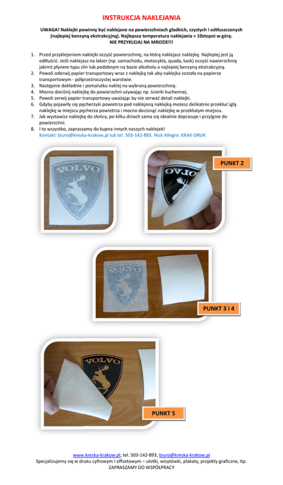 INSTRUKCJA NAKLEJANIA UWAGA! Naklejki powinny być naklejane na powierzchniach gładkich, czystych i odtłuszczonych (najlepiej benzyną ekstrakcyjną). Najlepsza temperatura naklejania + 10stopni w górę. NIE PRZYKLEJAJ NA MROZIE!!! 1. Przed przyklejeniem naklejki oczyść powierzchnię, na którą naklejasz naklejkę. Najlepiej jest ją odtłuścić. Jeśli naklejasz na lakier (np. samochodu, motocykla, quada, kask) oczyść nawierzchnię jakimś płynem typu clin lub podobnym na bazie alkoholu a najlepiej benzyną ekstrakcyjną. 2. Powoli oderwij papier transportowy wraz z naklejką tak aby naklejka została na papierze transportowym - półprzeźroczystej warstwie. 3. Następnie dokładnie i pomalutku naklej na wybraną powierzchnię. 4. Mocno dociśnij naklejkę do powierzchni używając np. ścierki kuchennej. 5. Powoli zerwij papier transportowy uważając by nie zerwać detali naklejki. 6. Gdyby pojawiły się pęcherzyki powietrza pod naklejoną naklejką możesz delikatnie przekłuć igłą naklejkę w miejscu pęcherza powietrza i mocno docisnąć naklejkę w przekłutym miejscu. 7. Jak wystawisz naklejkę do słońca, po kilku dniach sama się idealnie doprasuje i przylgnie do powierzchni. 8. I to wszystko, zapraszamy do kupna innych naszych naklejek! Kontakt: [email protected] lub tel. 503-142-893. Nick Allegro: KRAK-DRUK PUNKT 2 PUNKT 3 i 4 PUNKT 5 www.kreska-krakow.pl, tel. 503-142-893, [email protected] Specjalizujemy się w druku cyfrowym I offsetowym – ulotki, wizytówki, plakaty, projekty graficzne, itp. ZAPRASZAMY DO WSPÓŁPRACY