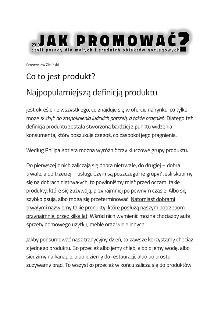 Przemysław Zieliński Co to jest produkt? Najpopularniejszą definicją produktu jest określenie wszystkiego, co znajduje się w ofercie na rynku, co tylko może służyć do zaspokojenia ludzkich potrzeb, a także pragnień. Dlatego też definicja produktu została stworzona bardziej z punktu widzenia konsumenta, który poszukuje czegoś, co zaspokoi jego pragnienia. Według Philipa Kotlera można wyróżnić trzy kluczowe grupy produktu. Do pierwszej z nich zaliczają się dobra nietrwałe, do drugiej – dobra trwałe, a do trzeciej – usługi. Czym są poszczególne grupy? Jeśli skupimy się na dobrach nietrwałych, to powinniśmy mieć przed oczami takie produkty, które się zużywają, przynajmniej po pewnym czasie. Albo się szybko psują, albo mogą się przeterminować. Natomiast dobrami trwałymi nazwiemy takie produkty, które posłużą naszym potrzebom przynajmniej przez kilka lat. Wśród nich wymienić można chociażby auta, sprzęty domowego użytku, meble oraz wiele innych. Jakby podsumować nasz tradycyjny dzień, to zawsze korzystamy chociaż z jednego produktu. Bo przecież albo jemy chleb, albo pijemy wodę, albo siedzimy na kanapie, albo idziemy do restauracji, albo po prostu zużywamy prąd. To wszystko przecież w końcu zalicza się do produktów. Trzecią grupą produktów są usługi. Czyli na przykład usługa kosmetyczna, fryzjerska, wybudowania domu itd. Produkty jednak możemy podzielić również pod względem sposobu ich nabywania. Produkty możemy nabywać okazyjnie, bez większego przemyślenia, w sklepie, a także możemy nabywać je w specjalny sposób. [1] Kotler P., Marketing. Analiza, planowanie, wdrażanie i kontrola., Gebethner i Ska, Warszawa 1994, s.7. [2] Kotler P., Marketing. Analiza, planowanie, wdrażanie i kontrola., Gebethner i Ska, Warszawa 1994, s. 404. [3] Kotler P., Marketing. Analiza, planowanie, wdrażanie i kontrola … s. 404. Jak oceniasz przydatność tego artykułu: Twoja Ocena: 4.7 ( ilość osób oddających głos: 9) Zobacz również inne ciekawe wpisy: 1. Jaki jest fundament produktu turystycznego, a czym jest produkt rzeczywisty? [6] 2. Czym jest produkt turystyczny? [5] 3. Jaka jest definicja turysty, turysta? [3] 4. Jakie podmioty biorą udział w rynku turystycznym? [8] 5. Co to jest turystyka? [2] Co to jest produkt – blog.perspektywa.it