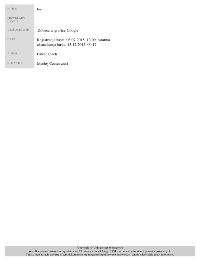 HASŁO bar PRZYKŁADY UŻYCIA WIZUALIZACJE Zobacz w grafice Google DATA Rejestracja hasła: 08.07.2015, 13.09, ostatnia aktualizacja hasła: 13.12.2015, 00.17 AUTOR Paweł Ciach REDAKTOR Maciej Czeszewski Copyright © Uniwersytet Warszawski Wszelkie prawa zastrzeżone zgodnie z art.17 ustawy z dnia 4 lutego 1994 r. o prawie autorskim i prawach pokrewnych. Teksty oraz zdjęcia zawarte w tym dokumencie nie mogą być publikowane bez wiedzy i zgody właściciela praw autorskich. Powered by TCPDF (www.tcpdf.org)