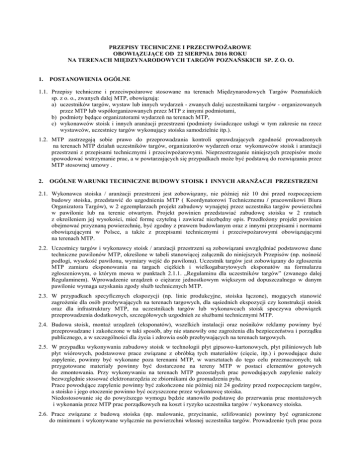 PRZEPISY TECHNICZNE I PRZECIWPOŻAROWE OBOWIĄZUJĄCE OD 22 SIERPNIA 2016 ROKU NA TERENACH MIĘDZYNARODOWYCH TARGÓW POZNAŃSKICH SP. Z O. O. 1. POSTANOWIENIA OGÓLNE 1.1. Przepisy techniczne i przeciwpożarowe stosowane na terenach Międzynarodowych Targów Poznańskich sp. z o. o., zwanych dalej MTP, obowiązują: a) uczestników targów, wystaw lub innych wydarzeń - zwanych dalej uczestnikami targów - organizowanych przez MTP lub współorganizowanych przez MTP z innymi podmiotami, b) podmioty będące organizatorami wydarzeń na terenach MTP, c) wykonawców stoisk i innych aranżacji przestrzeni (podmioty świadczące usługi w tym zakresie na rzecz wystawców, uczestnicy targów wykonujący stoiska samodzielnie itp.). 1.2. MTP zastrzegają sobie prawo do przeprowadzania kontroli sprawdzających zgodność prowadzonych na terenach MTP działań uczestników targów, organizatorów wydarzeń oraz wykonawców stoisk i aranżacji przestrzeni z przepisami technicznymi i przeciwpożarowymi. Nieprzestrzeganie niniejszych przepisów może spowodować wstrzymanie prac, a w powtarzających się przypadkach może być podstawą do rozwiązania przez MTP stosownej umowy . 2. OGÓLNE WARUNKI TECHNICZNE BUDOWY STOISK I INNYCH ARANŻACJI PRZESTRZENI 2.1. Wykonawca stoiska / aranżacji przestrzeni jest zobowiązany, nie później niż 10 dni przed rozpoczęciem budowy stoiska, przedstawić do uzgodnienia MTP ( Koordynatorowi Technicznemu / pracownikowi Biura Organizatora Targów), w 2 egzemplarzach projekt zabudowy wynajętej przez uczestnika targów powierzchni w pawilonie lub na terenie otwartym. Projekt powinien przedstawiać zabudowę stoiska w 2 rzutach z określeniem jej wysokości, mieć formę czytelną i zawierać niezbędny opis. Przedłożony projekt powinien obejmować przyznaną powierzchnię, być zgodny z prawem budowlanym oraz z innymi przepisami i normami obowiązującymi w Polsce, a także z przepisami technicznymi i przeciwpożarowymi obowiązującymi na terenach MTP. 2.2. Uczestnicy targów i wykonawcy stoisk / aranżacji przestrzeni są zobowiązani uwzględniać podstawowe dane techniczne pawilonów MTP, określone w tabeli stanowiącej załącznik do niniejszych Przepisów (np. nośność podłogi, wysokość pawilonu, wymiary wejść do pawilonu). Uczestnik targów jest zobowiązany do zgłoszenia MTP zamiaru eksponowania na targach ciężkich i wielkogabarytowych eksponatów na formularzu zgłoszeniowym, o którym mowa w punktach 2.1.1. „Regulaminu dla uczestników targów” (zwanego dalej Regulaminem). Wprowadzenie urządzeń o ciężarze jednostkowym większym od dopuszczalnego w danym pawilonie wymaga uzyskania zgody służb technicznych MTP. 2.3. W przypadkach specyficznych ekspozycji (np. linie produkcyjne, stoiska łączone), mogących stanowić zagrożenie dla osób przebywających na terenach targowych, dla sąsiednich ekspozycji czy konstrukcji stoisk oraz dla infrastruktury MTP, na uczestnikach targów lub wykonawcach stoisk spoczywa obowiązek przeprowadzenia dodatkowych, szczegółowych uzgodnień ze służbami technicznymi MTP. 2.4. Budowa stoisk, montaż urządzeń (eksponatów), wszelkich instalacji oraz nośników reklamy powinny być przeprowadzane i zakończone w taki sposób, aby nie stanowiły one zagrożenia dla bezpieczeństwa i porządku publicznego, a w szczególności dla życia i zdrowia osób przebywających na terenach targowych. 2.5. W przypadku wykonywania zabudowy stoisk w technologii płyt gipsowo-kartonowych, płyt pilśniowych lub płyt wiórowych, podstawowe prace związane z obróbką tych materiałów (cięcie, itp.) i powodujące duże zapylenie, powinny być wykonane poza terenami MTP, w warsztatach do tego celu przeznaczonych; tak przygotowane materiały powinny być dostarczone na tereny MTP w postaci elementów gotowych do zmontowania. Przy wykonywaniu na terenach MTP pozostałych prac powodujących zapylenie należy bezwzględnie stosować elektronarzędzia ze zbiornikami do gromadzenia pyłu. Prace powodujące zapylenie powinny być zakończone nie później niż 24 godziny przed rozpoczęciem targów, a stoisko i jego otoczenie powinno być oczyszczone przez wykonawcę stoiska. Niedostosowanie się do powyższego wymogu będzie stanowiło podstawę do przerwania prac montażowych i wykonania przez MTP prac porządkowych na koszt i ryzyko uczestnika targów / wykonawcy stoiska. 2.6. Prace związane z budową stoiska (np. malowanie, przycinanie, szlifowanie) powinny być ograniczone do minimum i wykonywane wyłącznie na powierzchni własnej uczestnika targów. Prowadzenie tych prac poza obrębem własnego stoiska wymaga uzgodnień z MTP ( Koordynatorem Technicznym / pracownikiem Biura Organizatora Targów). 2.7. Ściany stoiska i inne elementy konstrukcyjne na granicy stoiska o wysokości powyżej 2,5 m zwrócone w stronę stoisk sąsiednich oraz widoczne tylne ściany stoisk (np. na antresolach) należy wykończyć neutralnie (w kolorze białym). Dopuszcza się możliwość umieszczenia reklam w odległości 1,0 m od granicy sąsiedniego stoiska. 2.8. Jeżeli wynajęta powierzchnia nie zostanie, w związku z zabudową i aranżacją stoiska, całkowicie wykorzystana, to uczestnik targów odpowiada za zagospodarowanie pustych i widocznych płaszczyzn graniczących z sąsiednimi stoiskami lub skierowanych na ciągi komunikacyjne. 2.9. Wykonawca stoiska jest zobowiązany do pozostawienia swobodnego dostępu do urządzeń technicznych MTP (np. rozdzielni elektrycznych, zaworów wodociągowych, głowic telefonicznych) dla służb eksploatacyjnych MTP. 2.10.Każdy uczestnik targów, jeżeli zachodzi taka konieczność, powinien umożliwić przeprowadzenie przez własne stoisko instalacji stoisk sąsiednich w celu ich podłączenia do urządzeń technicznych MTP, o których mowa powyżej. 2.11.Zaleca się wyłożenie posadzki w obrębie stoiska wykładziną podłogową. 2.12.Zamknięta obudowa stoiska (ścianki działowe szczelne, p