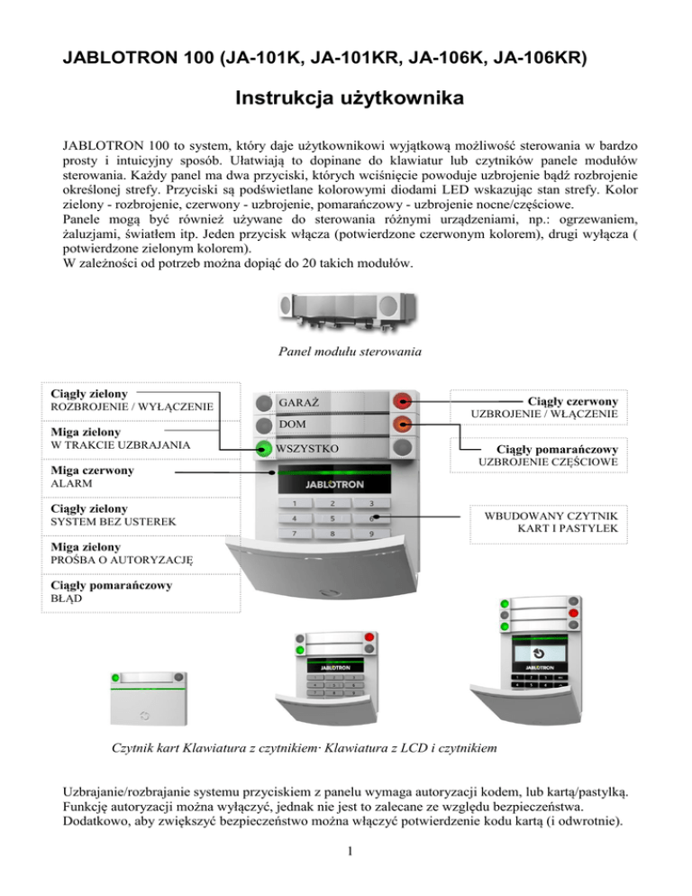 JABLOTRON 100 (JA-101K, JA-101KR, JA-106K, JA-106KR) Instrukcja użytkownika JABLOTRON 100 to system, który daje użytkownikowi wyjątkową możliwość sterowania w bardzo prosty i intuicyjny sposób. Ułatwiają to dopinane do klawiatur lub czytników panele modułów sterowania. Każdy panel ma dwa przyciski, których wciśnięcie powoduje uzbrojenie bądź rozbrojenie określonej strefy. Przyciski są podświetlane kolorowymi diodami LED wskazując stan strefy. Kolor zielony - rozbrojenie, czerwony - uzbrojenie, pomarańczowy - uzbrojenie nocne/częściowe. Panele mogą być również używane do sterowania różnymi urządzeniami, np.: ogrzewaniem, żaluzjami, światłem itp. Jeden przycisk włącza (potwierdzone czerwonym kolorem), drugi wyłącza ( potwierdzone zielonym kolorem). W zależności od potrzeb można dopiąć do 20 takich modułów. Panel modułu sterowania Ciągły zielony ROZBROJENIE / WYŁĄCZENIE Miga zielony W TRAKCIE UZBRAJANIA Ciągły czerwony GARAŻ UZBROJENIE / WŁĄCZENIE DOM Ciągły pomarańczowy WSZYSTKO UZBROJENIE CZĘŚCIOWE Miga czerwony ALARM Ciągły zielony WBUDOWANY CZYTNIK KART I PASTYLEK SYSTEM BEZ USTEREK Miga zielony PROŚBA O AUTORYZACJĘ Ciągły pomarańczowy BŁĄD Czytnik kart Klawiatura z czytnikiem· Klawiatura z LCD i czytnikiem Uzbrajanie/rozbrajanie systemu przyciskiem z panelu wymaga autoryzacji kodem, lub kartą/pastylką. Funkcję autoryzacji można wyłączyć, jednak nie jest to zalecane ze względu bezpieczeństwa. Dodatkowo, aby zwiększyć bezpieczeństwo można włączyć potwierdzenie kodu kartą (i odwrotnie). 1 Dla wygody użytkownika istnieje możliwość dowolnego przypisania paneli modułów do stref i autoryzacji lub jej braku dla każdej z nich, oraz przypisania wybranego modułu do uzbrajania grupowego stref, lub całości. Sterowanie bez autoryzacji zalecane jest dla załączania i wyłączania urządzeń (sterowania wyjść programowalnych) ze względu na komfort sterowania nimi. Kody w systemie JA-100 mogą mieć maksymalnie 8 znaków. Obejmuje on prefix (nr. użytkownika oraz znak gwiazdki *) + czterocyfrowy kod. Przykład: 137*8729. Kody można uprościć wyłączając prefix, ale nie jest to zalecane przy dużej ilości użytkowników. Stosujemy wówczas tylko sam 4-ro cyfrowy kod. UZBROJENIE PRZYCIŚNIJ AUTORYZUJ WYKONANIE POVEL Chcę uzbroić: Autoryzuję: Uzbrojenie wykonane: Naciskam odpowiedni przycisk wybranego modułu. Zaczyna migać na czerwono... Przykładam kartę/pastylkę lub wpisuję kod... Klawiatura akustycznie sygnalizuje czas na wyjście. Ciągłe świecenie czerwonej diody LED oznacza uzbrojenie systemu. 2 ROZBROJENIE PRZYCIŚNIJ AUTORYZUJ WYKONANIE POVEL POVEL POVEL Chcę rozbroić: Autoryzuję: Rozbrojenie wykonane: Kiedy wchodzę do budynku, system zaczyna odliczać czas na wejście? Sygnalizowane jest to akustycznie (powtarzający się dźwięk "pik pik pik .....) oraz optycznie miganiem zielonej diody LED w przycisku. Przyciskam mrugający przycisk.... Przykładam kartę/pastylkę lub wpisuję kod... Zielony LED świeci ciągłym światłem. CZĘŚCIOWE/NOCNE UZBROJENIE Jeśli funkcja częściowego/nocnego uzbrojenia jest włączona, mamy możliwość ochrony poprzez wybrane czujki np., jeżeli idziemy spać uzbrajamy tylko czujki otwarcia okien i drzwi, podczas gdy czujki ruchu nie są aktywne. PRZYCIŚNIJ AUTORYZUJ WYKONANIE POVEL POVEL POVEL Chcę uzbroić częściowo: Autoryzuję: Naciskam przycisk strefy, którą chcę uzbroić. Zaczyna migać na pomarańczowo... Przykładam kartę/pastylkę lub wpisuję kod... 3 Uzbrojenie częściowe wykonane: Pomarańczowy LED świeci ciągłym światłem. Jeżeli chcemy uzbroić strefę całkowicie (np. przy wyjściu z domu), to należy wcisnąć przycisk dwukrotnie. Przy pierwszym wciśnięciu LED zacznie mrugać na pomarańczowo. Wciśnięcie drugi raz spowoduje mruganie LED na czerwono. Po autoryzacji, (jeżeli wymagana) system jest całkowicie uzbrojony, a dioda LED będzie świecić ciągłym czerwonym światłem. Jeżeli system jest już częściowo uzbrojony, a chcemy go uzbroić całkowicie, to należy wcisnąć przycisk podświetlony na pomarańczowo i potwierdzić kodem lub kartą, (jeśli wymagana autoryzacja). ODWOŁANIE ALARMU PRZYCIŚNIJ AUTORYZUJ WYKONANIE POVEL POVEL POVEL Jeżeli wystąpi alarm, to miga czerwona dioda LED segmentu odpowiadającemu strefie, w której wystąpił alarm, oraz czerwona LED na klawiaturze. Alarm odwołujemy poprzez rozbrojenie stref, w których wystąpił. Po odwołaniu alarmu czerwony LED miga - jest to pamięć alarmu. Kasujemy ją ponownym wciśnięciem przycisku. 4 INNE METODY STEROWANIA- pilotem, z telefonu, przez Internet Sterowanie pilotem Funkcje pilota zobrazowane są poprzez obrazek na przyciskach - kłódka otwarta (rozbrojenie) i zamknięta (uzbrojenie). Wciśnięcie dwóch przycisków jednocześnie powoduje wysłanie alarmu napadowego. Przyciski mogą być blokowane przed przypadkowym wciśnięciem np. przez dzieci. Więcej informacji w instrukcji pilota. Sterowanie systemem z klawiatury telefonu GSM System może być sterowany z telefonu komórkowego. Dzwoniąc do systemu łączymy się z menu głosowym, które ułatwia sterowanie. Po połączeniu system informuje o swoim statusie. Jeśli włączona jest funkcja dostępu dla nieautoryzowanych numerów to wymagane jest podanie kodu z klawiatury telefonu w celu zainicjalizowania połączenia. Istnieje możliwość włączenia funkcji dostępu tylko dla wybranych numerów telefonów. Jeśli w systemie wystąpił alarm to poinformuje nas o tym głosowo. Sterowanie poprzez SMS lub clip. Istnieje możliwość sterowania systemem z wykorzystaniem SMS-ów. Wysyłając SMS odpowiedniej treści możemy system uzbroić, rozbroić lub wysterować dowolne z jego wyjść (światło, ogrzewanie, żaluzje itp.) Komenda SMS fabrycznie musi być poprzedzona kodem użytkownika. Autoryzację kodem w SMS można wyłączyć, ale nie powinno sie tego robić ze