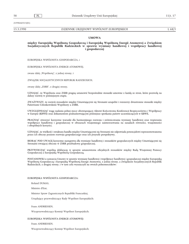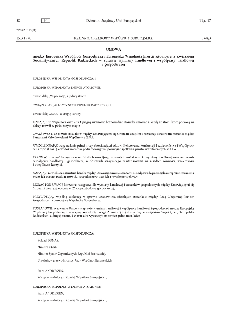 58 Dziennik Urzędowy Unii Europejskiej PL 11/t. 17 21990A0315(01) 15.3.1990 DZIENNIK URZĘDOWY WSPÓLNOT EUROPEJSKICH UMOWA między Europejską Wspólnotą Gospodarczą i Europejską Wspólnotą Energii Atomowej a Związkiem Socjalistycznych Republik Radzieckich w sprawie wymiany handlowej i współpracy handlowej i gospodarczej EUROPEJSKA WSPÓLNOTA GOSPODARCZA, i EUROPEJSKA WSPÓLNOTA ENERGII ATOMOWEJ, zwane dalej „Wspólnotą”, z jednej strony, i ZWIĄZEK SOCJALISTYCZNYCH REPUBLIK RADZIECKICH, zwany dalej „ZSRR”, z drugiej strony, UZNAJĄC, że Wspólnota oraz ZSRR pragną ustanowić bezpośrednie stosunki umowne z każdą ze stron, które pozwolą na dalszy rozwój w późniejszym etapie, ZWAŻYWSZY, że rozwój stosunków między Umawiającymi się Stronami uzupełni i rozszerzy dwustronne stosunki między Państwami Członkowskimi Wspólnoty a ZSRR, UWZGLĘDNIAJĄC wagę nadania pełnej mocy obowiązującej Aktowi Końcowemu Konferencji Bezpieczeństwa i Współpracy w Europie (KBWE) oraz dokumentom podsumowującym późniejsze spotkania państw uczestniczących w KBWE, PRAGNĄC stworzyć korzystne warunki dla harmonijnego rozwoju i zróżnicowania wymiany handlowej oraz wspierania współpracy handlowej i gospodarczej w obszarach wzajemnego zainteresowania na zasadach równości, wzajemności i obopólnych korzyści, UZNAJĄC, że wielkość i struktura handlu między Umawiającymi się Stronami nie odpowiada potencjałowi reprezentowanemu przez ich obecny poziom rozwoju gospodarczego oraz ich przyszłe perspektywy, BIORĄC POD UWAGĘ korzystne następstwa dla wymiany handlowej i stosunków gospodarczych między Umawiającymi się Stronami trwającej obecnie w ZSRR przebudowy gospodarczej, PRZYWOŁUJĄC wspólną deklarację w sprawie ustanowienia oficjalnych stosunków między Radą Wzajemnej Pomocy Gospodarczej a Europejską Wspólnotą Gospodarczą, POSTANOWILI o zawarciu Umowy w sprawie wymiany handlowej i współpracy handlowej i gospodarczej między Europejską Wspólnotą Gospodarczą i Europejską Wspólnotą Energii Atomowej, z jednej strony, a Związkiem Socjalistycznych Republik Radzieckich, z drugiej strony, i w tym celu wyznaczyli na swoich pełnomocników: EUROPEJSKA WSPÓLNOTA GOSPODARCZA: Roland DUMAS, Ministre d’Etat, Minister Spraw Zagranicznych Republiki Francuskiej, Urzędujący przewodniczący Rady Wspólnot Europejskich; Frans ANDRIESSEN, Wiceprzewodniczący Komisji Wspólnot Europejskich; EUROPEJSKA WSPÓLNOTA ENERGII ATOMOWEJ: Frans ANDRIESSEN, Wiceprzewodniczący Komisji Wspólnot Europejskich; L 68/3 11/t. 17 Dziennik Urzędowy Unii Europejskiej PL 59 ZWIĄZEK SOCJALISTYCZNYCH REPUBLIK RADZIECKICH, Eduard SHEVARDNADZE, Minister Spraw Zagranicznych Związku Socjalistycznych Republik Radzieckich; KTÓRZY, po wymianie swych pełnomocnictw, uznanych za należyte i sporządzone we właściwej formie, UZGODNILI, CO NASTĘPUJE: TYTUŁ I Ogólne — podatków oraz innych opłat wewnętrznych wszelkiego rodzaju stosowanych bezpośrednio lub pośrednio w odniesieniu do towarów przywożonych, — sposobów płatności i transferu takich płatności, Artykuł 1 W ramach swoich odpowiednich przepisów ustawowych i wykonawczych Umawiające się Strony dołożą najlepszych starań, aby ułatwić i wspierać — harmonijny rozwój i zróżnicowanie swoich stosunków handlowych, oraz — rozwój różnych form współpracy handlowej i gospodarczej. W tym celu potwierdzają one, iż postanowiły o przychylnym ustosunkowaniu się, każda ze swojej strony, do propozycji drugiej Strony, mając na względzie osiągnięcie tych celów. TYTUŁ II Współpraca handlowa i gospodarcza Artykuł 2 1. Niniejsza Umowa ma zastosowanie do handlu wszystkimi towarami pochodzącymi ze Wspólnoty lub z ZSRR, z wyjątkiem produktów objętych Traktatem ustanawiającym Europejską Wspólnotę Węgla i Stali. 2. Niniejsza Umowa nie zmienia postanowień Umowy między Europejską Wspólnotą Gospodarczą a ZSRR w sprawie handlu wyrobami włókienniczymi, parafowanej dnia 11 grudnia 1989 roku oraz stosowanej tymczasowo od dnia 1 stycznia 1990 roku, ani postanowień jakiejkolwiek wymiany listów, ani jakichkolwiek innych porozumień zawartych w związku z tym, a także jakichkolwiek porozumień w sprawie handlu wyrobami włókienniczymi zawartych następnie, przez okres obowiązywania tych postanowień. — postanowień dotyczących sprzedaży, nabycia, transportu, dystrybucji i użytkowania towarów na rynku krajowym. 2. Postanowienia ustępu 1 nie stosuje się do: a) przywilejów przyznanych w celu utworzenia unii celnej lub strefy wolnego handlu lub wynikających z utworzenia takiej unii lub strefy; b) przywilejów przyznanych poszczególnym krajom zgodnie z Układem Ogólnym w sprawie Taryf Celnych i Handlu oraz na mocy innych umów międzynarodowych na rzecz krajów rozwijających się; c) korzyści przyznanych krajom sąsiadującym w celu ułatwienia handlu w strefie przygranicznej. Artykuł 4 Umawiające się Strony zobowiązują się do przyznawania zwolnień celnych, podatkowych oraz z innych opłat, a także do przyznawania pozwoleń w odniesieniu do towarów znajdujących się czasowo na ich terytoriach w celu ich powrotnego wywozu zarówno w stanie niezmienionym, jak i po przeprowadzeniu uszlachetniania czynnego. Artykuł 5 W odniesieniu do przywozu towarów pochodzących ze Wspólnoty ZSRR przyznaje traktowanie niedyskryminacyjne w zakresie stosowania ograniczeń ilościowych, przyznawania pozwoleń oraz przydziału środków walutowych niezbędnych do dokonywania płatności za taki przywóz. Artykuł 6 Artykuł 3 1. Umawiające się Strony przyznają sobie traktowanie oparte na klauzuli największego uprzywilejowania we wszystkich zakresach w odniesieniu do: — należności celnych i opłat stosowanych w przywozie i wywozie, włączając sposób pobierania takich należności celnych i opłat, — postanowień dotyczących odprawy celnej, tranzytu, składowania i przeł