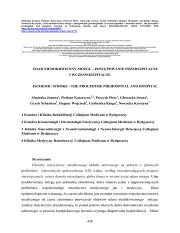 Siminska Joanna, Pietkun Katarzyna, Porzych Piotr, Głowacka Iwona, Grzyb Sebastian, Hagner Wojciech, Grobelska Kinga, Nowacka Krystyna. Udar niedokrwienny mózgu - postępowanie przedszpitalne i wczesnoszpitalne = Ischemic stroke - the procedure prehospital and hospital. Journal of Education, Health and Sport. 2016;6(8):439-453. eISSN 2391-8306. DOI http://dx.doi.org/10.5281/zenodo.60875 http://ojs.ukw.edu.pl/index.php/johs/article/view/3779 The journal has had 7 points in Ministry of Science and Higher Education parametric evaluation. Part B item 755 (23.12.2015). 755 Journal of Education, Health and Sport eISSN 2391-8306 7 © The Author (s) 2016; This article is published with open access at Licensee Open Journal Systems of Kazimierz Wielki University in Bydgoszcz, Poland Open Access. This article is distributed under the terms of the Creative Commons Attribution Noncommercial License which permits any noncommercial use, distribution, and reproduction in any medium, provided the original author(s) and source are credited. This is an open access article licensed under the terms of the Creative Commons Attribution Non Commercial License (http://creativecommons.org/licenses/by-nc/4.0/) which permits unrestricted, non commercial use, distribution and reproduction in any medium, provided the work is properly cited. This is an open access article licensed under the terms of the Creative Commons Attribution Non Commercial License (http://creativecommons.org/licenses/by-nc/4.0/) which permits unrestricted, non commercial use, distribution and reproduction in any medium, provided the work is properly cited. The authors declare that there is no conflict of interests regarding the publication of this paper. Received: 01.08.2016. Revised 08.08.2016. Accepted: 19.08.2016. UDAR NIEDOKRWIENNY MÓZGU - POSTĘPOWANIE PRZEDSZPITALNE I WCZESNOSZPITALNE ISCHEMIC STROKE - THE PROCEDURE PREHOSPITAL AND HOSPITAL Siminska Joanna1, Pietkun Katarzyna1,2, Porzych Piotr1, Głowacka Iwona1, Grzyb Sebastian3, Hagner Wojciech1, Grobelska Kinga4, Nowacka Krystyna1 1 Katedra i Klinika Rehabilitacji Collegium Medicum w Bydgoszczy 2 Katedra Kosmetologii i Dermatologii Estetycznej Collegium Medicum w Bydgoszczy 3 Klinika Neurochirurgii i Neurotraumatologii i Neurochirurgii Dziecięcej Collegium Medicum w Bydgoszczy 4 Klinika Medycyny Ratunkowej Collegium Medicum w Bydgoszczy Streszczenie Choroby naczyniowe ośrodkowego układu nerwowego są jednym z głównych problemów zdrowotnych społeczeństwa XXI wieku, według niezadowalających prognoz statystycznych szósty dorosły mieszkaniec globu dozna w swoim życiu udaru mózgu. Udar niedokrwienny mózgu jest jednostką chorobową, która stanowi jeden z najpoważniejszych problemów współczesnego ratownictwa medycznego jak i medycyny. Dane epidemiologiczne wskazują, że często odwlekany jest moment wezwania zespołu ratownictwa medycznego od czasu zaistnienia pierwszych objawów udaru niedokrwiennego mózgu. Analizy statystyczne przedstawiają, że ponad połowa chorych, która doświadczyła incydentu udarowego, w procesie kompleksowego leczenia wymaga długotrwałej hospitalizacji. Mimo 439 dużego rozwoju jaki dokonał się w medycynie, nadal konieczne jest rozszerzenie wiedzy na temat symptomów i leczenia udarów niedokrwiennych mózgu. Wiedza ta przyczyni się do zmniejszenia śmiertelności pacjentów jak również do szybszego podjęcia odpowiedniego leczenia. Słowa kluczowe: udar niedokrwienny mózgu, medycyna ratunkowa, postępowanie ratunkowe. Summary Vascular diseases of the central nervous system is one of the major health problems of society XXI century, according to statistical forecasts disappointing sixth adult inhabitant of the globe will experience in your life stroke. Ischemic stroke is a disease that is one of the most serious problems of modern medical rescue as and medicine. Epidemiological data indicate that often delayed the moment of the call emergency medical team since the occurrence of the first symptoms of stroke. Statistical analyzes show that more than half of the patients who experienced an incident of impact, in the process of a comprehensive treatment requires prolonged hospitalization. Despite the large development that has taken place in medicine, it is still necessary to increase knowledge about the symptoms and treatment of ischemic stroke. This knowledge will help to reduce mortality of patients as well as to quickly take appropriate treatment. Keywords: ischemic stroke, emergency medicine, emergency procedures. Wystąpienie ostrego incydent mózgowo-naczyniowy jest zawsze stanem bezpośredniego zagrożenia życia, bez względu na stopień nasilenia występujących objawów klinicznych. Udar mózgu niezależnie czy krwotoczny czy też niedokrwienny to proces, który ma dynamiczny przebieg i stabilizacja stanu chorego następuje dopiero po 4–5 dobach od czasu wystąpienia incydentu chorobowego. W początkowej fazie zachorowania, zaobserwować można słabo nasilone objawy deficytu neurologicznego. Jednak objawy te mogą ulec gwałtownej progresji w kolejnych godzinach lub też dniach trwania incydentu chorobowego. Występujące w leczeniu udaru niedokrwiennego mózgu okno terapeutyczne jest wąskie. Sformułowanie to oznacza, iż optymalny czas na pojecie decyzji o włączeniu leczenia trombolitycznego obejmuje pierwsze 4,5 godziny od momentu wystąpienia objawów choroby. Dlatego tak ważne jest szybkie i prawidłowe rozpoznanie objawów chorobowych, 440 szybkość udzielenia pomocy medycznej. Czynniki te są jednym z najważniejszych ogniw łańcucha przeżycia i rokowania pacjenta po udarze mózgu jak i jego późniejszej sprawności funkcjonalnej. Najlepiej sytuację tę obrazuje sformułowanie : „Czas to mózg”. Niezwykle istotnym elementem przeżycia pacjenta jest szybkie rozpoznanie objawów i niezwłoczne podjęcie aktywnego działania ratunkowego. [10] Tabela 2. Typowe objawy udaru mózgu [4] Objaw Asymetria twar