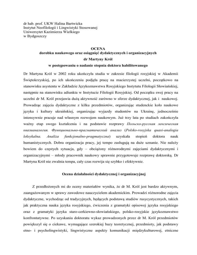 dr hab. prof. UKW Halina Bartwicka Instytut Neofilologii i Lingwistyki Stosowanej Uniwersytet Kazimierza Wielkiego w Bydgoszczy OCENA dorobku naukowego oraz osiągnięć dydaktycznych i organizacyjnych dr Martyny Król w postępowaniu o nadanie stopnia doktora habilitowanego Dr Martyna Król w 2002 roku ukończyła studia w zakresie filologii rosyjskiej w Akademii Świętokrzyskiej, po ich ukończeniu podjęła pracę na macierzystej uczelni, początkowo na stanowisku asystenta w Zakładzie Językoznawstwa Rosyjskiego Instytutu Filologii Słowiańskiej, następnie na stanowisku adiunkta w Instytucie Filologii Rosyjskiej. Od początku swej pracy na uczelni dr M. Król przejawia dużą aktywność zarówno w sferze dydaktycznej, jak i naukowej. Prowadząc zajęcia dydaktyczne z kilku przedmiotów, organizując studenckie koło naukowe języka i kultury ukraińskiej, organizując wyjazdy studentów na Ukrainę, jednocześnie intensywnie pracuje nad własnym rozwojem naukowym. Już trzy lata po studiach zakończyła ważny etap swego kształcenia i na podstawie rozprawy Польско-русская лексическая квазианалогия. Функционально-прагматический анализ (Polsko-rosyjska quasi-analogia leksykalna. Analiza funkcjonalno-pragmatyczna) uzyskała stopień doktora nauk humanistycznych. Dobra organizacja pracy, jej tempo zasługują na duże uznanie. Nie należy bowiem do częstych sytuacja, gdy – obciążony różnorodnymi zajęciami dydaktycznymi i organizacyjnymi – młody pracownik naukowy sprawnie przygotowuje rozprawę doktorską. Dr Martyna Król nie zwalnia tempa, cały czas rozwija się szybko i efektywnie. Ocena działalności dydaktycznej i organizacyjnej Z przedłożonych mi do oceny materiałów wynika, że dr M. Król jest bardzo aktywnym, zaangażowanym w sprawy zawodowe nauczycielem akademickim. Prowadzi różnorodne zajęcia dydaktyczne, wychodząc od tradycyjnych, będących podstawą studiów rusycystycznych, takich jak praktyczna nauka języka rosyjskiego, ćwiczenia z gramatyki opisowej języka rosyjskiego oraz z gramatyki języka staro-cerkiewno-słowiańskiego, polsko-rosyjskie językoznawstwo konfrontatywne. Po uzyskaniu doktoratu wykaz prowadzonych przez dr M. Król przedmiotów powiększył się o ciekawe, wymagające szerokiej bazy teoretycznej, przedmioty, jak podstawy etno- i psycholingwistyki, lingwistyczne aspekty komunikacji międzykulturowej, etniczne podstawy językowego obrazu świata, lingwistyka tekstu. Przegląd publikacji Habilitantki pokazuje, że w jej działalności naukowo-dydaktycznej widoczna jest głęboka korelacja między badaniami naukowymi i nauczanymi przedmiotami. Moja uwaga brzmi dość banalnie, jednak wyrażam ją świadomie, gdyż chcę szczególnie podkreślić wielką wartość poszerzania i pogłębiania oferty programowej dla studentów poprzez włączanie atrakcyjnego materiału zweryfikowanego podczas własnych badań. Wszak wiadomo, że pasja wykładowcy pobudza zainteresowania i zapał studentów. Imponująco przedstawia się działalność dr M. Król w zakresie opieki naukowej i popularyzacji nauki. Pod jej kierunkiem przygotowano 73 prace licencjackie, ponadto była promotorem pomocniczym podczas przygotowania jednej rozprawy doktorskiej, obronionej na Wydziale Humanistycznym Uniwersytetu Jana Kochanowskiego w Kielcach. Inna forma, zasługującej na uznanie działalności, to opracowywanie planów studiów, programów nauczania, wniosków związanych z uruchomieniem nowego kierunku studiów, nowej specjalności czy formy nauczania (rosjoznawstwo: wniosek o uruchomienie kierunku, następnie (wraz z zespołem) opracowanie planu studiów tego kierunku, studia podyplomowe język rosyjski w turystyce, edukacja wczesnoszkolna i przedszkolna z nauczaniem języka rosyjskiego). Dr Król wychodzi w tych działaniach poza swój Instytut, gdyż poszczególne programy opracowała także dla Instytutu Historii oraz dla kierunku pedagogika. Bardzo pozytywnie oceniam udział w ważnym projekcie współfinansowanym przez Unię Europejską w ramach Europejskiego Funduszu Społecznego Kompetentny Nauczyciel Inwestycją w Przyszłość „Kapitał ludzki. Nowa Strategia Spójności” w funkcji koordynatora ds. specjalności edukacja wczesnoszkolna i przedszkolna z nauczaniem języka rosyjskiego „Kompetentny nauczyciel wczesnej edukacji inwestycją w lepszą przyszłość” (w latach 2009-2013). Dr M. Król dwukrotnie brała udział w Ogólnowydziałowym seminarium interdyscyplinarnym dla studentów i pracowników naukowych im. profesora Andrzeja Wiercińskiego cyklicznie organizowanych przez Instytut Nauk Politycznych Wydziału Zarządzania i Administracji Uniwersytetu Jana Kochanowskiego, na których wystąpiła z referatami, wygłosiła także referaty na seminarium Zakładu Komunikacji Instytutu Filologii Polskiej Uniwersytetu Pedagogicznego w Krakowie oraz w Zakładzie Językoznawstwa Instytutu Filologii Obcych UJK w Kielcach. Dr Król była członkiem komitetu naukowego dwóch międzynarodowych konferencji naukowych organizowanych w Kielcach, jest członkiem Komisji Lingwistyki Dyskursu przy Międzynarodowym Komitecie Slawistów, członkiem Centrum Kultury Wschodniej w Kielcach , członkiem Towarzystwa Miłośników Języka Polskiego. Ocena dorobku i istotnej aktywności naukowej Dorobek naukowy Habilitantki obejmuje 34 pozycje (29 po doktoracie): dwie monografie (doktorat i książka habilitacyjna) oraz 32 artykuły i rozdziały w tomach zbiorowych. Są to prace o zróżnicowanym profilu tematycznym, publikowane w kraju i za granicą (w Rosji, na Ukrainie). Tezy większości z nich uprzednio były prezentowane na 26. konferencjach naukowych, zatem wiele publikacji (ponad 20) to materiały pokonferencyjne. Należy jednak podkreślić, że wśród artykułów są takie, które ogłoszono drukiem w czasopismach z wysoką punktacją. Publikacje Habilitantki wskazują na jej szerok