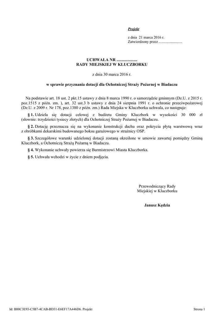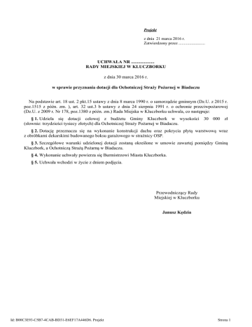 Projekt z dnia 21 marca 2016 r. Zatwierdzony przez ......................... UCHWAŁA NR .................... RADY MIEJSKIEJ W KLUCZBORKU z dnia 30 marca 2016 r. w sprawie przyznania dotacji dla Ochotniczej Straży Pożarnej w Biadaczu Na podstawie art. 18 ust. 2 pkt.15 ustawy z dnia 8 marca 1990 r. o samorządzie gminnym (Dz.U. z 2015 r. poz.1515 z późn. zm. ), art. 32 ust.3 b ustawy z dnia 24 sierpnia 1991 r. o ochronie przeciwpożarowej (Dz.U. z 2009 r. Nr 178, poz.1380 z późn. zm.) Rada Miejska w Kluczborku uchwala, co następuje: § 1. Udziela się dotacji celowej z budżetu Gminy Kluczbork w wysokości 30 000 zł (słownie: trzydzieści tysiecy złotych) dla Ochotniczej Straży Pożarnej w Biadaczu. § 2. Dotację przeznacza się na wykonanie konstrukcji dachu oraz pokrycia płytą warstwową wraz z obróbkami dekarskimi budowanego boksu garażowego w strażnicy OSP. § 3. Szczegółowe warunki udzielonej dotacji zostaną określone w umowie zawartej pomiędzy Gminą Kluczbork, a Ochotniczą Strażą Pożarną w Biadaczu. § 4. Wykonanie uchwały powierza się Burmistrzowi Miasta Kluczborka. § 5. Uchwała wchodzi w życie z dniem podjęcia. Przewodniczący Rady Miejskiej w Kluczborku Janusz Kędzia Id: B00C3E93-C5B7-4CAB-BD31-E6EF17A446D6. Projekt Strona 1 UZASADNIENIE Ochotnicza Straż Pożarna w Biadaczu w ramach dodatkowych zadań Krajowego Systemu Ratowniczo Gaśniczego związanych z ratownictwem wodnym, dokonała zakupu łodzi motorowej oraz samochodu pożarniczego wraz z pełnym wyposażeniem. Dla zapewnienia prawidłowej gotowości bojowej, oraz prawidłowego przechowywania posiadanych pojazdów i wyposażenia pożarniczego, oraz spełnienia wymaganych warunków BHP dla strażaków, konieczna jest rozbudowa strażnicy o dodatkowy boks garażowy zaprojektowany aby spełnił konieczne wymagania. Projekt oraz Zgoda na Budowę została wydana w 2015r a prace budowlane zostały już rozpoczęte. Udzielenie dotacji celowej obejmuje wsparcie finansowe na wykonanie konstrukcji dachu oraz pokrycia płytą warstwową wraz z obróbkami dekarskimi budowanego boksu garażowego w strażnicy OSP. Pozostałe prace wykonywane są ze środków własnych OSP w Biadaczu. Planowany termin wykonania rozbudowy to III kw. bieżącego roku. Id: B00C3E93-C5B7-4CAB-BD31-E6EF17A446D6. Projekt Strona 1