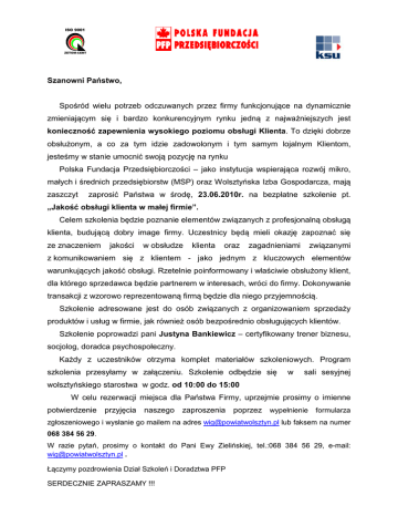 ISO 9001 ZETOM-CERT Szanowni Państwo, Spośród wielu potrzeb odczuwanych przez firmy funkcjonujące na dynamicznie zmieniającym się i bardzo konkurencyjnym rynku jedną z najważniejszych jest konieczność zapewnienia wysokiego poziomu obsługi Klienta. To dzięki dobrze obsłużonym, a co za tym idzie zadowolonym i tym samym lojalnym Klientom, jesteśmy w stanie umocnić swoją pozycję na rynku Polska Fundacja Przedsiębiorczości – jako instytucja wspierająca rozwój mikro, małych i średnich przedsiębiorstw (MSP) oraz Wolsztyńska Izba Gospodarcza, mają zaszczyt zaprosić Państwa w środę, 23.06.2010r. na bezpłatne szkolenie pt. „Jakość obsługi klienta w małej firmie”. Celem szkolenia będzie poznanie elementów związanych z profesjonalną obsługą klienta, budującą dobry image firmy. Uczestnicy będą mieli okazję zapoznać się ze znaczeniem jakości w obsłudze klienta oraz zagadnieniami związanymi z komunikowaniem się z klientem - jako jednym z kluczowych elementów warunkujących jakość obsługi. Rzetelnie poinformowany i właściwie obsłużony klient, dla którego sprzedawca będzie partnerem w interesach, wróci do firmy. Dokonywanie transakcji z wzorowo reprezentowaną firmą będzie dla niego przyjemnością. Szkolenie adresowane jest do osób związanych z organizowaniem sprzedaży produktów i usług w firmie, jak również osób bezpośrednio obsługujących klientów. Szkolenie poprowadzi pani Justyna Bankiewicz – certyfikowany trener biznesu, socjolog, doradca psychospołeczny. Każdy z uczestników otrzyma komplet materiałów szkoleniowych. Program szkolenia przesyłamy w załączeniu. Szkolenie odbędzie się w sali sesyjnej wolsztyńskiego starostwa w godz. od 10:00 do 15:00 W celu rezerwacji miejsca dla Państwa Firmy, uprzejmie prosimy o imienne potwierdzenie przyjęcia naszego zaproszenia poprzez wypełnienie formularza zgłoszeniowego i wysłanie go mailem na adres [email protected] lub faksem na numer 068 384 56 29. W razie pytań, prosimy o kontakt do Pani Ewy Zielińskiej, tel.:068 384 56 29, e-mail: [email protected] . Łączymy pozdrowienia Dział Szkoleń i Doradztwa PFP SERDECZNIE ZAPRASZAMY !!! ISO 9001 ZETOM-CERT SERDECZNIE ZAPRASZAMY !!! Program szkolenia „Jakość obsługi klienta” Godzina Temat zajęć 10.00 – 10.15 Powitanie uczestników i przedstawienie programu szkolenia 10.15 – 11.30 Jakość obsługi klientów – wprowadzenie Istota obsługi klienta Obsługa klientów z punktu widzenia komunikacji Bariery psychologiczne oraz komunikacyjne w obsłudze klienta Obsługa jako reagowanie na potrzeby produktowe oraz psychologiczne 11.30 – 11.45 Przerwa na kawę 11.45 – 13.45 Klienci Typy osobowości klientów Oczekiwania klientów oraz przyczyny niezadowolenia z obsługi Jak dostroić komunikację i dopasować obsługę do danego typu klienta? 13.45 – 14.00 Przerwa na poczęstunek 14.00 – 15.00 Praktyczne zasady obsługi klientów Sytuacje trudne w obsłudze danego typu klienta Asertywność jako sposoby radzenia sobie z trudnymi klientami Zakończenie szkolenia podczas zajęć prowadzący wraz z uczestnikami dowolnie ustalają czas krótkich przerw