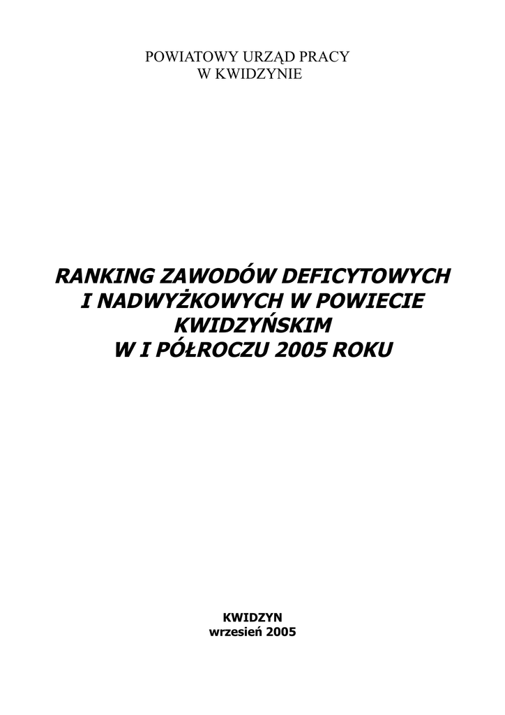 POWIATOWY URZĄD PRACY W KWIDZYNIE RANKING ZAWODÓW DEFICYTOWYCH I NADWYŻKOWYCH W POWIECIE KWIDZYŃSKIM W I PÓŁROCZU 2005 ROKU KWIDZYN wrzesień 2005 WSTĘP Monitoring na systematycznym zawodów deficytowych obserwowaniu zjawisk i nadwyżkowych zachodzących na to rynku proces pracy polegający dotyczących kształtowania popytu na pracę i podaży zasobów pracy w przekroju terytorialno-zawodowym oraz formułowaniu na tej podstawie ocen, wniosków i krótkotrwałych prognoz niezbędnych dla prawidłowego funkcjonowania systemów szkolenia bezrobotnych oraz kształcenia zawodowego. Celem niniejszego raportu jest przedstawienie analizy bezrobocia według zawodów, ofert pracy według zawodów oraz analizy zawodów deficytowych i nadwyżkowych w powiecie kwidzyńskim w I półroczu 2005 roku, a także sformułowanie ocen i wniosków na podstawie tych analiz. Opracowanie to pozwoli m. in. na: określenie odpowiednich kierunków szkolenia bezrobotnych z terenu powiatu kwidzyńskiego, zapewniając tym samym większą efektywność organizowanych szkoleń, bieżącą korektę poziomu, struktury i treści kształcenia zawodowego, usprawnienia poradnictwa zawodowego głównie poprzez ukazanie zawodów deficytowych i nadwyżkowych, ułatwienie realizacji programów specjalnych dla aktywizacji osób długotrwale bezrobotnych z terenu powiatu kwidzyńskiego w celu promowania ich ponownego zatrudnienia. Podstawowymi źródłami informacji do opracowania rankingu zawodów deficytowych i nadwyżkowych są dane zgromadzone w załączniku 2 „Bezrobotni według rodzaju działalności ostatniego miejsca pracy i oferty pracy” oraz w załączniku 3 „Bezrobotni oraz oferty pracy według zawodów i specjalności” do sprawozdania MGiP-01 o rynku pracy za I półrocze 2005 roku. W załącznikach tych podstawę do zakwalifikowania bezrobotnych oraz zgłaszanych ofert pracy stanowi Polska Klasyfikacja Działalności (PKD) wprowadzona Rozporządzeniem Rady Ministrów z dnia 20 stycznia 2004 r., w sprawie Polskiej Klasyfikacji Działalności (PKD). Natomiast zawody wskazane przez bezrobotnych jako podstawowe przy poszukiwaniu pracy, do wykonywania których mają odpowiednie kwalifikacje potwierdzone świadectwem szkolnym lub innym dokumentem, bądź odpowiedni staż pracy, pogrupowane są zgodnie z „Klasyfikacją zawodów i specjalności” (KZiS) wprowadzoną Rozporządzeniem Ministra Gospodarki i Pracy z dnia 8 grudnia 2004 r. W oparciu o powyższą klasyfikację występuje 10 grup wielkich, 30 dużych (jako wewnętrzny podział grup wielkich), 116 grup średnich (jako wewnętrzny podział grup dużych) i 392 grupy elementarne (jako wewnętrzny podział grup średnich), przy czym grupy elementarne obejmują 1 707 zawodów i specjalności. ANALIZA BEZROBOCIA W POWIECIE KWIDZYŃSKIM WEDŁUG ZAWODÓW (GRUP ZAWODÓW) Powiatowy Urząd Pracy w Kwidzynie obejmuje swoim działaniem powiat kwidzyński, w skład którego wchodzi 6 gmin: miasto Kwidzyn, gmina Gardeja, gmina Kwidzyn, gmina Ryjewo, gmina Sadlinki oraz miasto i gmina Prabuty. Na koniec I półrocza 2005 roku liczba zarejestrowanych bezrobotnych w Powiatowym Urzędzie Pracy w Kwidzynie wyniosła 8 087 osób, w tym 4 273 kobiet. 40,1% ogółu bezrobotnych stanowią osoby pozostające bez pracy powyżej 12 miesięcy (3 239 osób), zaś 3,7% ogółu zarejestrowanych w Powiatowym Urzędzie Pracy w Kwidzynie stanowią osoby do 12 miesięcy od dnia ukończenia nauki (299 osób). Wśród wszystkich osób zarejestrowanych na dzień 30 czerwca 2005 roku, grupę 7 585 osób (93,8%) tworzą bezrobotni wskazujący zawód wyuczony bądź wykonywany (w tym 3 928 kobiet). 41,9% tej grupy stanowią osoby zarejestrowane powyżej 12 miesięcy (3180 osób), zaś 3,7% osoby w okresie do 12 miesięcy od dnia ukończenia szkoły (282 osób). Pozostałą część osób bezrobotnych (502 osoby) stanowią bezrobotni nie posiadający żadnego zawodu (6,2%). W powiecie kwidzyńskim najliczniejszymi grupami zawodowymi byli: 1. Grupa 93 – „Robotnicy pomocniczy w górnictwie, przemyśle, budownictwie i transporcie” 1522 osoby i stanowiło to 20,1% liczby wszystkich osób posiadających zawód. W większości do grupy tej należały osoby z zawodami: ➢ robotnicy przy pracach prostych w przemyśle – 1276 osób, ➢ robotnicy pomocniczy w budownictwie ogólnym – 201 osób, ➢ robotnicy pomocniczy transportu i tragarze – 24 osoby, Powyższa grupa zawodowa w 61,9% zdominowana została przez bezrobotne kobiety. 2. Grupa 72 – „Robotnicy obróbki metali i mechanicy maszyn i urządzeń” to druga pod względem liczebności bezrobotnych duża grupa. Skupiało się w niej 10,1% ogółu zarejestrowanych bezrobotnych posiadających zawód (763 osoby), a w szczególności: ➢ mechanicy – monterzy maszyn i urządzeń – 211 osób, ➢ mechanicy pojazdów samochodowych – 168 osób, ➢ ślusarze i pokrewni – 104 osób, ➢ elektromonterzy – 55 osób, ➢ blacharze – 52 osoby, ➢ ustawiacze – operatorzy obrabiarek skrawających do metali – 50 osób. W grupie tej kobiety stanowiły niewielki procent – jedynie 2,4% – pozostałe 97,6% to mężczyźni. 3. Grupa 71 – „Górnicy i robotnicy budowlani”. Ogółem tworzyło ją 749 osób bezrobotnych, co stanowiło 9,9% ogólnej liczby osób bezrobotnych z zawodem. Głównie sklasyfikowani zostali w niej mężczyźni (kobiety stanowiły zaledwie 0,5% grupy). Najwięcej osób bezrobotnych posiadało zawód: ➢ murarze i zduni – 322 osób, ➢ cieśle, stolarze budowlani i pokrewni – 116 osób, ➢ murarze budowlani i pokrewni – 111 osób, ➢ betoniarze (betoniarz, betoniarz zbrojarz, zbrojarz) – 71 osób, ➢ monterzy instalacji i urządzeń sanitarnych – 50 osób. 4. Grupa 91 – „Pracownicy przy pracach prostych w handlu i usługach” skupiała 8,6% ogółu zarejestrowanych – 654 osoby bezrobotne. Znaczną część bezrobotnych stanowiły tu osoby z zawodem: ➢ robotnik gospodarczy – 296