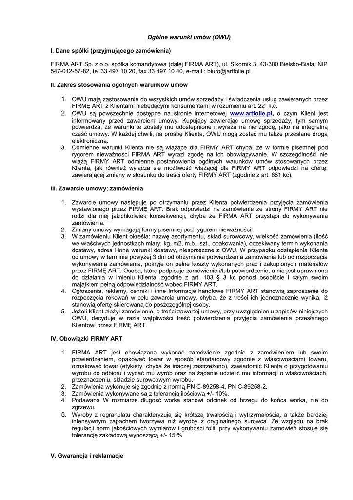 Ogólne warunki umów (OWU) I. Dane spółki (przyjmującego zamówienia) FIRMA ART Sp. z o.o. spółka komandytowa (dalej FIRMA ART), ul. Sikornik 3, 43-300 Bielsko-Biała, NIP 547-012-57-82, tel 33 497 10 20, fax 33 497 10 40, e-mail : [email protected] II. Zakres stosowania ogólnych warunków umów 1. OWU mają zastosowanie do wszystkich umów sprzedaży i świadczenia usług zawieranych przez FIRMĘ ART z Klientami niebędącymi konsumentami w rozumieniu art. 221 k.c. 2. OWU są powszechnie dostępne na stronie internetowej www.artfolie.pl, o czym Klient jest informowany przed zawarciem umowy. Kupujący zawierając umowę sprzedaży, tym samym potwierdza, że warunki te zostały mu udostępnione i wyraża na nie zgodę, jako na integralną część umowy. W każdej chwili, na prośbę Klienta, OWU mogą zostać mu także przesłane drogą elektroniczną. 3. Odmienne warunki Klienta nie są wiążące dla FIRMY ART chyba, że w formie pisemnej pod rygorem nieważności FIRMA ART wyrazi zgodę na ich obowiązywanie. W szczególności nie wiążą FIRMY ART odmienne postanowienia ogólnych warunków umów stosowanych przez Klienta, jak również wyłącza się możliwość wiążącej dla FIRMY ART odpowiedzi na ofertę, zawierającej zmiany w stosunku do treści oferty FIRMY ART (zgodnie z art. 681 kc). III. Zawarcie umowy; zamówienia 1. Zawarcie umowy następuje po otrzymaniu przez Klienta potwierdzenia przyjęcia zamówienia wystawionego przez FIRMĘ ART. Brak odpowiedzi na zamówienie ze strony FIRMY ART nie rodzi dla niej jakichkolwiek konsekwencji, chyba że FIRMA ART przystąpi do wykonywania zamówienia. 2. Zmiany umowy wymagają formy pisemnej pod rygorem nieważności. 3. W zamówieniu Klient określa: nazwę asortymentu, skład surowcowy, wielkość zamówienia (ilość we właściwych jednostkach miary; kg, m2, m.b., szt., opakowania), oczekiwany termin wykonania dostawy, adres i inne warunki dostawy, niesprzeczne z OWU. W przypadku odstąpienia Klienta od umowy w terminie powyżej 3 dni od otrzymania potwierdzenia zamówienia lub od rozpoczęcia wykonywania zamówienia, pokryje on pełne koszty wykonanych prac i zakupionych materiałów przez FIRMĘ ART. Osoba, która podpisuje zamówienie i/lub potwierdzenie, a nie jest uprawniona do działania w imieniu Klienta, zgodnie z art. 103 § 3 kc ponosi osobiście i całym swoim majątkiem pełną odpowiedzialność wobec FIRMY ART. 4. Ogłoszenia, reklamy, cenniki i inne Informacje handlowe FIRMY ART stanowią zaproszenie do rozpoczęcia rokowań w celu zawarcia umowy, chyba, że z treści ich jednoznacznie wynika, iż stanowią ofertę skierowaną do poszczególnej osoby. 5. Jeżeli Klient złożył zamówienie, o treści zawartej umowy, przy uwzględnieniu zapisów niniejszych OWU, decyduje w razie wątpliwości treść potwierdzenia przyjęcia zamówienia przesłanego Klientowi przez FIRMĘ ART. IV. Obowiązki FIRMY ART 1. FIRMA ART jest obowiązana wykonać zamówienie zgodnie z zamówieniem lub swoim potwierdzeniem, opakować towar w sposób standardowy zgodnie z właściwościami towaru, oznakować towar (etykiety, chyba że inaczej zastrzeżono), zawiadomić Klienta o przygotowaniu wyrobu do odbioru i wydać mu wyrób oraz na żądanie udzielić mu informacji o właściwościach, przeznaczeniu, składzie surowcowym wyrobu. 2. Zamówienia wykonuje się zgodnie z normą PN C-89258-4, PN C-89258-2. 3. Zamówienia wykonywane są z tolerancją ilościową +/- 10%. 4. Podawana W rozmiarze długość worka stanowi odcinek od brzegu do końca worka, nie do zgrzewu. 5. Wyroby z regranulatu charakteryzują się krótszą trwałością i wytrzymałością, a także bardziej intensywnym zapachem tworzywa niż wyroby z oryginalnego surowca. Ze względu na brak regulacji norm jakościowych wymiarów i grubości folii, przy wykonywaniu zamówień stosuje się tolerancję zakładową wynoszącą +/- 15 %. V. Gwarancja i reklamacje 1. FIRMA ART udziela gwarancji jakościowej dla swoich towarów, zgodnie charakterystyką produktów oraz postanowieniami umowy, w tym OWU. Okres gwarancji wynosi 3 miesiące, licząc od daty produkcji, nie dłużej niż 1 miesiąc od daty sprzedaży. 2. Reklamacja zostanie rozpatrzona pod warunkiem złożenia jej w formie pisemnej w ww. terminie, o ile zawierała będzie dane towaru (w tym typ towaru), ilość towaru podlegającego reklamacji, określenie daty produkcji i daty sprzedaży, precyzyjny opis wykrytej wady bądź problemów przetwórczych (poparty materiałem dowodowym), oraz zawierała będzie dokumenty dostawy, faktury, zamówienia oraz (jeśli Klient jest w ich posiadaniu) etykiety reklamowe towarów. 3. Klient powinien określić w zgłoszeniu reklamacyjnym, czy domaga się wymiany towaru na wolny od wad, czy udzielenie bonifikaty (uzasadniając jej wysokość). 4. Reklamowany towar, do czasu rozpatrzenia reklamacji powinien być przechowywany w formie w jakiej został dostarczony, opakowany, bez zabrudzeń, z etykietami. Powinien być też odpowiednio zabezpieczony przed jakimikolwiek uszkodzeniami. 5. FIRMA ART przyjmie reklamowany towar (także w celu zbadania zasadności reklamacji) tylko za uprzednim wyrażeniem zgody. Dostawa towaru do FIRMY ART odbywa się na koszt Klienta, chyba że reklamacja okaże się uzasadniona. 6. FIRMA ART rozpatrzy reklamację i poinformuje Klienta o sposobie jej załatwienia w terminie 14 dni od daty jej przyjęcia. W przypadku konieczności przeprowadzania dodatkowych badań, w tym w laboratorium zewnętrznym, termin ten może ulec wydłużeniu. 7. W zakresie nie objętym postanowieniami niniejszych OWU, strony wyłączają odmienne uregulowania W zakresie gwarancji, wyłączając tym samym także postanowienia dotyczące rękojmi za wady rzeczy sprzedanej. VI. Cena, warunki zapłaty 1. Aktualna cena wyrobu jest zawarta każdorazowo na potwierdzeniu przyjęcia zamówienia, chyba że FIRMA ART zaakceptuje cenę podaną przez Klienta. 2. Z chwilą, gdy Klient