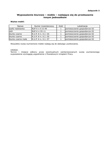 Załącznik 3 Wyposażenie biurowe – meble – nadające się do przekazania innym jednostkom Wykaz mebli: Nazwa Numer inwentarzowy Ilość Lokalizacja szafa nadstawka RUP K-n K II-49 1 pomieszczenie gospodarcze 02 stół RUP K-n III-11 1 pomieszczenie gospodarcze 02 biurko czarne R.U.P. K-n. K.I.-34 1 pomieszczenie gospodarcze 02 biurko czarne R.U.P. K-n. K.I.-35 1 pomieszczenie gospodarcze 02 biurko czarne małe R.U.P. K-n. K.I.-37 1 pomieszczenie gospodarcze 02 Wszystkie wyżej wymienione meble nadają się do dalszego użytkowania. UWAGA: Termin i miejsce odbioru przez ewentualnych zainteresowanych wyposażenia wymagają uzgodnienia z Powiatowym Urzędem Pracy. wyżej wymienionego