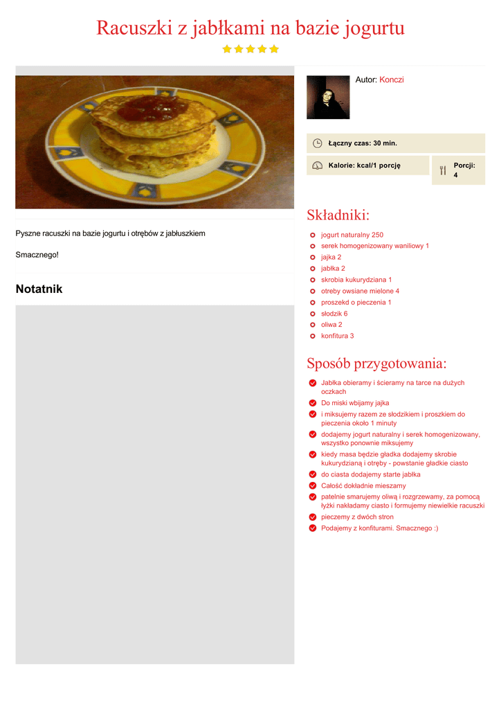Racuszki z jabłkami na bazie jogurtu Autor: Konczi Łączny czas: 30 min. Kalorie: kcal/1 porcję Porcji: 4 Składniki: Pyszne racuszki na bazie jogurtu i otrębów z jabłuszkiem jogurt naturalny 250 serek homogenizowany waniliowy 1 Smacznego! jajka 2 jabłka 2 skrobia kukurydziana 1 Notatnik otreby owsiane mielone 4 proszekd o pieczenia 1 słodzik 6 oliwa 2 konfitura 3 Sposób przygotowania: Jabłka obieramy i ścieramy na tarce na dużych oczkach Do miski wbijamy jajka i miksujemy razem ze słodzikiem i proszkiem do pieczenia około 1 minuty dodajemy jogurt naturalny i serek homogenizowany, wszystko ponownie miksujemy kiedy masa będzie gładka dodajemy skrobie kukurydzianą i otręby powstanie gładkie ciasto do ciasta dodajemy starte jabłka Całość dokładnie mieszamy patelnie smarujemy oliwą i rozgrzewamy, za pomocą łyżki nakładamy ciasto i formujemy niewielkie racuszki pieczemy z dwóch stron Podajemy z konfiturami. Smacznego :)
