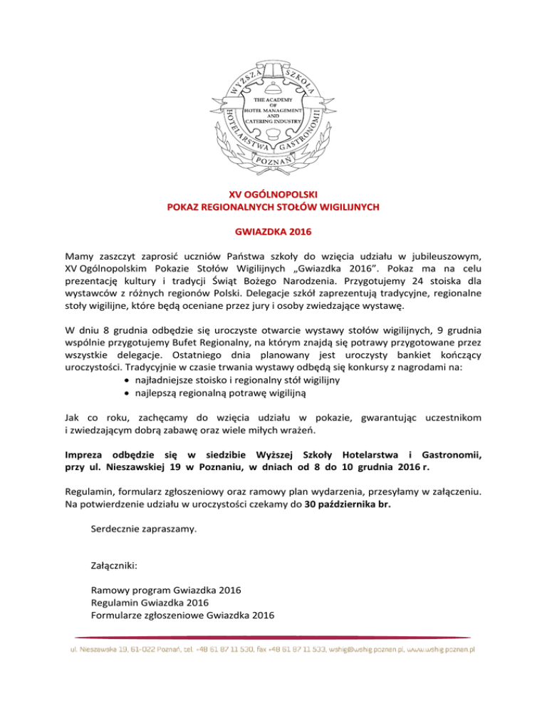 XV OGÓLNOPOLSKI POKAZ REGIONALNYCH STOŁÓW WIGILIJNYCH GWIAZDKA 2016 Mamy zaszczyt zaprosić uczniów Państwa szkoły do wzięcia udziału w jubileuszowym, XV Ogólnopolskim Pokazie Stołów Wigilijnych „Gwiazdka 2016”. Pokaz ma na celu prezentację kultury i tradycji Świąt Bożego Narodzenia. Przygotujemy 24 stoiska dla wystawców z różnych regionów Polski. Delegacje szkół zaprezentują tradycyjne, regionalne stoły wigilijne, które będą oceniane przez jury i osoby zwiedzające wystawę. W dniu 8 grudnia odbędzie się uroczyste otwarcie wystawy stołów wigilijnych, 9 grudnia wspólnie przygotujemy Bufet Regionalny, na którym znajdą się potrawy przygotowane przez wszystkie delegacje. Ostatniego dnia planowany jest uroczysty bankiet kończący uroczystości. Tradycyjnie w czasie trwania wystawy odbędą się konkursy z nagrodami na: najładniejsze stoisko i regionalny stół wigilijny najlepszą regionalną potrawę wigilijną Jak co roku, zachęcamy do wzięcia udziału w pokazie, gwarantując uczestnikom i zwiedzającym dobrą zabawę oraz wiele miłych wrażeń. Impreza odbędzie się w siedzibie Wyższej Szkoły Hotelarstwa i Gastronomii, przy ul. Nieszawskiej 19 w Poznaniu, w dniach od 8 do 10 grudnia 2016 r. Regulamin, formularz zgłoszeniowy oraz ramowy plan wydarzenia, przesyłamy w załączeniu. Na potwierdzenie udziału w uroczystości czekamy do 30 października br. Serdecznie zapraszamy. Załączniki: Ramowy program Gwiazdka 2016 Regulamin Gwiazdka 2016 Formularze zgłoszeniowe Gwiazdka 2016