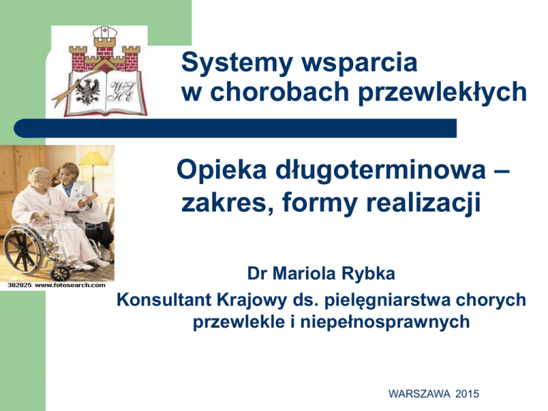 Systemy wsparcia w chorobach przewlekłych Opieka długoterminowa – zakres, formy realizacji Dr Mariola Rybka Konsultant Krajowy ds. pielęgniarstwa chorych przewlekle i niepełnosprawnych WARSZAWA 2015 Opieka długoterminowa WHO definiuje opiekę długoterminową jako ,,..integralną część ochrony zdrowia, związaną z działaniami na rzecz osób potrzebujących opieki realizowanych przez opiekunów nieformalnych (rodzinę, przyjaciół, sąsiadów), opiekunów formalnych (w tym profesjonalistów medycznych i pracowników socjalnych) a także przez tradycyjnych opiekunów i wolontariuszy..,, WARSZAWA 2015 Opieka długoterminowa ,,..opieka długoterminowa - całokształt działań medycznych i społecznych polegających na: świadczeniu długotrwałej opieki pielęgniarskiej, świadczeń terapeutycznych usług pielęgnacyjno - opiekuńczych Wobec osób przewlekle chorym, niesamodzielnym, niepełnosprawnych którzy nie wymagają hospitalizacji..,, WARSZAWA 2015 Opieka długoterminowa „..Opieka długoterminowa to długookresowa, ciągła i profesjonalna pielęgnacja i rehabilitacja oraz kontynuacja leczenia farmakologicznego i dietetycznego. Opieka ta realizowana jest w zakładach opieki stacjonarnej lub w domu chorego..” M.Z. WARSZAWA 2015 OBSZAR OPIEKA DŁUGOTERMINOWA N F Z OPIEKA DŁUGOTERMINOWA P O M O C S P O Ł E C Z N A WARSZAWA 2015 OPIEKA DŁUGOTERMINOWA - FORMY Stacjonarna -Zakłady opiekuńczo-lecznicze – ZOL -Zakłady opiekuńczo-pielęgnacyjne- ZPO - - Zakład opieki długoterminowej Dorosłych/dla dzieci i młodzieży do 18 r.ż. Ogólny/psychiatryczny Wentylowanych mechanicznie (żywionych dojelitowo/pozajelitowo) Domowa Zespół długoterminowej opieki domowej dla dorosłych, dzieci i młodzieży wentylowanych mechanicznie Pielęgniarską opiekę długoterminową domową WARSZAWA 2015 Zakłady opieki długoterminowej WARSZAWA 2015 OPD domowa 2010 rok- 2010 rok – 274 267 848 zł 9 893 430 2013 rok – 328 047 223 zł 2013 rok12 968 611 2014462 764 976 zł 2014 – 18 607 808 KWOTA OSOBODNI WARSZAWA 2015 Opieka długoterminowa 7% 3% 15% 7% 65% 3% do 18 lat 19-40 lat 41-60 lat 61-64 lat 65-74 lat 75 lat i powyżej Struktura wieku pacjentów w stacjonarnych zakładach opieki WARSZAWA długoterminowej GUS 2013 2015 WARSZAWA 2015 Charakterystyka kliniczna pacjentów OPD • • • • Wielochorobowość Polipragmazja Przewlekłość procesu chorobowego Utrata sprawności i autonomii życiowej WARSZAWA 2015 Kryteria objęcia opieką długoterminową Względy zdrowotne Skala Barthel WARSZAWA 2015 PROBLEMY ZDROWOTNE SPOŁECZEŃSTWA POLSKIEGO AKTUALNA „TRIADA ŚMIERCI” 1) Choroby układu krążenia - 45,39 tyś. zgonów na 100 tyś ludności (45,4% ogółu zgonów) 2) Choroby nowotworowe - 22,32 tyś. zgonów na 100 tyś ludności (22,3% ogółu zgonów) 3) Zewnętrzne przyczyny urazów - 6,67 tyś. zgonów na 100 tyś ludności (6,7% ogółu zgonów) ZASADNICZE CZYNNIKI RYZYKA •Brak aktywności ruchowej •Nieumiejętność radzenia sobie z reakcją stresową •Nieracjonalne odżywianie •Palenie tytoniu i nadużywanie alkoholu •Chemiczne i fizyczne czynniki środowiska POLA LALODA WARSZAWA 2015 ZESPÓŁ INTERDYSCYPLINARNY PIELĘGNIARKA LEKARZ FIZJOTERAPEUTA PSYCHOLOG OPIEKUN MEDYCZNY LOGOPEDA TERAPEUTA ZAJECIOWY PRACOWNIK SOCJALNY WARSZAWA 2015 DZIĘKUJĘ ZA UWAGĘ WARSZAWA 2015