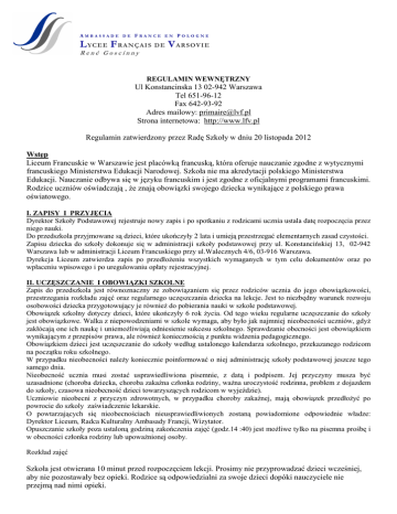 AMBASSADE DE FRANCE EN POLOGNE L YCEE F R A N Ç AI S D E V AR SOVI E René Goscinny REGULAMIN WEWNĘTRZNY Ul Konstancinska 13 02-942 Warszawa Tel 651-96-12 Fax 642-93-92 Adres mailowy: [email protected] Strona internetowa: http://www.lfv.pl Regulamin zatwierdzony przez Radę Szkoły w dniu 20 listopada 2012 Wstęp Liceum Francuskie w Warszawie jest placówką francuską, która oferuje nauczanie zgodne z wytycznymi francuskiego Ministerstwa Edukacji Narodowej. Szkoła nie ma akredytacji polskiego Ministerstwa Edukacji. Nauczanie odbywa się w języku francuskim i jest zgodne z oficjalnymi programami francuskimi. Rodzice uczniów oświadczają , Ŝe znają obowiązki swojego dziecka wynikające z polskiego prawa oświatowego. I. ZAPISY I PRZYJĘCIA Dyrektor Szkoły Podstawowej rejestruje nowy zapis i po spotkaniu z rodzicami ucznia ustala datę rozpoczęcia przez niego nauki. Do przedszkola przyjmowane są dzieci, które ukończyły 2 lata i umieją przestrzegać elementarnych zasad czystości. Zapisu dziecka do szkoły dokonuje się w administracji szkoły podstawowej przy ul. Konstancińskiej 13, 02-942 Warszawa lub w administracji Liceum Francuskiego przy ul.Walecznych 4/6, 03-916 Warszawa. Dyrekcja Liceum zatwierdza zapis po przedłoŜeniu wszystkich wymaganych w tym celu dokumentów oraz po wpłaceniu wpisowego i po uregulowaniu opłaty rejestracyjnej. II. UCZĘSZCZANIE I OBOWIĄZKI SZKOLNE Zapis do przedszkola jest równoznaczny ze zobowiązaniem się przez rodziców ucznia do jego obowiązkowości, przestrzegania rozkładu zajęć oraz regularnego uczęszczania dziecka na lekcje. Jest to niezbędny warunek rozwoju osobowości dziecka przygotowujący je równieŜ do pobierania nauki w szkole podstawowej. Obowiązek szkolny dotyczy dzieci, które ukończyły 6 rok Ŝycia. Od tego wieku regularne uczęszczanie do szkoły jest obowiązkowe. Walka z niepowodzeniami w szkole wymaga, aby było jak najmniej nieobecności uczniów, gdyŜ zakłócają one ich naukę i uniemoŜliwiają odniesienie sukcesu szkolnego. Sprawdzanie obecności jest obowiązkiem wynikającym z przepisów prawa, ale równieŜ koniecznością z punktu widzenia pedagogicznego. Obowiązkiem dzieci jest uczęszczanie do szkoły według ustalonego kalendarza szkolnego, przekazanego rodzicom na początku roku szkolnego. W przypadku nieobecności naleŜy koniecznie poinformować o niej administrację szkoły podstawowej jeszcze tego samego dnia. Nieobecność ucznia musi zostać usprawiedliwiona pisemnie, z datą i podpisem. Jej przyczyny musza być uzasadnione (choroba dziecka, choroba zakaźna członka rodziny, waŜna uroczystość rodzinna, problem z dojazdem do szkoły, czasowa nieobecność dzieci towarzyszących rodzicom w wyjeździe). Uczniowie nieobecni z przyczyn zdrowotnych, w przypadku choroby zakaźnej, mają obowiązek przedłoŜyć po powrocie do szkoly zaświadczenie lekarskie. O powtarzających się nieobecnościach nieusprawiedliwionych zostaną powiadomione odpowiednie władze: Dyrektor Liceum, Radca Kulturalny Ambasady Francji, Wizytator. Opuszczanie szkoły poza ustaloną godziną zakończenia zajęć (godz.14 :40) jest moŜliwe tylko na pisemna prośbę i w obecności członka rodziny lub upowaŜnionej osoby. Rozkład zajęć Szkoła jest otwierana 10 minut przed rozpoczęciem lekcji. Prosimy nie przyprowadzać dzieci wcześniej, aby nie pozostawały bez opieki. Rodzice są odpowiedzialni za swoje dzieci dopóki nauczyciele nie przejmą nad nimi opieki. Wyjście uczniów ze szkoły odbywa się pod opieką nauczyciela. Nauczyciel jest odpowiedzialny za uczniów na terenie szkoły do końca trwania lekcji. Po tym czasie uczniowie są pod opieką personelu firmy transportowej, instruktorów zajęć dodatkowych lub przekazywani rodzicom. Rodzice zobowiązani są do punktualnego odbierania dzieci. Rano Otwarcie szkoły Po południu Lekcje Koniec lekcji TPS 8h28 w klasie 8h38 15.30 Przedszkole 8h28 w klasie 8h38 14h40 Szkoła Podstawowa 8h28 na boisku 8h38 14h40 Rozkład zajęć świetlicy Świetlica Otwarcie szkoły Rano 7h45 w Sali 136 Koniec lekcji Po południu 17h30 w sali 136 Spóźnienia : Rodzice są zobowiązani do przestrzegania rozkladu zajęć. KaŜde spóźnienie musi być usprawiedliwione i moŜe zdarzyć się jedynie wyjątkowo. Rodzice powinni odprowadzić spóŜnione dziecko do klasy. III. śYCIE SZKOLNE Sprawowanie Zawsze i wszędzie istnieją zasady, o których nie wolno zapominać: - wzajemny szacunek (pomiędzy dziećmi, dziećmi i dorosłymi) - poszanowanie dóbr materialnych i pomieszczeń Nauczyciel nie ma prawa czynem, gestem lub słowem wyrazić obojętności lub pogardy wobec ucznia lub jego rodziny. Podobnie uczniowie jak i ich rodziny nie mają prawa czynem, gestem lub słowem szkodzić wizerunkowi i osobie nauczyciela oraz okazywać brak szacunku wobec kolegów i ich rodzin. Są niedopuszczalne (lista pozostaje otwarta): - brutalne i niebezpieczne zabawy–karty i inne przedmioty kolekcjonerskie, odtwarzacze MP3 i inne, playstation i inne – gumy do Ŝucia, twarde cukierki i lizaki. Telefony komórkowe muszą być wyłączone i schowane w tornistrach Odradza się przynoszenia do szkoły przedmiotów wartościowych, biŜuterii, gier i zabawek – w Ŝadnym wypadku nauczyciele nie mogą brać odpowiedzialności za ich bezpieczeństwo. Twarde skórzane piłki, którymi dzieci grają w piłkę noŜną lub inne gry są w szkole zabronione. Piłki naleŜy zostawić w domu, poniewaŜ będą konfiskowane i oddawane rodzicom. Nie moŜna grać w piłkę noŜną kiedy boisko jest zamknięte (tzn. w czwartki i w piątki). WyposaŜenie Udostępnione przez szkołę ksiąŜki (podręczniki szkolne, słowniki, ksiąŜki do języka angielskiego i polskiego , ksiąŜki wypoŜyczane z biblioteki) muszą być obłoŜone. Rodzice będą stale dbać o stan przyborów szkolnych powierzonych dzieciom. Rodzice zostaną pociągnięci do odpowiedzialności finansowej za sprzet zniszczony lub zgubiony. St