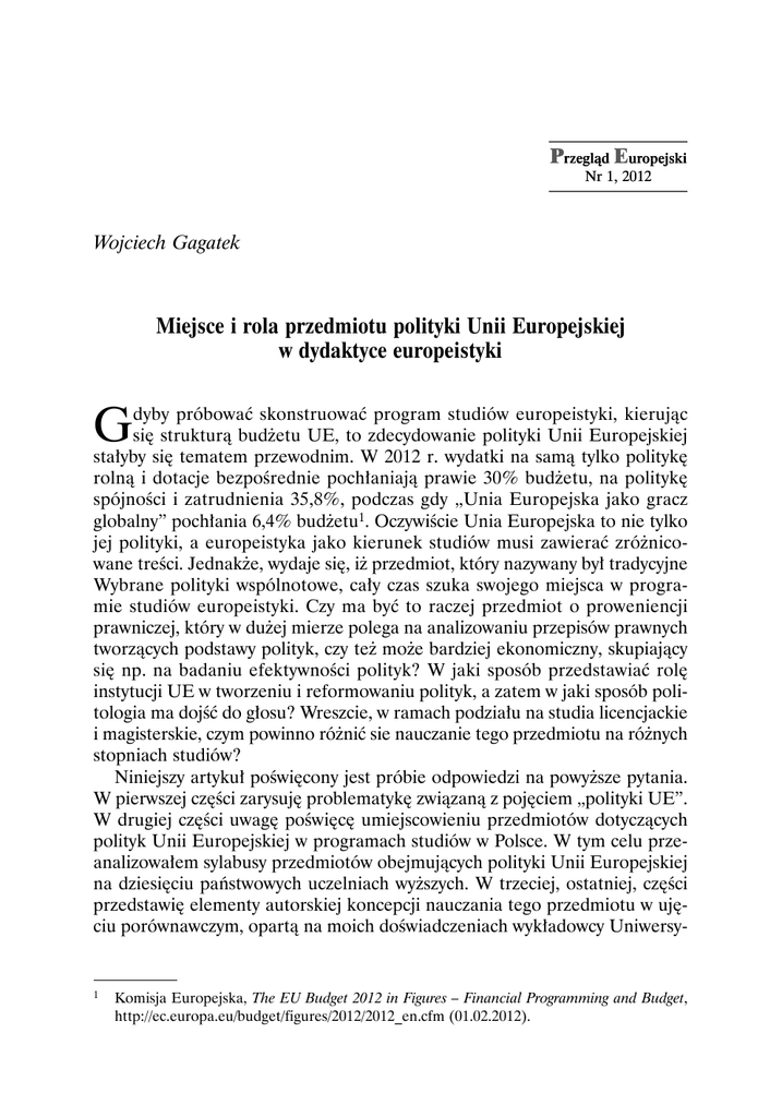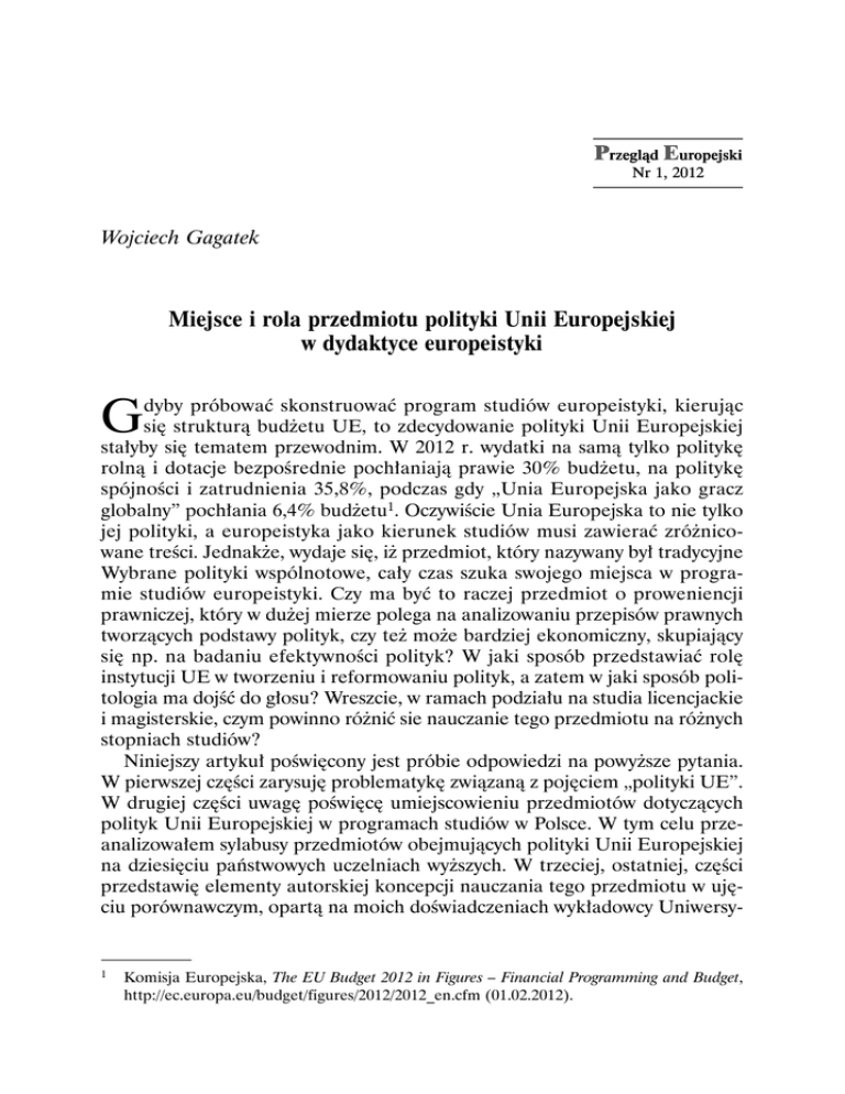 Przegląd Europejski Nr 1, 2012 Wojciech Gagatek Miejsce i rola przedmiotu polityki Unii Europejskiej w dydaktyce europeistyki G dyby próbować skonstruować program studiów europeistyki, kierując się strukturą budżetu UE, to zdecydowanie polityki Unii Europejskiej stałyby się tematem przewodnim. W 2012 r. wydatki na samą tylko politykę rolną i dotacje bezpośrednie pochłaniają prawie 30% budżetu, na politykę spójności i zatrudnienia 35,8%, podczas gdy „Unia Europejska jako gracz globalny” pochłania 6,4% budżetu1. Oczywiście Unia Europejska to nie tylko jej polityki, a europeistyka jako kierunek studiów musi zawierać zróżnicowane treści. Jednakże, wydaje się, iż przedmiot, który nazywany był tradycyjne Wybrane polityki wspólnotowe, cały czas szuka swojego miejsca w programie studiów europeistyki. Czy ma być to raczej przedmiot o proweniencji prawniczej, który w dużej mierze polega na analizowaniu przepisów prawnych tworzących podstawy polityk, czy też może bardziej ekonomiczny, skupiający się np. na badaniu efektywności polityk? W jaki sposób przedstawiać rolę instytucji UE w tworzeniu i reformowaniu polityk, a zatem w jaki sposób politologia ma dojść do głosu? Wreszcie, w ramach podziału na studia licencjackie i magisterskie, czym powinno różnić sie nauczanie tego przedmiotu na różnych stopniach studiów? Niniejszy artykuł poświęcony jest próbie odpowiedzi na powyższe pytania. W pierwszej części zarysuję problematykę związaną z pojęciem „polityki UE”. W drugiej części uwagę poświęcę umiejscowieniu przedmiotów dotyczących polityk Unii Europejskiej w programach studiów w Polsce. W tym celu przeanalizowałem sylabusy przedmiotów obejmujących polityki Unii Europejskiej na dziesięciu państwowych uczelniach wyższych. W trzeciej, ostatniej, części przedstawię elementy autorskiej koncepcji nauczania tego przedmiotu w ujęciu porównawczym, opartą na moich doświadczeniach wykładowcy Uniwersy- 1 Komisja Europejska, The EU Budget 2012 in Figures – Financial Programming and Budget, http://ec.europa.eu/budget/figures/2012/2012_en.cfm (01.02.2012). 66 Wojciech Gagatek tetu Warszawskiego oraz Uniwersytetu w Zurychu. Rozważania wypada zacząć od zarysowania pojęcia „polityki Unii Europejskiej”. Polityki Unii Europejskiej – uwagi wstępne Polityki Unii Europejskiej można pogrupować według wielu kryteriów. Należy przede wszystkim wskazać miejsce polityk w strukturze traktatowej UE, oraz w szczególności podział kompetencji. Począwszy od Traktatu z Lizbony, UE posiada traktatowo określony system podziału kompetencji, unormowany przede wszystkim w artykułach 2–6 Traktatu o Funkcjonowaniu Unii Europejskiej (TFUE). Dzięki temu możemy określić, w jakich obszarach UE posiada kompetencje wyłączne, w jakich dzielone, a w jakich dziedzinach jej umocowanie polega na koordynacji działań państw członkowskich. Część trzecia TFUE „Polityki i działania wewnętrzne Unii” zawiera przepisy dotyczące kilkunastu polityk UE, od polityki rolnej po ochrony środowiska. Dzięki traktatowo określonemu katalogowi polityk Unii możemy następnie wprowadzić podział na polityki w wąskim i szerokim znaczeniu. Ta pierwsza grupa obejmuje te dziedziny, które TFUE bezpośrednio wskazuje jako obszar działania UE. Chodzi tutaj zatem o następujące polityki: 1. Polityka konkurencji. 2. Polityka pieniężna. 3. Wspólna polityka handlowa. 4. Polityka społeczna. 5. Polityka spójności. 6. Polityka rolna i rybołówstwa. 7. Polityka ochrony środowiska. 8. Polityka ochrony konsumentów. 9. Polityka transportowa (w tym sieci transeuropejskie). 10. Polityka wewnętrzna (przestrzeń wolności, bezpieczeństwa i sprawiedliwości). 11. Wspólna polityka zagraniczna i bezpieczeństwa (w tym wspólna polityka bezpieczeństwa i obrony oraz europejska polityka sąsiedztwa). W powyższych politykach Unia posiada kompetencje legislacyjne. W pierwszych trzech politykach chodzi o kompetencje wyłączne, a w pozostałych o kompetencje dzielone (artykuły 3 i 4 TFUE). Czasem używa się tutaj pojęcia „polityki sektorowe”. Oddzielnym przypadkiem jest wspólna polityka zagraniczna i bezpieczeństwa, która rządzi się osobnymi przepisami określonymi przede wszystkim w tytule V TUE. Natomiast szersze znaczenie pojęcia „polityk UE” dotyczyło będzie tych obszarów działania UE, w których ma ona kompetencje tylko do wspierania, koordynowania lub uzupełniania polityki państw członkowskich. Te obszary MIEJSCE I ROLA PRZEDMIOTU POLITYKI UE W DYDAKTYCE EUROPEISTYKI 67 zostały określone w artykułach 5–6 TFUE. Chodzi tutaj o następujące dziedziny: 1. Gospodarka. 2. Zatrudnienie. 3. Kwestie społeczne. 4. Ochrona i poprawa zdrowia ludzkiego. 5. Przemysł. 6. Kultura. 7. Turystyka. 8. Edukacja, kształcenie zawodowe, młodzież i sport. 9. Ochrona ludności. 10. Współpraca administracyjna. Ze względu na brak kompetencji legislacyjnych w tych obszarach, moim zdaniem, nie powinno się używać terminu „polityka”. Przykładowo, UE nie ma własnej polityki gospodarczej ani polityki przemysłowej, chyba że poprzez UE rozumiemy wszystkie państwa członkowskie. Mimo tak obszernego umocowania prawnego, Traktat nie wskaże nam definicji pojęcia „polityka”. W tym celu sięgnąć należy do literatury z zakresu polityki publicznej (ang. public policy lub też w ujęciu badawczym policy analysis). Pojęcie „polityki publicznej” weszło do powszechnego użytku w latach trzydziestych XX wieku, wraz z coraz bardziej intensywnym wykorzystywaniem przez państwa instrumentów interwencjonistycznych. Liczba definicji pojęcia „polityki publicznej” jest ogromna. Jedne z nich są bardzo ogólne. Dla przykładu, autor klasycznego podręcznika Thomas Dye określa politykę publiczną jako „wszystko to, co państwo (rząd) zdecyduje się robić albo nie robić”, oraz jakie są tego przyczyny i kons