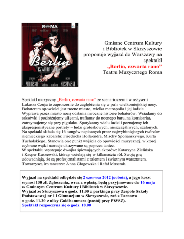 Gminne Centrum Kultury i Bibliotek w Skrzyszowie proponuje wyjazd do Warszawy na spektakl „Berlin, czwarta rano” Teatru Muzycznego Roma Spektakl muzyczny „Berlin, czwarta rano” ze scenariuszem i w reżyserii Łukasza Czuja to zaproszenie do zagłębienia się w puls wielkomiejskiej nocy. Bohaterem opowieści jest nocne miasto, wielka metropolia i jej ludzie. Wyprawa przez miasto nocą odsłania mroczne historie bohaterów. Wsiadamy do taksówki i podróżujemy ulicami, trafiamy do nocnego baru, na komisariat, zatrzymujemy się przy pigalaku. Spotykamy wielu ludzi i poznajemy ich ekspresjonistyczne portrety – ludzi groteskowych, nieszczęśliwych, szalonych. Na spektakl składa się 16 songów napisanych przez najwybitniejszych twórców niemieckiego kabaretu: Friedricha Hollaendra, Mischy Spoliansky'ego, Kurta Tucholskiego. Stanowią one punkt wyjścia do opowieści muzycznej, w której wybrane wątki narracje ukazywane są poprzez taniec. W spektaklu występuje dwójka śpiewających aktorów: Katarzyna Zielińska i Kacper Kuszewski, którzy wcielają się w kilkanaście ról. Swoją grą udowadniają, że są profesjonalistami z talentem i świetnym warsztatem. Towarzyszą im tancerze: Anna Głogowska i Rafał Maserak. Wyjazd na spektakl odbędzie się 2 czerwca 2012 (sobota), a jego koszt wynosi 130 zł. Zgłoszenia, wraz z wpłatą, będą przyjmowane do 16 maja w Gminnym Centrum Kultury i Bibliotek w Skrzyszowie. Wyjazd ze Skrzyszowa o godz. 11.00 z parkingu przy Zespole Szkoły Podstawowej nr 1 i Gimnazjum w Skrzyszowie, zaś z Tarnowa o godz. 11.20 z ulicy Goldhammera (postój przy PWSZ). Spektakl rozpoczyna się o godz. 18.00 Na scenie Romy śpiewających wykonawców jest zaledwie dwoje - Katarzyna Zielińska i Kacper Kuszewski - ale wcieleń kilkanaście. Każda piosenka to aktorska etiuda, reżyser Łukasz Czuj i choreografka Paulina Andrzejewska zmusili ich do maksymalnego wysiłku: ciągłej zmiany wcieleń i konwencji: od surrealizmu po ciepły liryzm, od groteski po niemiecki ekspresjonizm. Katarzyna Zielińska i Kacper Kuszewski popularność zdobyli dzięki telewizyjnym show i serialom, bardziej mają statut celebrytów niż poważnych aktorów. W spektaklu Romy w ciągu półtorej godziny udowadniają, że są absolutnymi profesjonalistami - z talentem i świetnym warsztatem. W ich towarzystwie aktorskich umiejętności nabyli także tancerze Anna Głogowska i kolejny ulubieniec plotkarskich portali - Rafał Maserak. Ona – to każda kobieta jaką można spotkać w nocy albo w snach. On – archetyp ćmy barowej, facet z głębią, która może ją zafascynować lub przestraszyć. Oboje mają wiele twarzy i nietrudno ich pomylić z kimś innym. Nocą wszystkie koty są czarne. Metropolia nocą to osobny świat, czarna bajka, której magia musi wyparować z nastaniem świtu. A co zostanie z niej, co z niego? Poezja piosenki, gest tancerza. Fantazja, która będzie żyła w nas długo po tym, jak miasto obudzi się do prozy. „W dzisiejszych czasach teatralnej bylejakości tak perfekcyjny spektakl to nie tylko wydarzenie, ale po prostu ewenement.” Jacek Marczyński Rzeczpospolita Scenariusz i reżyseria - Łukasz Czuj Teksty autorstwa Friedricha Hollaendra, Mischy Spoliansky'ego, Kurta Tucholskiego - tłumaczenie - Artur Kożuch Scenografia i kostiumy - Elżbieta Rokita Choreografia - Paulina Andrzejewska Aranżacje i kierownictwo muzyczne - Marcina Partyki Występują Katarzyna Zielińska Kacper Kuszewski Anna Głogowska Rafał Maserak