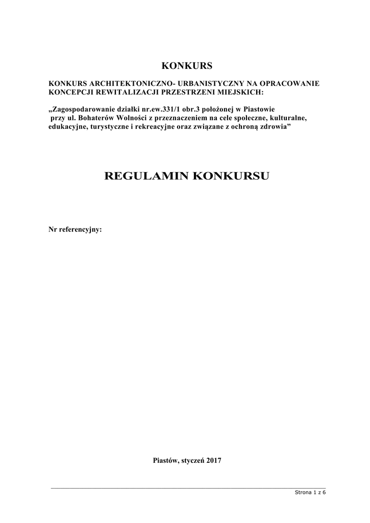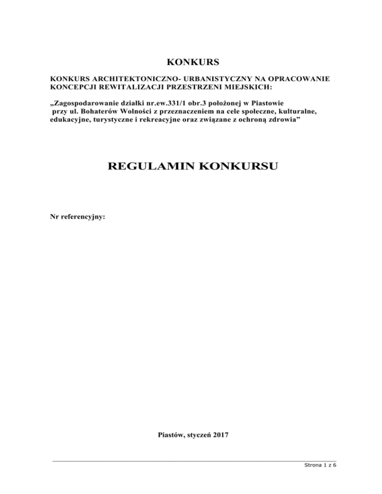 KONKURS KONKURS ARCHITEKTONICZNO- URBANISTYCZNY NA OPRACOWANIE KONCEPCJI REWITALIZACJI PRZESTRZENI MIEJSKICH: „Zagospodarowanie działki nr.ew.331/1 obr.3 położonej w Piastowie przy ul. Bohaterów Wolności z przeznaczeniem na cele społeczne, kulturalne, edukacyjne, turystyczne i rekreacyjne oraz związane z ochroną zdrowia” REGULAMIN KONKURSU Nr referencyjny: Piastów, styczeń 2017 _______________________________________________________________________________________ Strona 1 z 6 ROZDZIAŁ I POSTANOWIENIA OGÓLNE 1/ORGANIZATOR KONKURSU 1.1. Organizatorem Konkursu jest Zamawiający, reprezentowana przez Burmistrza Piastowa czyli Gmina Piastów 1.2. Siedziba Organizatora Konkursu 05-820 Piastów ul. 11 listopada 2 tel. (0 22) 770 52 01; fax (22) 723 66 00; e-mail [email protected] Godziny urzędowania: pn-pt 8-16 1.3. Osobami uprawnionymi do porozumienia się z Uczestnikami Konkursu i udzielania informacji na jego temat są: Konrad Rytel – przewodniczący komisji konkursowej, do udzielania informacji dotyczących Konkursu w imieniu Burmistrza Piastowa, tel. 22/770 5201, 1.4. Regulamin konkursu architektoniczno - urbanistycznego na koncepcję rewitalizacji przestrzeni miejskich: pod tytułem „Zagospodarowanie działki nr.ew.331/1 obr.3 położonej w Piastowie przy ul. Bohaterów Wolności „ zwany dalej „Regulaminem” określa zasady udziału w organizowanym konkursie i zawiera warunki uczestnictwa. 2/Podstawa prawna Konkursu: 2.1 Podstawą prawną Konkursu jest art. 7 ust. 1 pkt. 1 ustawy z dnia 8 marca 1990 r. o samorządzie gminnym (Dz. U. z 20156 r. poz. 1515 z późn. zm.) i art. 3 ust. 1 ustawy z dnia 27 marca 2003 r. o planowaniu i zagospodarowaniu przestrzennym (Dz.U. z 2015 r. poz. 199, z późn, zm.) 2.2 Regulamin jest jedynym dokumentem określającym zasady Konkursu. Każdy Uczestnik biorący udział w Konkursie, akceptuje i przyjmuje warunki Regulaminu określone w niniejszym dokumencie. 3/Rodzaj i forma Konkursu: 3.1 Konkurs zorganizowany jest w formie Konkursu otwartego, urbanistycznego, który umożliwia uczestnictwo wszystkim chętnym, o których mowa w rozdziale III, punkcie 1. 3.2 Konkurs prowadzony i rozstrzygany jest w języku polskim. Wszystkie dokumenty, oświadczenia, zawiadomienia, wnioski oraz część opisowa, graficzna i elektroniczna muszą być opracowane przez wszystkich Uczestników w języku polskim. 3.3 Dokumenty, materiały i inne informacje złożone w języku innym niż wymieniony w podpunkcie 3.2. nie będą rozpatrywane. 4/ Termin Konkursu: 4.1 Termin zadawania pytań dotyczących Konkursu – do 18 stycznia 2017r. 4.2 Termin udzielania odpowiedzi na pytania dot. Konkursu - 2 dni od daty otrzymania przez Organizatora. 4.3 Termin złożenia prac konkursowych (specyfikacja prac określona w rozdziale IV, punkcie 1 - 3 lutego 2017 r. do godz. 14 4.4 Ogłoszenie wyników konkursu – do dnia 8 lutego 2017r. _______________________________________________________________________________________ Strona 2 z 6 ROZDZIAŁ II OPIS PRZEDMIOTU KONKURSU 1. Przedmiot i cel konkursu: 1.1Przedmiotem Konkursu jest opracowanie koncepcji rewitalizacji przestrzeni miejskich: „ Zagospodarowanie działki nr.ew.331/1 obr.3 położonej w Piastowie przy ul. Bohaterów Wolności z przeznaczeniem na cele społeczne, kulturalne, edukacyjne, turystyczne i rekreacyjne oraz związane z ochroną zdrowia „ Lokalizacja: działka o nr. ew. 331/1 obręb 3 Charakterystyka terenu: Na działce o pow. 4967 m2 znajduje się budynek murowany z cegły ceramicznej, otoczony zielenią parkową, cała posesja jest ogrodzona z dostępem do drogi publicznej ul. Bohaterów Wolności (Załącznik nr 1 - odbitka mapy zasadniczej 1.2 Koncepcja ma stworzyć wspólną przestrzeń miejską przeznaczoną pod aktywizację społeczną i gospodarczą, atrakcyjną turystycznie. Przestrzeń ma być miejscem spotkań mieszkańców, wypoczynku czynnego i biernego, może również pełnić funkcje kulturalne i edukacyjne. 1.3 Celem Konkursu jest wyłonienie najlepszej pod względem urbanistycznym oraz funkcjonalnym koncepcji zagospodarowania terenu, która pozwoli wykreować atrakcyjną przestrzeń miejską przeznaczoną pod aktywizację społeczną i gospodarczą. 1.4 Koncepcja powinna być zgodna z miejscowym planem zagospodarowania przestrzennego. ROZDZIAŁ III OPIS WARUNKÓW UDZIAŁU W KONKURSIE, PRZENIESIENIE PRAW AUTORSKICH 1/Wymagania jakie muszą spełnić Uczestnicy Konkursu: 1.1. W Konkursie mogą brać udział osoby fizyczne, osoby prawne oraz jednostki organizacyjne nie posiadające osobowości prawnej. 1.2. W Konkursie nie mogą uczestniczyć: a) osoby biorące udział w opracowaniu Regulaminu; b) osoby biorące udział w organizowaniu Konkursu; c) osoby zasiadające w Komisji Konkursowej; 1.3. Uczestnik Konkursu może złożyć tylko jedną pracę konkursową. 1.4. Uczestniczący w Konkursie mają obowiązek zapoznania się z Regulaminem Konkursu i stosowania do ustaleń w nim zawartych. 2/Przeniesienie praw autorskich: 2.1 Uczestnik, któremu przyznano nagrodę (nagrodę główną lub wyróżnienie), przenosi na Organizatora z chwilą wręczenia Uczestnikowi nagrody lub przyznaniu wyróżnienia, autorskie prawa majątkowe do całości pracy konkursowej, na wszelkich prawach eksploatacji, w szczególności: a) w zakresie utrwalania i zwielokrotnienia pracy konkursowej – wytwarzanie określoną techniką egzemplarzy, w tym techniką drukarską, reprograficzną, zapisu magnetycznego oraz techniką cyfrową, _______________________________________________________________________________________ Strona 3 z 6 b) w zakresie obrotu oryginałem albo egzemplarzami, na których pracę konkursową utrwalono – wprowadzenie do obrotu, użyczenie lub najem oryginału albo egzemplarzy; c) W zakresie rozpowszechniania pracy konkursowej w sposób inny niż określony podpunkcie b) – publiczne wykonanie, wystawienie, wyświetlanie, odtworzenie oraz nadawanie i remitowanie, a także publiczni