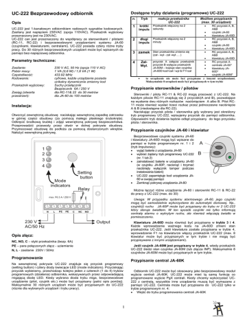 Dostępne tryby działania (programowe) UC-222 UC-222 Bezprzewodowy odbiornik Opis UC-222 jest 1-kanałowym odbiornikiem radiowych sygnałów kodowanych. Zasilany jest napięciem 230VAC (opcja 110VAC). Przekaźnik wyjściowy przeznaczony jest na 230VAC. UC-222 can jest przeznaczony do współpracy ze sterownikami / pilotami (RC-11, RC-22) i bezprzewodowymi urządzeniami systemu JA-60 (czujnikami, klawiaturami, centralami). UC-222 posiada cztery różne tryby pracy. Do 30 różnych bezprzewodowych urządzeń może być wpisanych do pamięci bez-napięciowej odbiornika. Parametry techniczne: Zasilanie: Pobór mocy: Częstotliwość: Kodowanie: Zasięg (otwarta przestrzeń): Otworzyć zewnętrzną obudowę naciskając wewnętrzną zapadkę zatrzasku w górnej części obudowy (za pomocą małego płaskiego śrubokręta). Odkręcić środkową śrubkę i zdjąć wewnętrzną pokrywę bezpieczeństwa. Przeprowadzić przewody przez otwór w dolnej pokrywie obudowy. Przymocować obudowę do podłoża za pomocą dostarczonych wkrętów. Nałożyć wewnętrzną pokrywę. krótki impuls 2 3 Setting button Mode indicators Relay PE C 230 V AC/50 Hz NC • RC przyciski A, B, A&B • czujniki JA-60 • klawiatury JA-60D • RC przyciski A, B, długi Przekaźnik włączony na 2 A&B impuls minuty • czujniki JA-60 • klawiatury JA-60D • RC przyciski A, B, zamek Stan przekaźnika zmienia się (zał - wył - zał -wył .... ) A&B • klawiatury JA-60D przycisk A załącza przekaźnik • RC przycisk A Zał• centrale JA-60* Wył. przycisk B wyłącza przekaźnik JA-60M – kopiuje stan czujnika • klawiatury JAJA-60D kod=zał / wył & F1=zał 60D* • czujniki JA-60M* • to urządzenie nie może być przypisane z innymi urządzeniami. Maksymalnie 8 urządzeń może być przypisanych w tym trybie Sterowniki / piloty RC-11 & RC-22 mogą pracować z UC-222. Na każdym pilocie RC-11 znajdują się 2 przyciski(A and B), pozwalające na wysłanie dwu różnych rozkazów naciśnięciem A albo B. Pilot RC11 może również wysłać trzeci rozkaz przez jednoczesne naciśnięcie A & B (niedostępne dla RC-22). Naciskając przycisk pilota / sterownika gdy wybrany jest określony tryb programowy UC-222, wpisujemy przycisk do pamięci odbiornika. Odpowiedni tryb działania będzie odtąd przypisany do tego przycisku pilota / sterownika. Przypisanie czujników JA-60 i klawiatur A B Można łączyć różne urządzenia JA-60 i sterowniki RC-11 & RC-22 do pracy z UC-222 (max. do 30) max. F6.3 A / 250 V PE Możliwe przypisanie (max. 30 urządzeń) Przekaźnik włączony na 2 sekundy Bezprzewodowe czujniki systemu JA-60 i klawiatury JA-60D mogą być wpisane do pamięci w trybie programowym nr. 1 i 2 (tryb impulsowy): • wyjąć baterie z urządzenia JA-60 • wybrać żądany tryb programowy UC-222 (nr. 1 lub 2) • zainstalować baterie w urządzeniu JA-60 (w czujniku JA-60P, nacisnąć i trzymać naciśnięty wyłącznik tamper podczas instalowania baterii) • UC-222 zapamiętuje kod urządzenia JA60 w swojej pamięci • Zamknąć pokrywę urządzenia JA-60 1 2 3 4 L 1 reakcja przekaźnika UC-222 Przypisanie sterowników / pilotów Instalacja: N Tryb 4 230 V AC, 50 Hz (opcja 110 V AC) 1 VA (0,6 W) / 1,8 VA (1 W) 433.92 MHz cyfrowe, każde urządzenie posiada unikalny dynamicznie zmienny kod Suchy przełącznik Bezpiecznik 6A / 250 V dla RC-11& 22 do 30 metrów dla JA-60 do 100 metrów Przekaźnik wyjściowy: n. Uwaga: W przypadku systemu alarmowego JA-60, jego czujniki mogą być samodzielnie wykorzystane do automatyki domowej. Np., czujnik(i) ruchu JA-60P może być przypisany do trybu nr 2 UC-222 który steruje światłem. W ten sposób czujniki nie tylko informują centralę alarmu o wykrytym ruchu, ale również włączają światło w pomieszczeniu. NO Output Klawiatura JA-60D może również być przypisana w trybie 3 i 4. Każde wprowadzenie ważnego kodu na JA-60D zmieni stan przekaźnika UC-222. Jeśli klawiatura została przypisana w trybie 4, wprowadzenie F1 na klawiaturze włączy przekaźnik UC-222 (max. 8 klawiatur może być przypisanych w tym trybie i nie mogą być przypisywane z innymi urządzeniami). Opis złącz: NC, NO, C – styki przekaźnika (bezp. 6A) PE – para połączonych złącz - uziemienie N, L - zasilanie 230V / 50Hz Jeśli czujnik JA-60M jest przypisany w trybie 4, wtedy przekaźnik UC-222 śledzi stan czujnika JA-60M (lub złącza INP). Maksymalnie 8 czujników JA-60M może być przypisanych w tym trybie. Programowanie Na wewnętrznej pokrywie UC-222 znajduje się przycisk programowy (setting button) i cztery diody świecące LED (mode indicators). Przyciskając przycisk wybieramy, przechodząc kolejno jeden z czterech (1 do 4) trybów programowych (działania) odbiornika, wskazywanych przez odpowiadającą migającą diodę LED. Kiedy wybrana dioda trybu miga, bezprzewodowe urządzenie (pilot, czujnik etc.) może być przypisany (patrz opis poniżej). Maksymalnie 30 różnych urządzeń może być przypisanych do UC-222 (róznie dla wybranych urządzeń i trybu pracy). 1 Przypisanie central JA-60K Odbiornik UC-222 może być stosowany jako bezprzewodowy moduł wyjścia centrali JA-60K. UC-222 może mieć tą samą funkcję co programowane wyjście PgX centrali. Kiedy chcemy wykorzystać UC222 z centralą, wszystkie inne urządzenia muszą być wymazane z pamięci UC-222. Centrala może być przypisana do UC-222 tylko w trybie programowym nr. 4: • Wejść do trybu programowania centrali JA-60K • • • • Wybrać tryb programowy nr. 4 w UC-222 Wprowadzić kod 299 na klawiaturze centrali JA-60K UC-222 zapisze kod centrali JA-60K w swojej pamięci Wyjść z trybu programowania centrali JA-60K Wiele odbiorników UC-222 może być użytych z centralą JA-60K i każdy UC-222 może również odbierać sygnały z więcej niż jednej centrali (do 8iu). Żadne inne urządzenia (piloty ani czujniki) nie mogą być przypisane gdy UC-222 jest wykorzystany z centralą JA-60K. Powy