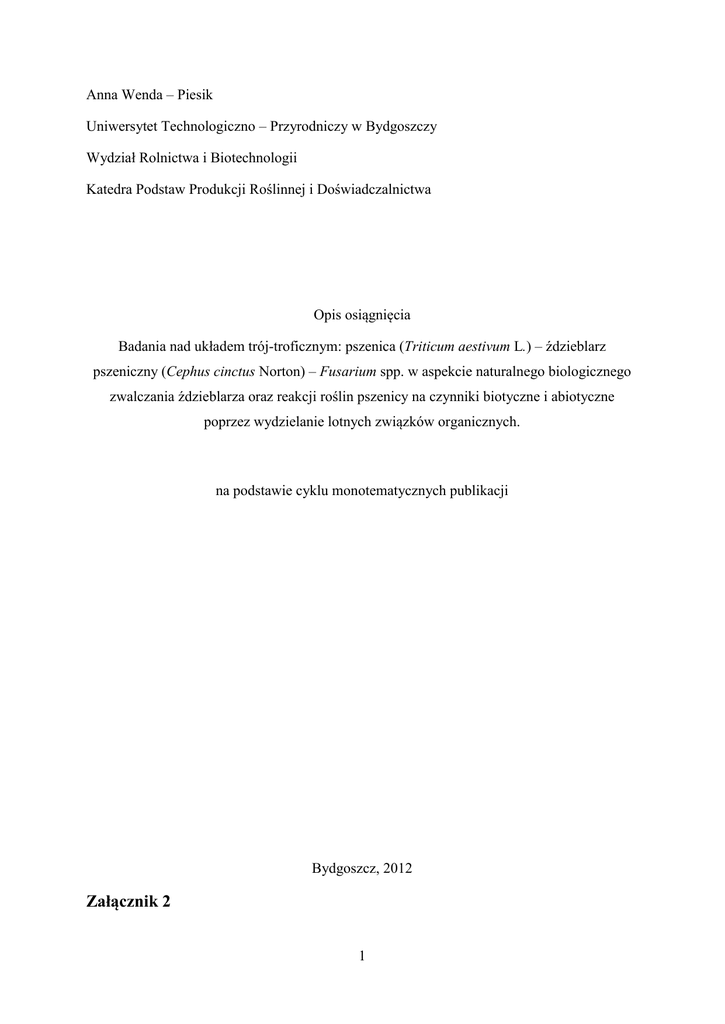 Anna Wenda – Piesik Uniwersytet Technologiczno – Przyrodniczy w Bydgoszczy Wydział Rolnictwa i Biotechnologii Katedra Podstaw Produkcji Roślinnej i Doświadczalnictwa Opis osiągnięcia Badania nad układem trój-troficznym: pszenica (Triticum aestivum L.) – ździeblarz pszeniczny (Cephus cinctus Norton) – Fusarium spp. w aspekcie naturalnego biologicznego zwalczania ździeblarza oraz reakcji roślin pszenicy na czynniki biotyczne i abiotyczne poprzez wydzielanie lotnych związków organicznych. na podstawie cyklu monotematycznych publikacji Bydgoszcz, 2012 Załącznik 2 1 Plan pracy: Wstęp Wykaz prac ze wskazaniem udziału procentowego i wkładu habilitanta 1. Charakterystyka entomopatogenicznych właściwości Fusarium spp. w oparciu o trójtroficzny układ: pszenica – ździeblarz pszeniczny – Fusarium spp. 1.1 Wprowadzenie 1.1.1 Stanowisko systematyczne Cephus cinctus Norton 1.1.2 Zasięg występowania i zróżnicowanie gatunkowe ździeblarza pszenicznego 1.1.3 Szkodliwość i straty gospodarcze powodowane przez ździeblarza pszenicznego 1.1.4 Morfologia i cykl życiowy Cephus cinctus Norton 1.1.5 Synchronizacja cyklu życiowego ździeblarza pszenicznego z rozwojem fuzaryjnej zgorzeli na pszenicy 1.2 Osiągnięcia i wnioski 1.3 Podsumowanie 2. Reakcja obronna pszenicy poprzez wydzielanie organicznych związków lotnych na porażenie przez Fusarium spp. oraz uszkodzenia spowodowane żerowaniem larw ździeblarza pszenicznego. 2.1 Wprowadzenie 2.2 Osiągnięcia i wnioski 2.3 Podsumowanie 3. Wpływ wilgotności i światła na indukcję związków lotnych wydzielanych przez pszenicę porażoną Fusarium sp. 3.1 Wprowadzenie 3.2 Osiągnięcia i wnioski 3.3 Podsumowanie Literatura Oświadczenia współautorów prac 2 Wstęp Agrocenozy są zespołami bardzo złożonych współzależności pomiędzy przedstawicielami poszczególnych poziomów troficznych. Na ogół występują w nich związki antagonistyczne o charakterze eksploatacyjnym dotyczące relacji szkodnik-roślina oraz patogen-roślina. Problem badawczy, który został podjęty w niniejszej rozprawie to współzależności występujące pomiędzy trzema gatunkami, z których każdy reprezentuje inny poziom troficzny; pszenica (Triticum aestivum L.) jako żywicielska roślina dla ździeblarza pszenicznego (Cephus cinctus Norton) oraz dla nekrotroficznych patogenów z rodzaju Fusarium. Pojedyncze związki w tym układzie pomiędzy pszenicą a ździeblarzem oraz pszenicą a Fusarium sp. są dość dobrze poznane, ponieważ w wielu regionach Świata agrofagi te powodują poważne straty gospodarcze. Całkowicie nowym zagadnieniem przedstawionym w niniejszej pracy jest antagonistyczna relacja pomiędzy grzybami z rodzaju Fusarium i ździeblarzem pszenicznym. W pierwszym rozdziale zostały przedstawione najważniejsze osiągnięcia z badań własnych pokazujące patogeniczną rolę gatunków z rodzaju Fusarium w układzie pszenica – ździeblarz, czyli w układzie trój-troficznym. Pełna dokumentacja tych danych znajduje się w dwóch oryginalnych publikacjach naukowych. Ponadto, w jednej pracy o charakterze przeglądowym zostały przedstawione entomopatogeniczne właściwości grzybów z rodzaju Fusarium, co również w tej rozprawie wykorzystano. Zagadnienie entomopatogeniczności Fusarium sp. zostało rozpatrzone w aspekcie naturalnego biologicznego zwalczania ździeblarza pszenicznego. Według Waage i Greathead (1988) naturalne biologiczne zwalczanie to spontaniczna aktywność występujących w środowisku rolniczym rodzimych gatunków antagonistycznych dla agrofagów, która odbywa się bez udziału człowieka. Uważa się, że jest ono największym i najważniejszym sektorem biologicznego zwalczania w rolnictwie. Drugim aspektem prezentowanych w pracy badań nad układem trój-troficznym: pszenica-ździeblarz-Fusarium sp. jest reakcja obronna roślin pszenicy na atak ze strony agrofagów poprzez wydzielanie lotnych związków organicznych. Aktywność chemicznej indukcji LZO pod wpływem porażenia przez zgorzelowe Fusarium spp. oraz uszkodzenia przez ździeblarza została zbadana w sensie jakościowym i ilościowym. Zaprezentowane tutaj osiągnięcia i wnioski zostały zaczerpnięte z trzech oryginalnych prac naukowych. 3 Ostatni rozdział niniejszej rozprawy powstał w oparciu o wyniki zawarte w jednej publikacji i traktuje on o mechanizmie indukcji LZO u pszenicy pod wpływem czynników abiotycznych, tj. wilgotności gleby i intensywności światła w interakcji z porażeniem jej przez zgorzelowe gatunki z rodzaju Fusarium. Zagadnienia chemicznego informowania się pomiędzy roślinami o zagrożeniu ze strony agrofagów są jest domeną ekologii biochemicznej i przypuszcza się, że w przyszłości będzie można ten potencjał wykorzystać w strategii ochrony roślin. Jest to kierunek zgodny z ogólnie przyjętą w Unii Europejskiej tendencją rozwoju rolnictwa zrównoważonego. Obecne regulacje prawne obowiązujące w krajach unii (Rozporządzenia nr 1107/2009 i Dyrektywa nr 2009/128/WE z dnia 21 października 2009 r.) nakazują od roku 2014 powszechne stosowanie metod integrowanych, z pierwszeństwem użycia metod niechemicznych i naturalnych w ochronie roślin w ich polowej produkcji. Stąd potrzeba badań nad naturalnymi metodami biologicznymi oraz nad wykorzystaniem LZO w strategiach ochrony roślin jest aktualna. Prezentowane badania mają znaczenie przede wszystkim poznawcze i charakter interdyscyplinarny, gdzie Fusarium sp. stało się swoistym pomostem pomiędzy ich fitopatologicznym i entomologicznym tłem. W konsekwencji tych rozważań wyłoniła się nowa ekologiczna rola tych grzybów w układzie trój-troficznym pomiędzy pszenicą a ździeblarzem pszenicznym. W badaniach nad problemem biochemicznej reakcji roślin pszenicy na atak ze strony agrofaga, pomocne okazały się zarówno techniki zbierania LZO oraz chromatografii gazowej ze spektometrią mas. W tym miejscu uprzejmie dziękuję Wszystkim