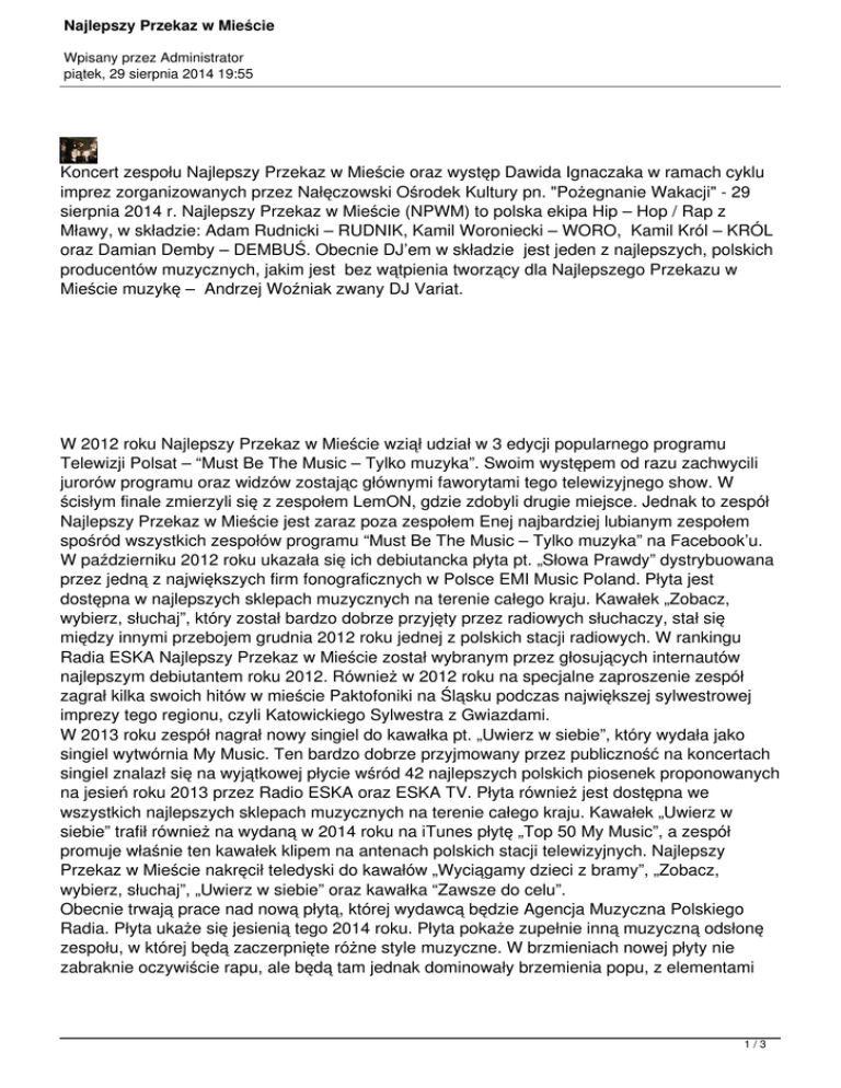 sierpnia 2014 r. Najlepszy Przekaz w Mieście (NPWM) to polska ekipa Hip – Hop / Rap z