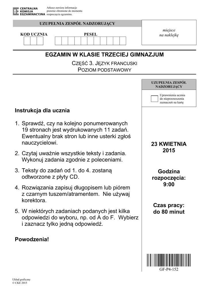Arkusz zawiera informacje prawnie chronione do momentu rozpoczęcia egzaminu. UZUPEŁNIA ZESPÓŁ NADZORUJĄCY KOD UCZNIA PESEL miejsce na naklejkę EGZAMIN W KLASIE TRZECIEJ GIMNAZJUM CZĘŚĆ 3. JĘZYK FRANCUSKI POZIOM PODSTAWOWY UZUPEŁNIA ZESPÓŁ NADZORUJĄCY Uprawnienia ucznia do nieprzenoszenia zaznaczeń na kartę Instrukcja dla ucznia 1. Sprawdź, czy na kolejno ponumerowanych 19 stronach jest wydrukowanych 11 zadań. Ewentualny brak stron lub inne usterki zgłoś nauczycielowi. 2. Czytaj uważnie wszystkie teksty i zadania. Wykonuj zadania zgodnie z poleceniami. 3. Teksty do zadań od 1. do 4. zostaną odtworzone z płyty CD. 4. Rozwiązania zapisuj długopisem lub piórem z czarnym tuszem/atramentem. Nie używaj korektora. 5. W niektórych zadaniach podanych jest kilka odpowiedzi do wyboru, np. od A do F. Wybierz i zaznacz tylko jedną odpowiedź. 23 KWIETNIA 2015 Godzina rozpoczęcia: 9:00 Czas pracy: do 80 minut Powodzenia! GF-P4-152 Układ graficzny © CKE 2015 Zadanie 1. (0–5) Usłyszysz dwukrotnie pięć tekstów. Na podstawie informacji zawartych w nagraniu w zadaniach 1.1.–1.5. z podanych odpowiedzi wybierz właściwą. Zakreśl literę A, B albo C. 1.1. Quelle est la profession du père de Michel ? A. B. C. 2 GF-4 1.2. Qu’est-ce que la fille n’aime pas faire ? A. B. C. GF-4 3 1.3. Où Jean a-t-il mal ? A. B. C. 4 GF-4 1.4. Où sont les deux personnes qui parlent ? A. B. C. 1.5. Adèle parle A. d’un spectacle théâtral. B. de l’animal de son amie. C. de la passion de sa copine. GF-4 5 Zadanie 2. (0–4) Usłyszysz dwukrotnie rozmowę Corinne i Marca. Na podstawie informacji zawartych w nagraniu dopasuj do każdej osoby (2.1.–2.4.) czynność, którą wykona (A–E). Wpisz odpowiednią literę w każdą kratkę. Uwaga! Jedna czynność została podana dodatkowo i nie pasuje do żadnej osoby. Qui ? 2.1. Corinne 2.2. Maxime 2.3. Camille 2.4. Marc Quelle activité ? A. apprendre B. jouer sur l’ordinateur C. s’occuper de son frère D. regarder la télévision E. aller au cinéma 6 GF-4 Zadanie 3. (0–3) Usłyszysz dwukrotnie komunikat. Zdecyduj, które ze zdań 3.1.– 3.3. są zgodne z treścią nagrania (P – Prawda), a które nie (F – Fałsz). Zakreśl literę P albo F. 3.1. Le train pour Bordeaux arrive à temps. P F 3.2. Les passagers peuvent prendre leur petit-déjeuner à un prix plus bas. P F 3.3. Le message passe dans le train. P GF-4 F 7 Zadanie 4. (0–4) Usłyszysz dwukrotnie cztery wypowiedzi (4.1.–4.4.). Do każdej z nich dobierz właściwą reakcję (A–E). Wpisz rozwiązania do tabeli. Uwaga! Jedna reakcja została podana dodatkowo i nie pasuje do żadnej wypowiedzi. A. Moi, je veux jouer dans un groupe de rock. B. C’est une belle blonde aux cheveux longs. C. Elle est là, en face de la porte. D. Pour elle, c’est génial ! E. Avec plaisir, merci ! 4.1. 4.2. 4.3. 4.4. 8 GF-4 Zadanie 5. (0–3) Uzupełnij poniższe minidialogi (5.1.–5.3.), wybierając spośród podanych odpowiedzi brakującą wypowiedź jednej z osób. Zakreśl literę A, B albo C. 5.1. X : Je t’ai fait mal ? Excuse-moi ! Y : _________________________ A. Enchanté. B. S’il vous plaît. C. Ce n’est rien. 5.2. X : _________________________ Y : Non, ce n’est pas loin, alors on y va à pied. A. Pourquoi vous prenez la voiture ? B. Est-ce que vous allez à la plage en voiture ? C. Vous marchez beaucoup pendant les vacances ? 5.3. X : J’ai beaucoup aimé ce film. Et toi ? Y : ________________________ A. Tu adores les comédies. B. Cette comédie ? Pas trop. C. Une comédie ? Pourquoi pas ? GF-4 9 Zadanie 6. (0–3) Dla każdej z opisanych sytuacji (6.1.–6.3.) wybierz właściwą reakcję. Zakreśl literę A, B albo C. 6.1. Żegnasz się z kolegą, z którym spotkasz się ponownie dzisiaj po kolacji. Co powiesz? A. À tout à l’heure. B. À dimanche. C. À demain. 6.2. Ktoś pyta, czy może zająć wolne miejsce obok Ciebie w autobusie. Co mu odpowiesz? A. Prenez le bus, s’il vous plaît. B. Vous avez pris ma place. C. Je vous en prie. 6.3. Masz ochotę na kawałek ciasta. Co powiesz? A. Il y avait trois morceaux de gâteau. B. Je déteste le gâteau au chocolat. C. Je voudrais du gâteau. 10 GF-4 pusta strona GF-4 11 Zadanie 7. (0–4) Przeczytaj ogłoszenia 7.1.–7.4. Do każdego z nich dobierz odpowiednie zdanie (A–E). Wpisz rozwiązania do tabeli. Uwaga! Jedno zdanie zostało podane dodatkowo i nie pasuje do żadnego ogłoszenia. 7.1. Salon professionnel des conducteurs de camion Découvrez leur travail ! Au programme : Présentations vidéo Expositions de véhicules Ateliers pour enfants Cafétéria (chocolat chaud gratuit !) 7.2. Vous aimez surfer sur Internet ? Vous cherchez un travail chez vous ? Nous vous proposons la vente de produits alimentaires régionaux en ligne. Contactez-nous : [email protected] 7.3. Ouverture du magasin le samedi 16 mai 2015 Les agriculteurs de la région vous offriront leurs fruits et légumes en direct de leurs fermes. 12 GF-4 Toute la journée à partir de 10h : Découverte de la boutique Dégustation gratuite rue des Loges, Fontenay-le-Comte 7.4. Un cadeau pas cher !!! Faites plaisir à votre enfant ! Je produis et je vends des autos et des camions miniatures en chocolat. Seulement 12 euros l’unité Promotion sur certains modèles ! Achetez, goûtez et adorez ! А. On peut goûter des produits de la terre locaux. В. Cette annonce est écrite par un fabriquant de sucreries. C. Dans cette annonce, on propose du travail dans un café. D. On ne doit pas sortir de sa maison pour gagner de l’argent. E. On s’adresse aux personnes qui veulent mieux connaître un métier. 7.1. 7.2. 7.3. 7.4. GF-4 13 Zadanie 8. (0–4) Przeczytaj teksty. W zadaniach 8.1.–8.4. z podanych odpowiedzi wybierz właściwą, zgodną z treścią tekstu. Zakreśl literę A, B albo C. Salut Lucas, Je t’écris pour te raconter mon voyage. C’était un cauchemar ! Je t’ai dit au revoir à l’aéroport et tout a commencé : j’ai perdu 