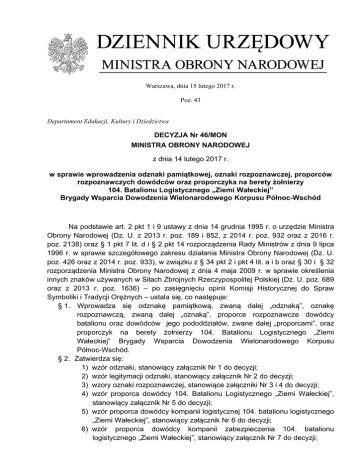 Warszawa, dnia 15 lutego 2017 r. Poz. 43 Departament Edukacji, Kultury i Dziedzictwa DECYZJA Nr 46/MON MINISTRA OBRONY NARODOWEJ z dnia 14 lutego 2017 r. w sprawie wprowadzenia odznaki pamiątkowej, oznaki rozpoznawczej, proporców rozpoznawczych dowódców oraz proporczyka na berety żołnierzy 104. Batalionu Logistycznego „Ziemi Wałeckiej” Brygady Wsparcia Dowodzenia Wielonarodowego Korpusu Północ-Wschód Na podstawie art. 2 pkt 1 i 9 ustawy z dnia 14 grudnia 1995 r. o urzędzie Ministra Obrony Narodowej (Dz. U. z 2013 r. poz. 189 i 852, z 2014 r. poz. 932 oraz z 2016 r. poz. 2138) oraz § 1 pkt 7 lit. d i § 2 pkt 14 rozporządzenia Rady Ministrów z dnia 9 lipca 1996 r. w sprawie szczegółowego zakresu działania Ministra Obrony Narodowej (Dz. U. poz. 426 oraz z 2014 r. poz. 933), w związku z § 34 pkt 2 i pkt 4 lit. a i b oraz § 30 i § 32 rozporządzenia Ministra Obrony Narodowej z dnia 4 maja 2009 r. w sprawie określenia innych znaków używanych w Siłach Zbrojnych Rzeczypospolitej Polskiej (Dz. U. poz. 689 oraz z 2013 r. poz. 1636) – po zasięgnięciu opinii Komisji Historycznej do Spraw Symboliki i Tradycji Orężnych – ustala się, co następuje: § 1 . Wprowadza się odznakę pamiątkową, zwaną dalej „odznaką”, oznakę rozpoznawczą, zwaną dalej „oznaką”, proporce rozpoznawcze dowódcy batalionu oraz dowódców jego pododdziałów, zwane dalej „proporcami”, oraz proporczyk na berety żołnierzy 104. Batalionu Logistycznego „Ziemi Wałeckiej” Brygady Wsparcia Dowodzenia Wielonarodowego Korpusu Północ-Wschód. § 2 . Zatwierdza się: 1) wzór odznaki, stanowiący załącznik Nr 1 do decyzji; 2) wzór legitymacji odznaki, stanowiący załącznik Nr 2 do decyzji; 3) wzory oznaki rozpoznawczej, stanowiące załączniki Nr 3 i 4 do decyzji; 4) wzór proporca dowódcy 104. Batalionu Logistycznego „Ziemi Wałeckiej”, stanowiący załącznik Nr 5 do decyzji; 5) wzór proporca dowódcy kompanii logistycznej 104. batalionu logistycznego „Ziemi Wałeckiej”, stanowiący załącznik Nr 6 do decyzji; 6) wzór proporca dowódcy kompanii zabezpieczenia 104. batalionu logistycznego „Ziemi Wałeckiej”, stanowiący załącznik Nr 7 do decyzji; 7) wzór proporca dowódcy kompanii technicznej 104. batalionu logistycznego „Ziemi Wałeckiej”, stanowiący załącznik Nr 8 do decyzji; 8) wzór proporczyka na berety żołnierzy, stanowiący załącznik Nr 9 do decyzji; § 3 . Nadaje się regulamin odznaki, stanowiący załącznik Nr 10 do decyzji. § 4 . Traci moc: 1) decyzja Nr 512/MON z dnia 31 grudnia 2010 r. Ministra Obrony Narodowej z dnia w sprawie wprowadzenia odznaki pamiątkowej, oznaki rozpoznawczej oraz proporczyka na beret 104. Batalionu Zabezpieczenia Brygady Wsparcia Dowodzenia Wielonarodowego Korpusu PółnocWschód, (Dz. Urz. Min. Obr. Nar. z 2011 r. poz. 9); 2) decyzja Nr 35/MON z dnia 16 lutego 2012 r. Ministra Obrony Narodowej w sprawie wprowadzenia proporców rozpoznawczych dowódców 104. Batalionu Zabezpieczenia Brygady Wsparcia Dowodzenia Wielonarodowego Korpusu Północ-Wschód (Dz. Urz. Min. Obr. Nar. poz. 49). § 5 . Decyzja wchodzi w życie po upływie 14 dni od dnia ogłoszenia. Minister Obrony Narodowej: A. Macierewicz Załączniki do decyzji Nr 46/MON Ministra Obrony Narodowej z dnia 14 lutego 2017 r. (poz. 43) Załącznik Nr 1 WZÓR GRAFICZNY ODZNAKI PAMIĄTKOWEJ 104. BATALIONU LOGISTYCZNEGO „ZIEMI WAŁECKIEJ” BRYGADY WSPARCIA DOWODZENIA WIELONARODOWEGO KORPUSU PÓŁNOC-WSCHÓD Załącznik Nr 2 WZÓR GRAFICZNY LEGITYMACJI ODZNAKI PAMIĄTKOWEJ 104. BATALIONU LOGISTYCZNEGO „ZIEMI WAŁECKIEJ” BRYGADY WSPARCIA DOWODZENIA WIELONARODOWEGO KORPUSU PÓŁNOC-WSCHÓD ROZKAZEM DOWÓDCY 104. BATALIONU LOGISTYCZNEGO 104. BATALION LOGISTYCZNY Nr ……… z dnia …………. Pan/Pani …………………………………. LEGITYMACJA NR …………. Wyróżniony został ODZNAKĄ PAMIĄTKOWĄ 104. BATALIONU LOGISTYCZNEGO DOWÓDCA ...…………………… Wałcz, dnia …………………… m. p. Załącznik Nr 3 WZÓR GRAFICZNY OZNAKI ROZPOZNAWCZEJ 104. BATALIONU LOGISTYCZNEGO „ZIEMI WAŁECKIEJ” BRYGADY WSPARCIA DOWODZENIA WIELONARODOWEGO KORPUSU PÓŁNOC-WSCHÓD NA MUNDUR WYJŚCIOWY Załącznik Nr 4 WZÓR GRAFICZNY OZNAKI ROZPOZNAWCZEJ 104. BATALIONU LOGISTYCZNEGO „ZIEMI WAŁECKIEJ” BRYGADY WSPARCIA DOWODZENIA WIELONARODOWEGO KORPUSU PÓŁNOC-WSCHÓD NA MUNDUR POLOWY Załącznik nr 5 WZÓR GRAFICZNY PROPORCA ROZPOZNAWCZEGO DOWÓDCY 104. BATALIONU LOGISTYCZNEGO „ZIEMI WAŁECKIEJ” BRYGADY WSPARCIA DOWODZENIA WIELONARODOWEGO KORPUSU PÓŁNOC-WSCHÓD Załącznik Nr 6 WZÓR GRAFICZNY PROPORCA ROZPOZNAWCZEGO DOWÓDCY KOMPANII LOGISTYCZNEJ 104. BATALIONU LOGISTYCZNEGO „ZIEMI WAŁECKIEJ” BRYGADY WSPARCIA DOWODZENIA WIELONARODOWEGO KORPUSU PÓŁNOC-WSCHÓD Załącznik Nr 7 WZÓR GRAFICZNY PROPORCA ROZPOZNAWCZEGO DOWÓDCY KOMPANII ZABEZPIECZENIA 104. BATALIONU LOGISTYCZNEGO „ZIEMI WAŁECKIEJ” BRYGADY WSPARCIA DOWODZENIA WIELONARODOWEGO KORPUSU PÓŁNOC-WSCHÓD Załącznik Nr 8 WZÓR GRAFICZNY PROPORCA ROZPOZNAWCZEGO DOWÓDCY KOMPANII TECZNICZNEJ 104. BATALIONU LOGISTYCZNEGO „ZIEMI WAŁECKIEJ” BRYGADY WSPARCIA DOWODZENIA WIELONARODOWEGO KORPUSU PÓŁNOC-WSCHÓD Załącznik Nr 9 WZÓR GRAFICZNY PROPORCZYK NA BERET 104. BATALIONU LOGISTYCZNEGO „ZIEMI WAŁECKIEJ” BRYGADY WSPARCIA DOWODZENIA WIELONARODOWEGO KORPUSU PÓŁNOC-WSCHÓD Załącznik Nr 10 REGULAMIN ODZNAKI PAMIĄTKOWEJ 104. BATALIONU LOGISTYCZNEGO „ZIEMI WAŁECKIEJ” BRYGADY WSPARCIA DOWODZENIA WIELONARODOWEGO KORPUSU PÓŁNOC-WSCHÓD 1. Odznaka pamiątkowa, zwana dalej „odznaką”, 104. Batalionu Logistycznego „Ziemi Wałeckiej” Brygady Wsparcia Dowodzenia Wielonarodowego Korpusu Północ-Wschód, zwanego dalej „104. Batalionem”, stanowi formę wyróżnienia żołnierzy, za nienaganną służbę oraz osób szczególnie zasłużonych dla 104. Batalionu. 2. Odznaka ma kształt krzyża równoramiennego nałożonego na srebrzyste k