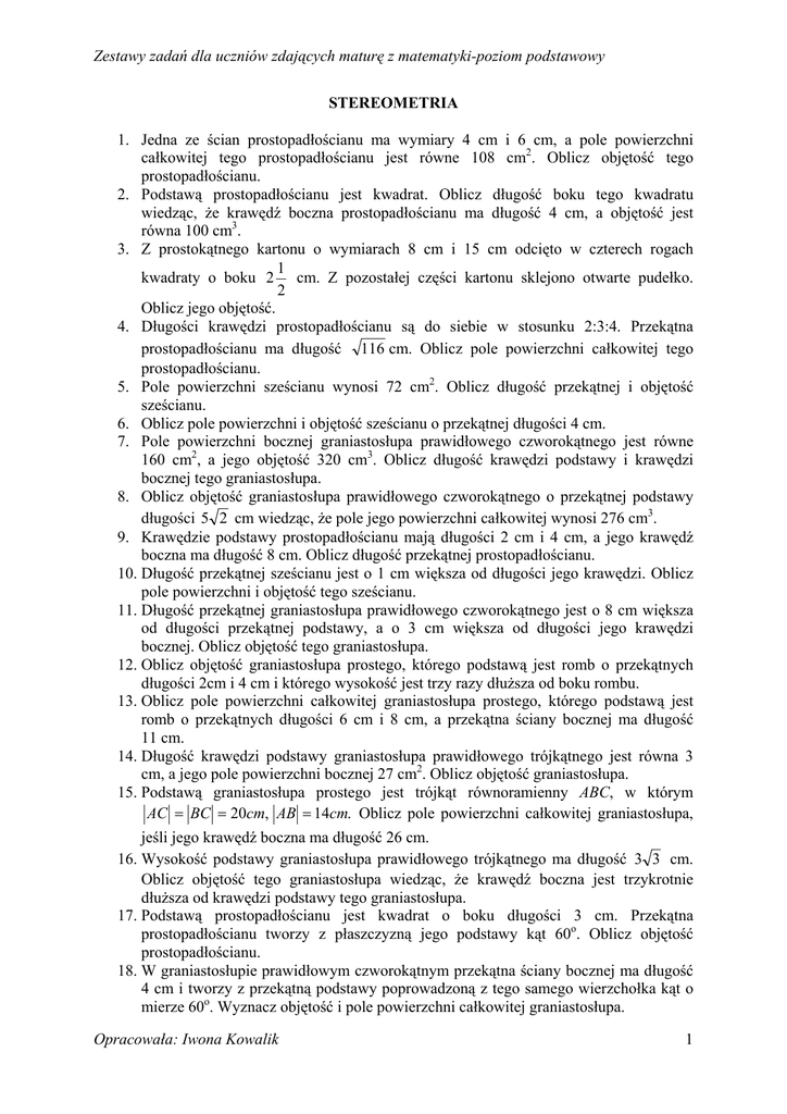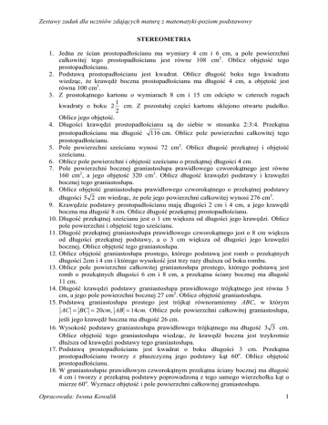 Zestawy zadań dla uczniów zdających maturę z matematyki-poziom podstawowy STEREOMETRIA 1. Jedna ze ścian prostopadłościanu ma wymiary 4 cm i 6 cm, a pole powierzchni całkowitej tego prostopadłościanu jest równe 108 cm2. Oblicz objętość tego prostopadłościanu. 2. Podstawą prostopadłościanu jest kwadrat. Oblicz długość boku tego kwadratu wiedząc, że krawędź boczna prostopadłościanu ma długość 4 cm, a objętość jest równa 100 cm3. 3. Z prostokątnego kartonu o wymiarach 8 cm i 15 cm odcięto w czterech rogach 1 kwadraty o boku 2 cm. Z pozostałej części kartonu sklejono otwarte pudełko. 2 Oblicz jego objętość. 4. Długości krawędzi prostopadłościanu są do siebie w stosunku 2:3:4. Przekątna prostopadłościanu ma długość 116 cm. Oblicz pole powierzchni całkowitej tego prostopadłościanu. 5. Pole powierzchni sześcianu wynosi 72 cm2. Oblicz długość przekątnej i objętość sześcianu. 6. Oblicz pole powierzchni i objętość sześcianu o przekątnej długości 4 cm. 7. Pole powierzchni bocznej graniastosłupa prawidłowego czworokątnego jest równe 160 cm2, a jego objętość 320 cm3. Oblicz długość krawędzi podstawy i krawędzi bocznej tego graniastosłupa. 8. Oblicz objętość graniastosłupa prawidłowego czworokątnego o przekątnej podstawy długości 5 2 cm wiedząc, że pole jego powierzchni całkowitej wynosi 276 cm3. 9. Krawędzie podstawy prostopadłościanu mają długości 2 cm i 4 cm, a jego krawędź boczna ma długość 8 cm. Oblicz długość przekątnej prostopadłościanu. 10. Długość przekątnej sześcianu jest o 1 cm większa od długości jego krawędzi. Oblicz pole powierzchni i objętość tego sześcianu. 11. Długość przekątnej graniastosłupa prawidłowego czworokątnego jest o 8 cm większa od długości przekątnej podstawy, a o 3 cm większa od długości jego krawędzi bocznej. Oblicz objętość tego graniastosłupa. 12. Oblicz objętość graniastosłupa prostego, którego podstawą jest romb o przekątnych długości 2cm i 4 cm i którego wysokość jest trzy razy dłuższa od boku rombu. 13. Oblicz pole powierzchni całkowitej graniastosłupa prostego, którego podstawą jest romb o przekątnych długości 6 cm i 8 cm, a przekątna ściany bocznej ma długość 11 cm. 14. Długość krawędzi podstawy graniastosłupa prawidłowego trójkątnego jest równa 3 cm, a jego pole powierzchni bocznej 27 cm2. Oblicz objętość graniastosłupa. 15. Podstawą graniastosłupa prostego jest trójkąt równoramienny ABC, w którym AC = BC = 20cm, AB = 14cm. Oblicz pole powierzchni całkowitej graniastosłupa, jeśli jego krawędź boczna ma długość 26 cm. 16. Wysokość podstawy graniastosłupa prawidłowego trójkątnego ma długość 3 3 cm. Oblicz objętość tego graniastosłupa wiedząc, że krawędź boczna jest trzykrotnie dłuższa od krawędzi podstawy tego graniastosłupa. 17. Podstawą prostopadłościanu jest kwadrat o boku długości 3 cm. Przekątna prostopadłościanu tworzy z płaszczyzną jego podstawy kąt 60o. Oblicz objętość prostopadłościanu. 18. W graniastosłupie prawidłowym czworokątnym przekątna ściany bocznej ma długość 4 cm i tworzy z przekątną podstawy poprowadzoną z tego samego wierzchołka kąt o mierze 60o. Wyznacz objętość i pole powierzchni całkowitej graniastosłupa. Opracowała: Iwona Kowalik 1 Zestawy zadań dla uczniów zdających maturę z matematyki-poziom podstawowy 19. Jedna z krawędzi podstawy prostopadłościanu ma długość 5 cm. Przekątna prostopadłościanu o długości 6 cm tworzy z krawędzią boczną kat o mierze 30o. Oblicz objętość prostopadłościanu. 20. W graniastosłupie prawidłowym trójkątnym krawędź podstawy ma 5 dm. Przekątna ściany bocznej tworzy z sąsiednią ścianą boczną kąt 60o. Oblicz objętość i pole powierzchni całkowitej graniastosłupa. 21. W graniastosłupie prawidłowym trójkątnym przekątna ściany bocznej ma długość 2 cm i jest nachylona do płaszczyzny podstawy pod kątem 30o. Oblicz pole powierzchni całkowitej i objętość graniastosłupa. 22. W graniastosłupie prawidłowym sześciokątnym krawędź podstawy ma długość 2 cm, a krawędź boczna 5 cm. Oblicz objętość graniastosłupa. 23. Każda krawędź ostrosłupa prawidłowego czworokątnego ma długość 4 cm. Oblicz objętość i pole powierzchni bocznej ostrosłupa. 24. W czworościanie foremnym wszystkie krawędzie mają długość 5 cm. Oblicz pole powierzchni całkowitej i objętość ostrosłupa. 25. W ostrosłupie prawidłowym trójkątnym krawędź podstawy ma długość 4 cm, a krawędź boczna ma długość 3 cm. Oblicz pole powierzchni całkowitej i objętość ostrosłupa. 26. Pole powierzchni bocznej ostrosłupa prawidłowego czworokątnego jest równe 544 cm2, a pole powierzchni całkowitej 800 cm2. Oblicz objętość ostrosłupa. 27. Wszystkie krawędzie ostrosłupa prawidłowego trójkątnego mają tę samą długość, a pole powierzchni całkowitej ostrosłupa równa się 4 3 cm2. Oblicz objętość ostrosłupa. 28. Ostrosłup prawidłowy czworokątny przecięto płaszczyzną zawierającą wysokość i krawędź boczną ostrosłupa. Przekrojem jest trójkąt równoboczny o polu 8 3 cm2. Oblicz objętość ostrosłupa. 29. Oblicz objętość ostrosłupa, którego podstawą jest trójkąt równoboczny o boku 6 cm, a jedna ze ścian bocznych jest przystającym do podstawy trójkątem i jest do niej prostopadła. 30. W ostrosłupie prawidłowym trójkątnym krawędzie boczne długości 4 dm są nachylone do podstawy pod katem 60o. Oblicz pole powierzchni całkowitej tego ostrosłupa. 31. Oblicz objętość i pole powierzchni całkowitej ostrosłupa prawidłowego trójkątnego, którego krawędź podstawy ma długość 2 cm, a ściana boczna jest nachylona do płaszczyzny podstawy pod katem 60o. 32. Oblicz objętość ostrosłupa prawidłowego sześciokątnego, którego krawędź podstawy ma długość 3 cm, a kr