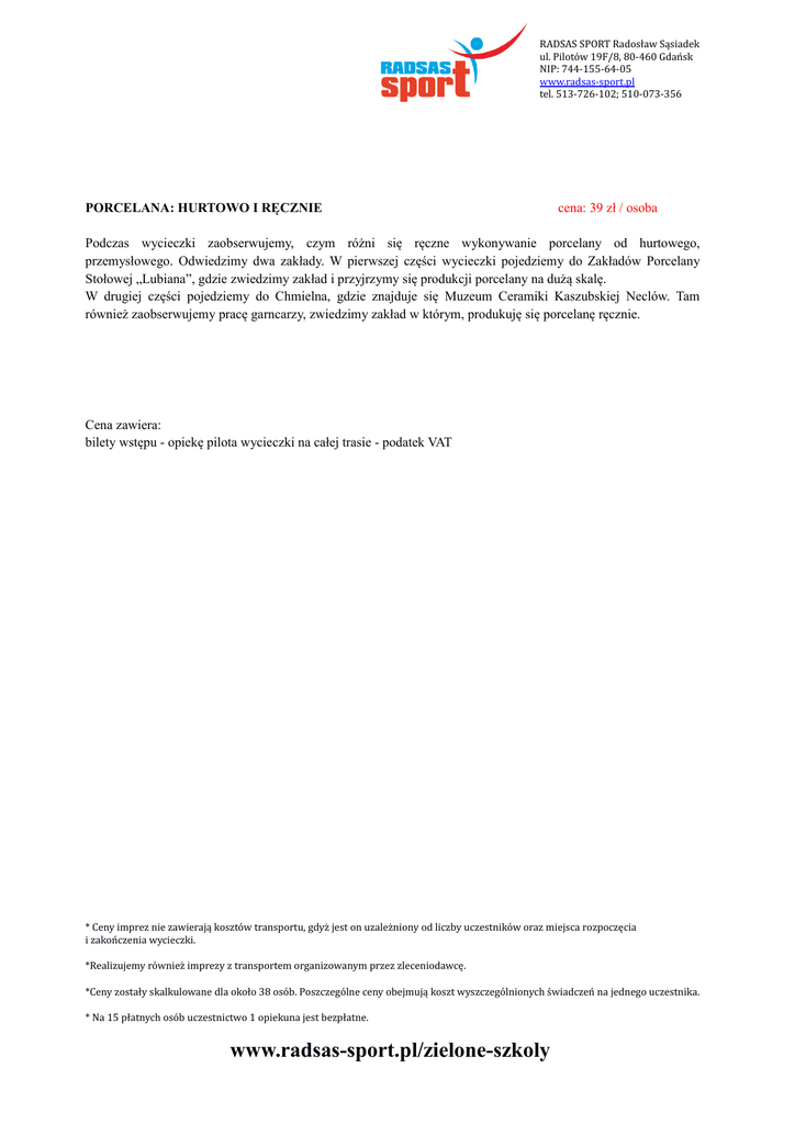 RADSAS SPORT Radosław Sąsiadek ul. Pilotów 19F/8, 80-460 Gdańsk NIP: 744-155-64-05 www.radsas-sport.pl tel. 513-726-102; 510-073-356 PORCELANA: HURTOWO I RĘCZNIE cena: 39 zł / osoba Podczas wycieczki zaobserwujemy, czym różni się ręczne wykonywanie porcelany od hurtowego, przemysłowego. Odwiedzimy dwa zakłady. W pierwszej części wycieczki pojedziemy do Zakładów Porcelany Stołowej „Lubiana”, gdzie zwiedzimy zakład i przyjrzymy się produkcji porcelany na dużą skalę. W drugiej części pojedziemy do Chmielna, gdzie znajduje się Muzeum Ceramiki Kaszubskiej Neclów. Tam również zaobserwujemy pracę garncarzy, zwiedzimy zakład w którym, produkuję się porcelanę ręcznie. Cena zawiera: bilety wstępu - opiekę pilota wycieczki na całej trasie - podatek VAT * Ceny imprez nie zawierają kosztów transportu, gdyż jest on uzależniony od liczby uczestników oraz miejsca rozpoczęcia i zakończenia wycieczki. *Realizujemy również imprezy z transportem organizowanym przez zleceniodawcę. *Ceny zostały skalkulowane dla około 38 osób. Poszczególne ceny obejmują koszt wyszczególnionych świadczeń na jednego uczestnika. * Na 15 płatnych osób uczestnictwo 1 opiekuna jest bezpłatne. www.radsas-sport.pl/zielone-szkoly