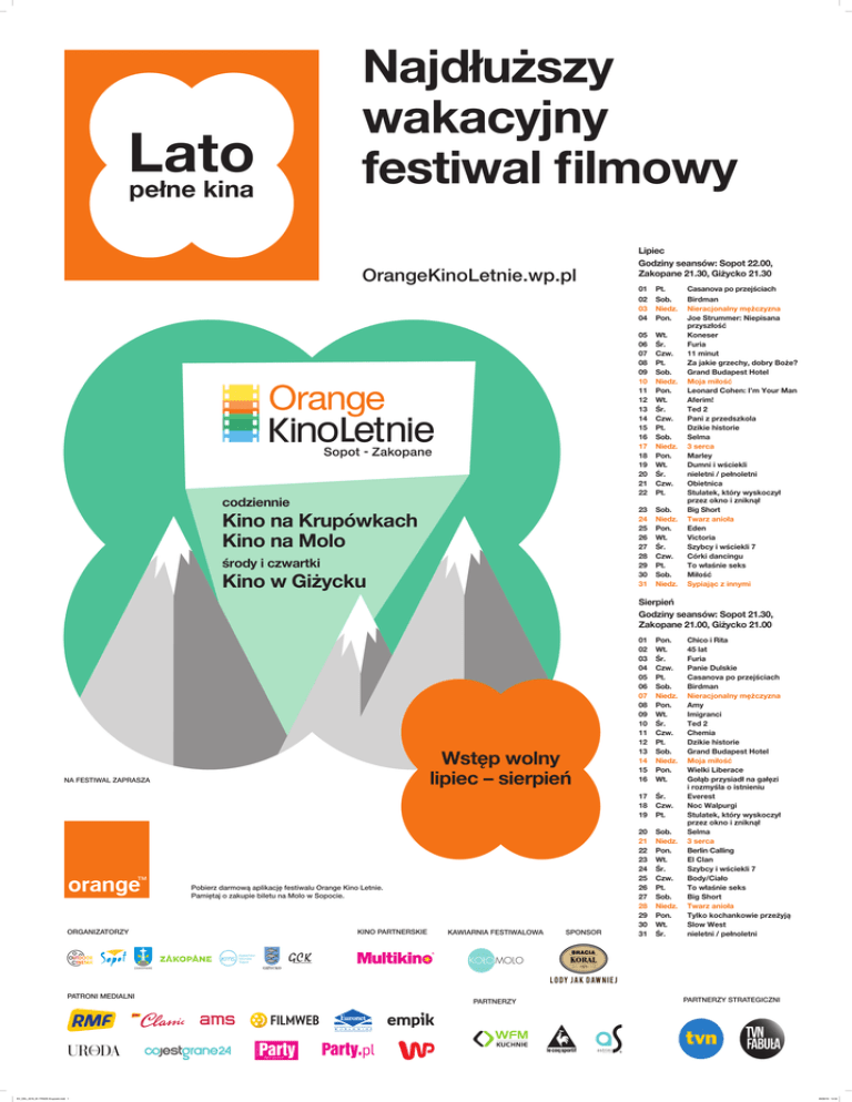 Lato pełne kina Najdłuższy wakacyjny festiwal filmowy OrangeKinoLetnie.wp.pl codziennie Kino na Krupówkach Kino na Molo środy i czwartki Kino w Giżycku Lipiec Godziny seansów: Sopot 22.00, Zakopane 21.30, Giżycko 21.30 01 Pt. Casanova po przejściach 02 03 04 Sob. Niedz. Pon. 05 06 07 08 09 10 11 12 13 14 15 16 17 18 19 20 21 22 Wt. Śr. Czw. Pt. Sob. Niedz. Pon. Wt. Śr. Czw. Pt. Sob. Niedz. Pon. Wt. Śr. Czw. Pt. 23 24 25 26 27 28 29 30 31 Sob. Niedz. Pon. Wt. Śr. Czw. Pt. Sob. Niedz. Birdman Nieracjonalny mężczyzna Joe Strummer: Niepisana przyszłość Koneser Furia 11 minut Za jakie grzechy, dobry Boże? Grand Budapest Hotel Moja miłość Leonard Cohen: I’m Your Man Aferim! Ted 2 Pani z przedszkola Dzikie historie Selma 3 serca Marley Dumni i wściekli nieletni / pełnoletni Obietnica Stulatek, który wyskoczył przez okno i zniknął Big Short Twarz anioła Eden Victoria Szybcy i wściekli 7 Córki dancingu To właśnie seks Miłość Sypiając z innymi Sierpień Godziny seansów: Sopot 21.30, Zakopane 21.00, Giżycko 21.00 Wstęp wolny lipiec – sierpień NA FESTIWAL ZAPRASZA Pobierz darmową aplikację festiwalu Orange Kino Letnie. Pamiętaj o zakupie biletu na Molo w Sopocie. ORGANIZATORZY PATRONI MEDIALNI KV_OKL_2016_B1-TRADE-Krupowki.indd 1 KINO PARTNERSKIE KAWIARNIA FESTIWALOWA PARTNERZY SPONSOR 01 02 03 04 05 06 07 08 09 10 11 12 13 14 15 16 Pon. Wt. Śr. Czw. Pt. Sob. Niedz. Pon. Wt. Śr. Czw. Pt. Sob. Niedz. Pon. Wt. 17 18 19 Śr. Czw. Pt. 20 21 22 23 24 25 26 27 28 29 30 31 Sob. Niedz. Pon. Wt. Śr. Czw. Pt. Sob. Niedz. Pon. Wt. Śr. Chico i Rita 45 lat Furia Panie Dulskie Casanova po przejściach Birdman Nieracjonalny mężczyzna Amy Imigranci Ted 2 Chemia Dzikie historie Grand Budapest Hotel Moja miłość Wielki Liberace Gołąb przysiadł na gałęzi i rozmyśla o istnieniu Everest Noc Walpurgi Stulatek, który wyskoczył przez okno i zniknął Selma 3 serca Berlin Calling El Clan Szybcy i wściekli 7 Body/Ciało To właśnie seks Big Short Twarz anioła Tylko kochankowie przeżyją Slow West nieletni / pełnoletni PARTNERZY STRATEGICZNI 29/06/16 14:34