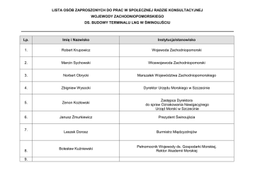 LISTA OSÓB ZAPROSZONYCH DO PRAC W SPOŁECZNEJ RADZIE KONSULTACYJNEJ WOJEWODY ZACHODNIOPOMORSKIEGO DS. BUDOWY TERMINALU LNG W ŚWINOUJŚCIU Lp. Imię i Nazwisko Instytucja/stanowisko 1. Robert Krupowicz Wojewoda Zachodniopomorski 2. Marcin Sychowski Wicewojewoda Zachodniopomorski 3. Norbert Obrycki Marszałek Województwa Zachodniopomorskiego 4. Zbigniew Wysocki Dyrektor Urzędu Morskiego w Szczecinie 5. Zenon Kozłowski 6. Janusz śmurkiewicz Prezydent Świnoujścia Leszek Dorosz Burmistrz Międzyzdrojów Bolesław Kuźniewski Pełnomocnik Wojewody ds. Gospodarki Morskiej, Rektor Akademii Morskiej 7. 8. 9. Zastępca Dyrektora do spraw Oznakowania Nawigacyjnego Urząd Morski w Szczecinie Waldemar Marzęcki Pełnomocnik Wojewody ds. Planowania i Zagospodarowania Przestrzennego 10. Maciej Trzeciak Wojewódzki Konserwator Przyrody 11. Henryka Okoniewska-Kall Dyrektor Wydziału Infrastruktury 12. ElŜbieta Piasecka Zastępca Dyrektora Wydziału Infrastruktury Oddział Architektury i Budownictwa 13. Małgorzata Kołodziej –Nowakowska Zachodniopomorski Wojewódzki Inspektor Ochrony Środowiska 14. Antoni Myłka Zachodniopomorski Wojewódzki Inspektor Nadzoru Geodezyjnego i Kartograficznego, 15. Ewa Stanecka 16. Ewa Madeja 17. Stanisław Latour Prezes Towarzystwa Urbanistów Polskich oddział w Szczecinie 18. Janusz Catewicz Prezes Zarządu Portów Morskich Szczecin i Świnoujście S.A. 19. Tadeusz Mutko Przewodniczący Wojewódzkiej Rady Ochrony Przyrody Zachodniopomorski Wojewódzki Konserwator Zabytków w Szczecinie Zachodniopomorski Wojewódzki Inspektor Nadzoru Budowlanego w Szczecinie 20. Janina Janowska Prezes Szczecińskiego Towarzystwa Naukowego 21. Andrzej Kreft Wojewódzka Rada ds. Ocen oddziaływania na Środowisko 22. Mieczysław Ołtarzewski Przewodniczący Rady Zachodniopomorskiej Okręgowej Izby InŜynierów Budownictwa 23. dr Andrzej Piotrowski p.o. dyrektora Państwowego Instytutu Geologicznego, Oddział w Szczecinie 24. prof. Władysław Buchholz Instytut Morski w Gdańsku, Oddział w Szczecinie Przedstawiciele Ekologów 25. prof. Stanisław Musielak 26. dr Andrzej Jarmaczek 27. dr Jacek Kaliciuk Przewodniczący Stowarzyszenia na Rzecz WybrzeŜa Prezes Klubu Przyrodników Prezes Zachodniopomorskiego Towarzystwa Przyrodniczego Lider OTOP Szczecińska Grupa 28. Grzegorz Kiljan 29 Marek Kalisiński Koordynator Komitetu Ochrony Orłów Region Pomorze Zachodnie 30. Jakub Szumin Prezes Federacji Zielonych „Gaja” 31. dr Magdalena Dzięgielewska Przewodnicząca Polskiego Towarzystwa Ochrony Przyrody ,,Salamandra” Akademickie Koło Chiropterologiczne Przewodniczący LigiOchrony Przyrody Zarząd Okręgu w Szczecinie 32. Władysław Krzempek 33. Ewa Halicka Przewodnicząca Związku Gmin Wyspy Wolin 34 Mirosław Sobala Stowarzyszenie Rozwoju Terenów Wiejskich Ekologii i Turystyki 35. Blandyna Migdalska Przewodnicząca Polskiego Klubu Ekologicznego Okręgu Zachodniopomorskiego 36 Magdalena Dzięgielewska Polskie Towarzystwo Ochrony Przyrody "Salamandra 37. Ryszard Miluniec Dyrektor Narodowej Fundacji Ochrony Środowiska Zakład Technicznych Usług Komunalnych 38. Barbara Zarga Zachodniopomorskie Towarzystwo Ekologii Praktycznej 39. Robert Wawręty Prezes Towarzystwa Na Rzecz Ziemi 40. Dariusz Szwed Prezes zarządu Biura Wspierania Lobbingu Ekologicznego 41. Wojciech Jankowski Wiceprezes Polskiego Towarzystwa Przyjaciół Przyrody "Pro Natura" 42. Ireneusz Chojnacki WWF Polska 43. Aleksander Nieczajew StraŜ Ochrony Przyrody Inspektorat Akademicki 44. Włodzimierz Kornaszewski Prezes Zarządu Polskiego Związku Wędkarskiego w Szczecinie 45. Janusz Nyk Prezes Zarządu Polskiego Związku Wędkarskiego w Koszalinie 46. Stanisław Gucma Akademia Morska w Szczecinie 47. Ireneusz Lewicki 48. Krzysztof Ziarnek Dyrektor Instytutu Melioracji i UŜytków Zielonych 49. Wojciech Zyska Przewodniczący Klubu Przyrodników 50. Przemysław Zyska Przewodniczący Zachodniopomorskiego Towarzystwa Ekologii Praktycznej 51. Ryszard Miluniec Dyrektor Narodowej Fundacji Ochrony Środowiska Dyrektor Wolińskiego Parku Narodowego Przedstawiciele Portu 52. 53. Anna Przychodzień Beata Płatkowska Specjalista ds. ochrony środowiska Port Handlowy Świnoujście Sp. z o.o. Specjalista ds. ochrony środowiska Zarząd Morskich Portów Szczecin i Świnoujście S.A. 54. Janusz Pietrewicz Specjalista ds. rozwoju portów Zarząd Morskich Portów Szczecin i Świnoujście S.A. Przedstawiciele Prezydenta Świnoujścia 55. Andrzej Lebdowicz Prezes Świnoujskiej Organizacji Turystycznej 56. Irena Dylewska Skarbnik Osiedla Warszów 57. Piotr Piwowarczyk Prezes Towarzystwa Naukowego im. Karola Estreichera (dzierŜawca Fortu Gerharda przy latarni morskiej) 58. Elzbieta Mitura Prezes Stowarzyszenia Grupa Morska „Cała Naprzód” 59. Piotr Głod Prezes Spółki „Uzdrowisko Świnoujście” S.A. 60. Tomasz Dziwota Kapitan śeglugi Wielkiej, były kapitan Portu Świnoujście Przedstawiciele PGNiG 61. 62. Tadeusz Zwierzyński BoŜena Anosowicz Wiceprezes Zarządu ds. Projektów Strategicznych Z-ca Dyrektora Biura Skroplonego Gazu Ziemnego LNG
