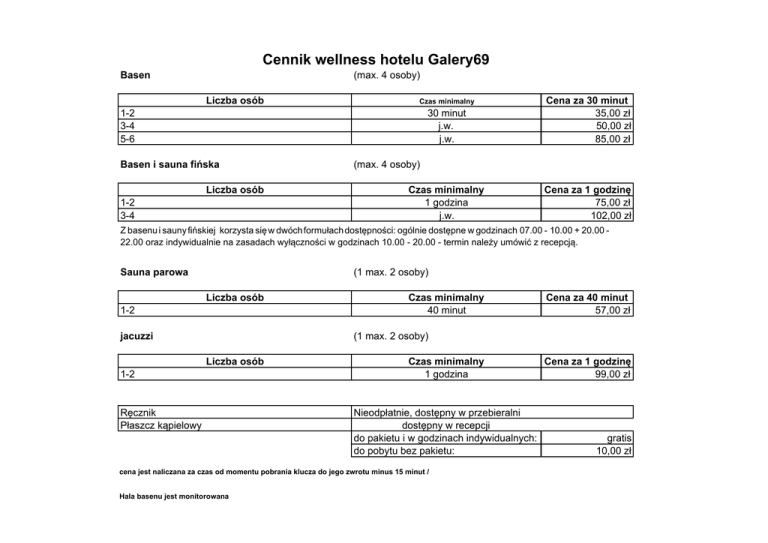Cennik wellness hotelu Galery69 Basen (max. 4 osoby) Liczba osób 30 minut j.w. j.w. Cena za 30 minut 35,00 zł 50,00 zł 85,00 zł Czas minimalny 1 godzina j.w. Cena za 1 godzinę 75,00 zł 102,00 zł Czas minimalny 1-2 3-4 5-6 Basen i sauna fińska Liczba osób 1-2 3-4 (max. 4 osoby) Z basenu i sauny fińskiej korzysta się w dwóch formułach dostępności: ogólnie dostępne w godzinach 07.00 - 10.00 + 20.00 22.00 oraz indywidualnie na zasadach wyłączności w godzinach 10.00 - 20.00 - termin należy umówić z recepcją. Sauna parowa (1 max. 2 osoby) Liczba osób 1-2 jacuzzi Czas minimalny 40 minut Cena za 40 minut 57,00 zł (1 max. 2 osoby) Liczba osób 1-2 Ręcznik Płaszcz kąpielowy Czas minimalny 1 godzina Nieodpłatnie, dostępny w przebieralni dostępny w recepcji do pakietu i w godzinach indywidualnych: do pobytu bez pakietu: cena jest naliczana za czas od momentu pobrania klucza do jego zwrotu minus 15 minut / Hala basenu jest monitorowana Cena za 1 godzinę 99,00 zł gratis 10,00 zł