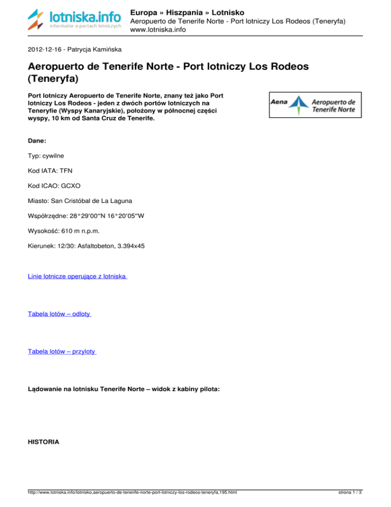 Europa » Hiszpania » Lotnisko Aeropuerto de Tenerife Norte - Port lotniczy Los Rodeos (Teneryfa) www.lotniska.info 2012-12-16 - Patrycja Kamińska Aeropuerto de Tenerife Norte - Port lotniczy Los Rodeos (Teneryfa) Port lotniczy Aeropuerto de Tenerife Norte, znany też jako Port lotniczy Los Rodeos - jeden z dwóch portów lotniczych na Teneryfie (Wyspy Kanaryjskie), położony w północnej części wyspy, 10 km od Santa Cruz de Tenerife. Dane: Typ: cywilne Kod IATA: TFN Kod ICAO: GCXO Miasto: San Cristóbal de La Laguna Współrzędne: 28°29′00″N 16°20′05″W Wysokość: 610 m n.p.m. Kierunek: 12/30: Asfaltobeton, 3.394x45 Linie lotnicze operujące z lotniska Tabela lotów – odloty Tabela lotów – przyloty Lądowanie na lotnisku Tenerife Norte – widok z kabiny pilota: HISTORIA http://www.lotniska.info/lotnisko,aeropuerto-de-tenerife-norte-port-lotniczy-los-rodeos-teneryfa,195.html strona 1 / 3 Europa » Hiszpania » Lotnisko Aeropuerto de Tenerife Norte - Port lotniczy Los Rodeos (Teneryfa) www.lotniska.info Aeropuerto de Tenerife Norte znany też jako Port lotniczy Los Rodeos to jeden z dwóch portów lotniczych na Teneryfie (Wyspy Kanaryjskie), położony w północnej części wyspy, w miejscowości San Cristóbal de La Laguna, w odległości 10 km od stolicy wyspy Santa Cruz de Tenerife. Port lotniczy Los Rodeos stanowi węzeł lotniczy dla ruchu pomiędzy wyspami archipelagu, obsługując również część ruchu pozawyspowego. 27 marca 1977 na lotnisku Los Rodeos doszło do największej pod względem liczby ofiar katastrofy lotniczej w historii lotnictwa – w zderzeniu na ziemi we mgle dwóch samolotów linii lotniczych zginęły 583 osoby. Lotnisko zostało otwarte w 1941 roku. Obecnie ruch lotniczy na tym lotnisku ma głównie charakter krajowy – 53% połączeń odbywa się do innych miast na Wyspach Kanaryjskich: Gran Canaria, La Palma, Lanzarote, Fuerteventura, El Hierro i La Gomera. Z lotniska istnieje także szereg połączeń do miast hiszpańskich na półwyspie. Najważniejsze połączenie dla Teneryfy to Madryt-Barajas, z ponad milionem pasażerów. W 2011 roku lotnisko zanotowało liczbę pasażerów w wysokości 4.095.103 oraz 62.604 operacji i 15.745 operacji ładunkowych. DOJAZD Autobus Linia autobusowa 102 łączy lotnisko ze stolicą wyspy (Santa Cruz) i portem znajdującym się w na północy (Puerto de la Cruz). Przystanek znajduje się na poziomie 0, przy wyjściu z terminalu. Ceny biletów: Aeropuerto-Santa Cruz: 2,55 €; Aeropuerto-Intercambiador La Laguna: 2,45 €; Aeropuerto-Puerto de la Cruz: 4,55 €. Taxi Postój taksówek znajduje się naprzeciwko budynku terminalu, na poziomie 0. Taksówkę zamówić można pod numerem telefonu: (+34) 922 255 555 / 922 258 806. Dodatkowa opłata w wysokości 1,65 € pobierana jest za kurs z/do lotniska, oraz z/do portu. Wynajem samochodu Na lotnisku Valladolid znajdują się następujące wypożyczalnie samochodów: Avis, Cicar, Europcar, Hertz. Wszelkich informacji o rezerwacji można dowiedzieć się korzystając ze stron internetowych firm. http://www.lotniska.info/lotnisko,aeropuerto-de-tenerife-norte-port-lotniczy-los-rodeos-teneryfa,195.html strona 2 / 3 Europa » Hiszpania » Lotnisko Aeropuerto de Tenerife Norte - Port lotniczy Los Rodeos (Teneryfa) www.lotniska.info Strona internetowa lotniska http://www.aena-aeropuertos.es/csee/Satellite/Aeropuerto-Tenerife-Norte/es/Inicio.html http://www.lotniska.info/lotnisko,aeropuerto-de-tenerife-norte-port-lotniczy-los-rodeos-teneryfa,195.html http://www.lotniska.info/lotnisko,aeropuerto-de-tenerife-norte-port-lotniczy-los-rodeos-teneryfa,195.html Powered by TCPDF (www.tcpdf.org) strona 3 / 3