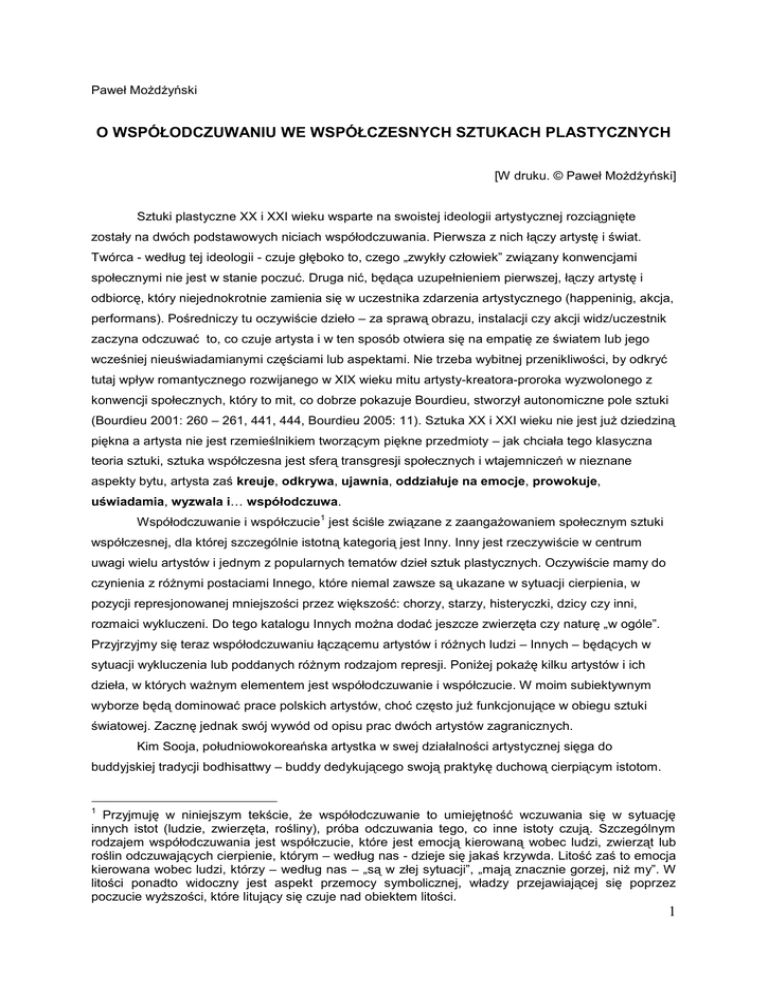 Paweł Możdżyński O WSPÓŁODCZUWANIU WE WSPÓŁCZESNYCH SZTUKACH PLASTYCZNYCH [W druku. © Paweł Możdżyński] Sztuki plastyczne XX i XXI wieku wsparte na swoistej ideologii artystycznej rozciągnięte zostały na dwóch podstawowych niciach współodczuwania. Pierwsza z nich łączy artystę i świat. Twórca - według tej ideologii - czuje głęboko to, czego „zwykły człowiek” związany konwencjami społecznymi nie jest w stanie poczuć. Druga nić, będąca uzupełnieniem pierwszej, łączy artystę i odbiorcę, który niejednokrotnie zamienia się w uczestnika zdarzenia artystycznego (happeninig, akcja, performans). Pośredniczy tu oczywiście dzieło – za sprawą obrazu, instalacji czy akcji widz/uczestnik zaczyna odczuwać to, co czuje artysta i w ten sposób otwiera się na empatię ze światem lub jego wcześniej nieuświadamianymi częściami lub aspektami. Nie trzeba wybitnej przenikliwości, by odkryć tutaj wpływ romantycznego rozwijanego w XIX wieku mitu artysty-kreatora-proroka wyzwolonego z konwencji społecznych, który to mit, co dobrze pokazuje Bourdieu, stworzył autonomiczne pole sztuki (Bourdieu 2001: 260 – 261, 441, 444, Bourdieu 2005: 11). Sztuka XX i XXI wieku nie jest już dziedziną piękna a artysta nie jest rzemieślnikiem tworzącym piękne przedmioty – jak chciała tego klasyczna teoria sztuki, sztuka współczesna jest sferą transgresji społecznych i wtajemniczeń w nieznane aspekty bytu, artysta zaś kreuje, odkrywa, ujawnia, oddziałuje na emocje, prowokuje, uświadamia, wyzwala i… współodczuwa. 1 Współodczuwanie i współczucie jest ściśle związane z zaangażowaniem społecznym sztuki współczesnej, dla której szczególnie istotną kategorią jest Inny. Inny jest rzeczywiście w centrum uwagi wielu artystów i jednym z popularnych tematów dzieł sztuk plastycznych. Oczywiście mamy do czynienia z różnymi postaciami Innego, które niemal zawsze są ukazane w sytuacji cierpienia, w pozycji represjonowanej mniejszości przez większość: chorzy, starzy, histeryczki, dzicy czy inni, rozmaici wykluczeni. Do tego katalogu Innych można dodać jeszcze zwierzęta czy naturę „w ogóle”. Przyjrzyjmy się teraz współodczuwaniu łączącemu artystów i różnych ludzi – Innych – będących w sytuacji wykluczenia lub poddanych różnym rodzajom represji. Poniżej pokażę kilku artystów i ich dzieła, w których ważnym elementem jest współodczuwanie i współczucie. W moim subiektywnym wyborze będą dominować prace polskich artystów, choć często już funkcjonujące w obiegu sztuki światowej. Zacznę jednak swój wywód od opisu prac dwóch artystów zagranicznych. Kim Sooja, południowokoreańska artystka w swej działalności artystycznej sięga do buddyjskiej tradycji bodhisattwy – buddy dedykującego swoją praktykę duchową cierpiącym istotom. 1 Przyjmuję w niniejszym tekście, że współodczuwanie to umiejętność wczuwania się w sytuację innych istot (ludzie, zwierzęta, rośliny), próba odczuwania tego, co inne istoty czują. Szczególnym rodzajem współodczuwania jest współczucie, które jest emocją kierowaną wobec ludzi, zwierząt lub roślin odczuwających cierpienie, którym – według nas - dzieje się jakaś krzywda. Litość zaś to emocja kierowana wobec ludzi, którzy – według nas – „są w złej sytuacji”, „mają znacznie gorzej, niż my”. W litości ponadto widoczny jest aspekt przemocy symbolicznej, władzy przejawiającej się poprzez poczucie wyższości, które litujący się czuje nad obiektem litości. 1 Kim Sooja medytuje na ulicach różnych miast w pozycji stojącej lub siedzącej, często w miejscach ogarniętych konfliktem zbrojnym. Medytowała na ulicach m.in. Nepalu (w trakcie przewrotu wojskowego) czy USA (wraz z matkami żołnierzy walczących w Iraku). Swe uliczne medytacje i inne dzieła (wyszywane tkaniny według tradycyjnych koreańskich wzorców) poświęca cierpiącym ludziom w konfliktach zbrojnych (Chrzanowska – Pieńkos 2003, Sooja 1983 - 2009). Ważną kategorią Innego w sztuce współczesnej jest „dziki”. Wiadomo, że awangardziści z początków XX wieku w różny sposób „dzikimi” się interesowali. Na malarstwo kubistyczne miały wpływ maski afrykańskie, różnymi przykładami „sztuki prymitywnej” fascynowali się surrealiści. W drugiej połowie XX wieku problem „dzikiego” był podejmowany przez artystów w inny już sposób. Często aborygeni różnych kontynentów byli ukazywani w postaci ofiar cywilizacji. Taka perspektywa też została zaprezentowana w akcji pt. „Kojot” („I Like America, America Likes Me”) jednego z najważniejszych artystów drugiej połowy XX wieku - Josepha Beuysa. Beuys zamknął się na kilka dni w klatce umieszczonej w jednej z galerii amerykańskich wraz z dzikim kojotem. Intencją tego performansu było zwrócenie uwagi publiczności na sytuację Indian, którzy zostali zamknięci w rezerwatach. Beuys ponadto chciał nawiązać – jak sam twierdził - kontakt z duchowym centrum rdzennej ludności amerykańskiej - kojot, jak wiadomo, był „świętym zwierzęciem” dawnych mieszkańców Ameryki (Beuys 1990: 66 – 68). Powyżej omówione prace ukierunkowane zostały na współodczuwanie z różnymi kategoriami „innych”, celem tych prac było ukazanie problemu, przewartościowanie, opowiedzenie historii innym językiem od obowiązującego. Nierzadko jednak w polu artystycznym XX i XXI wieku pojawiają się też artystyczne interwencje, których cel jest bardziej praktyczny – nie chodzi tylko już o ukazanie problemu, ale o wywarcie konkretnego wpływu na jakiś fragment rzeczywistości. Jednym z rodzajów takich przedsięwzięć podejmowanych przez współczesnych artystów są działania na rzecz dezalienacji, „wkluczenia” różnych mniejszości wypchniętych z głównego nurtu życia społecznego. W tej kategorii oczywiście zawierają się przedsięwzięcia Joanny R