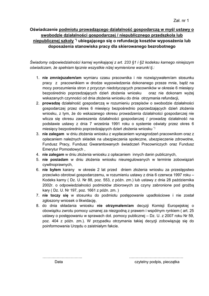 Zał. nr 1 Oświadczenie podmiotu prowadzącego działalność gospodarczą w myśl ustawy o swobodzie działalności gospodarczej / niepublicznego przedszkola lub niepublicznej szkoły *) ubiegającego się o refundację kosztów wyposażenia lub doposażenia stanowiska pracy dla skierowanego bezrobotnego Świadomy odpowiedzialności karnej wynikającej z art. 233 §1 i §2 kodeksu karnego niniejszym oświadczam, że spełniam łącznie wszystkie niżej wymienione warunki tj.: 1. nie zmniejszałem/am wymiaru czasu pracownika i nie rozwiązywałem/am stosunku pracy z pracownikiem w drodze wypowiedzenia dokonanego przeze mnie, bądź na mocy porozumienia stron z przyczyn niedotyczących pracowników w okresie 6 miesięcy bezpośrednio poprzedzających dzień złożenia wniosku oraz nie dokonam wyżej wskazanych czynności od dnia złożenia wniosku do dnia otrzymania refundacji, 2. prowadzę działalność gospodarczą w rozumieniu przepisów o swobodzie działalności gospodarczej przez okres 6 miesięcy bezpośrednio poprzedzających dzień złożenia wniosku, z tym, że do wskazanego okresu prowadzenia działalności gospodarczej nie wlicza się okresu zawieszenia działalności gospodarczej / prowadzę działalność na podstawie ustawy z dnia 7 września 1991 roku o systemie oświaty przez okres 6 miesięcy bezpośrednio poprzedzających dzień złożenia wniosku *) 3. nie zalegam w dniu złożenia wniosku z wypłacaniem wynagrodzeń pracownikom oraz z opłacaniem należnych składek na ubezpieczenia społeczne, ubezpieczenie zdrowotne, Fundusz Pracy, Fundusz Gwarantowanych świadczeń Pracowniczych oraz Fundusz Emerytur Pomostowych , 4. nie zalegam w dniu złożenia wniosku z opłacaniem innych danin publicznych, 5. nie posiadam w dniu złożenia wniosku nieuregulowanych w terminie zobowiązań cywilnoprawnych, 6. nie byłem karany w okresie 2 lat przed dniem złożenia wniosku za przestępstwo przeciwko obrotowi gospodarczemu, w rozumieniu ustawy z dnia 6 czerwca 1997 roku – Kodeks karny ( Dz. U. Nr 88, poz. 553, z późn. zm.) lub ustawy z dnia 28 października 2002r. o odpowiedzialności podmiotów zbiorowych za czyny zabronione pod groźbą kary ( Dz. U. Nr 197, poz. 1661 z późn. zm. ) 7. nie toczy się w stosunku do podmiotu postępowanie upadłościowe i nie został zgłoszony wniosek o likwidację, 8. do dnia składania wniosku nie otrzymałem/am decyzji Komisji Europejskiej o obowiązku zwrotu pomocy uznanej za niezgodną z prawem i wspólnym rynkiem ( art. 25 ustawy o postępowaniu w sprawach dot. pomocy publicznej – Dz. U. z 2007 roku Nr 59, poz. 404 z późn. zm.). W przypadku otrzymania takiej decyzji zobowiązuję się do poinformowania Urzędu o zaistniałym fakcie. …………………………. Data …………………………………… czytelny podpis, pieczątka Zał. nr 1 Oświadczenie producenta rolnego ubiegającego się o refundacje kosztów wyposażenia lub doposażenia stanowisk pracy dla skierowanych bezrobotnych Świadomy odpowiedzialności karnej wynikającej z art. 233 §1 i §2 kodeksu karnego niniejszym oświadczam, że spełniam łącznie wszystkie niżej wymienione warunki tj.: 1. nie zmniejszałem/am wymiaru czasu pracownika i nie rozwiązywałem/am stosunku pracy z pracownikiem w drodze wypowiedzenia dokonanego przeze mnie, bądź na mocy porozumienia stron z przyczyn niedotyczących pracowników w okresie 6 miesięcy bezpośrednio poprzedzających dzień złożenia wniosku oraz nie dokonam wyżej wskazanych czynności od dnia złożenia wniosku do dnia otrzymania refundacji, 2. nie zalegam w dniu złożenia wniosku z wypłacaniem wynagrodzeń pracownikom oraz z opłacaniem należnych składek na ubezpieczenia społeczne, ubezpieczenie zdrowotne, Fundusz Pracy, Fundusz Gwarantowanych Świadczeń Pracowniczych oraz Fundusz Emerytur Pomostowych , 3. nie zalegam w dniu złożenia wniosku z opłacaniem innych danin publicznych, 4. nie posiadam w dniu złożenia wniosku nieuregulowanych w terminie zobowiązań cywilnoprawnych, 5. nie byłem karany w okresie 2 lat przed dniem złożenia wniosku za przestępstwo przeciwko obrotowi gospodarczemu, w rozumieniu ustawy z dnia 6 czerwca 1997 roku – Kodeks karny ( Dz. U. Nr 88, poz. 553, z późn. zm.) lub ustawy z dnia 28 października 2002r. o odpowiedzialności podmiotów zbiorowych za czyny zabronione pod groźbą kary ( Dz. U. Nr 197, poz. 1661 z późn. zm. ) 6. do dnia składania wniosku nie otrzymałem/am decyzji Komisji Europejskiej o obowiązku zwrotu pomocy uznanej za niezgodną z prawem i wspólnym rynkiem ( art. 25 ustawy o postępowaniu w sprawach dot. Pomocy publicznej – Dz. U. z 2007 roku Nr 59, poz. 404 z późn. zm.) W przypadku otrzymania takiej decyzji zobowiązuję się do poinformowania Urzędu o zaistniałym fakcie, 7. posiadam gospodarstwo rolne w rozumieniu przepisów o podatku rolnym lub prowadzeniu działu specjalnego produkcji rolnej w rozumieniu przepisów o podatku dochodowym od osób fizycznych lub przepisów o podatku dochodowym od osób prawnych przez okres co najmniej 6 miesięcy bezpośrednio poprzedzających dzień złożenia wniosku. Jednocześnie w załączeniu przestawiam dokumenty potwierdzające zatrudnienie w okresie 6 miesięcy bezpośrednio poprzedzających dzień złożenia wniosku w każdym miesiącu, co najmniej jednego pracownika, na podstawie stosunku pracy w pełnym wymiarze czasu pracy oraz dokumenty potwierdzające jego ubezpieczenie . …………………………. Data …………………………………… czytelny podpis, pieczątka