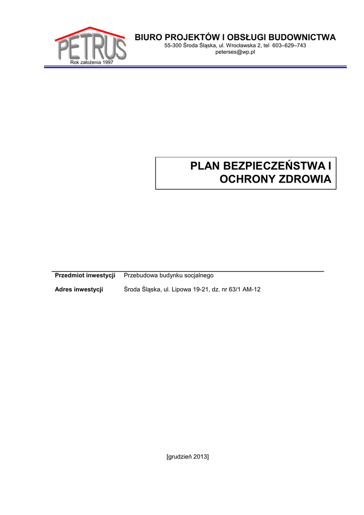 BIURO PROJEKTÓW I OBSŁUGI BUDOWNICTWA Strona tytułowa 55-300 Środa Śląska, ul. Wrocławska 2, tel 603–629–743 [email protected] Rok założenia 1997 PLAN BEZPIECZEŃSTWA I OCHRONY ZDROWIA Przedmiot inwestycji Przebudowa budynku socjalnego Adres inwestycji Środa Śląska, ul. Lipowa 19-21, dz. nr 63/1 AM-12 [grudzień 2013] PLAN BIOZ – Przebudowa budynku socjalnego, ul. Lipowa 19-21, dz. nr 63/1 AM-12 BIURO PROJEKTÓW I OBSŁUGI BUDOWNICTWA 55-300 Środa Śląska, ul. Wrocławska 2, tel. 603–629–743; [email protected] Rok założenia 1997 Przedmiot opracowania Plan bezpieczeństwa i ochrony zdrowia Przedmiot inwestycji Przebudowa budynku socjalnego Adres inwestycji Środa Śląska, ul. Lipowa 19-21, dz. nr 63/1 AM-12 Inwestor Gmina Środa Śląska Adres Inwestora Opracował pl. Wolności 5, 55 – 300 Środa Śląska mgr inż. Piotr Sudoł Proj. spec. arch w ogr. upr. bud. nr 154/DOŚ/11 Proj. w spec. konstr.-bud. bez ogr. upr. bud. nr 430/01/DUW -2- PLAN BIOZ – Przebudowa budynku socjalnego, ul. Lipowa 19-21, dz. nr 63/1 AM-12 Informacja dotycząca bezpieczeństwa i ochrony zdrowia Niniejszy plan bezpieczeństwa i ochrony zdrowia opracowano na podstawie : 1. Rozporządzenia Ministra Infrastruktury z dnia 23 czerwca 2003 r. w sprawie szczegółowego zakresu i formy planu bezpieczeństwa i ochrony zdrowia oraz szczegółowego zakresu rodzajów robót budowlanych, stwarzających zagrożenia bezpieczeństwa i zdrowia ludzi. (Dz. U. Nr 120, poz. 1126) 2. art. 21 a ust. 1 i 2 ustawy z dnia 7 lipca 1994 r. – Prawo budowlane (tekst jednolity Dz. U. z 2003 r. Nr 207 poz. 2016) I. CZĘŚĆ OPISOWA 1. Zakres robót dla całego zamierzenia budowlanego oraz kolejność realizacji poszczególnych obiektów Do realizacji przewidziano wykonanie następujących obiektów (wg kolejności ich wykonywania): Przebudowa budynku socjalnego w Środzie Śląskiej przy ul. Lipowa 19-21, dz. nr 63/1 AM - 12 Zakres i kolejność robót do wykonanie: ⇒ Roboty rozbiórkowe ⇒ Roboty ziemne ⇒ Roboty fundamentowe ⇒ Izolacje przeciwwilgociowe ⇒ Ściany konstrukcyjne w poziomie parteru ⇒ Strop nad parterem ⇒ Więźba dachowa ⇒ Pokrycie dachowe ⇒ Stolarka okienna i drzwiowa zewnętrzna ⇒ Izolacja termiczna ścian zewnętrznych ⇒ Warstwy posadzkowe w poziomie przyziemia ⇒ Ścianki działowe ⇒ Instalacje wewnętrzne ⇒ Tynki wewnętrzne ⇒ Posadzki i okładziny ścian ⇒ Malowanie ⇒ Roboty wykończeniowe Uwaga : Opisany powyżej zakres robót i ich charakter kierownik budowy zobowiązany jest do sporządzenia planu BIOZ. 2. Wykaz istniejących obiektów budowlanych podlegających adaptacji lub rozbiórce Nie występują. 3. Wskazanie elementów zagospodarowania działki lub terenu, które mogą stwarzać zagrożenie bezpieczeństwa i zdrowia ludzi; Nie występują. 4. Informacje dotyczące przewidywanych zagrożeń występujących podczas realizacji robót budowlanych, określające skalę i rodzaje zagrożeń oraz miejsce i czas ich wystąpienia; W trakcie realizacji zagrożenie stwarzać będzie wykonywanie następujących rodzajów robót : a) roboty, przy których wykonywaniu występuje ryzyko upadku z wysokości ponad 5m, Zagrożenie to będzie występowała podczas wykonywania : ⇒ murowanie ścian zewnętrznych ⇒ wykonywanie izolacji termicznej ścian zewnętrznych ⇒ montaż więźby dachowej ⇒ wykonywanie pokrycia dachowego. 5. Wykaz istniejących obiektów budowlanych podlegających adaptacji lub rozbiórce Nie występują. 6. Informację o wydzieleniu i oznakowaniu miejsca prowadzenia robót budowlanych, stosownie do rodzaju zagrożenia; -3- PLAN BIOZ – Przebudowa budynku socjalnego, ul. Lipowa 19-21, dz. nr 63/1 AM-12 Ogrodzenie terenu budowy Teren budowy lub robót powinien być zabezpieczony ogrodzeniem. Ogrodzenie placu budowy powinno być tak wykonane, aby nie stwarzało zagrożenia dla pracowników jak i osób trzecich. Wysokość ogrodzenia powinna wynosić co najmniej 1,5m. Drogi i ciągi piesze na placu budowy powinny być utrzymane we właściwym stanie technicznym. Nie wolno na nich składować materiałów, sprzętu lub innych przedmiotów. Jeżeli w związku z wykonywanymi robotami został zamknięty przejazd dla pojazdów, miejsce to należy oznakować zgodnie z przepisami o ruchu na drogach publicznych. Drogi komunikacyjne Obowiązkiem inwestora jest zapewnienie na terenie budowy wykonania i oznakowania, zgodnie z Polskimi Normami i właściwymi przepisami, dróg komunikacyjnych i transportowych, dróg dla pieszych i dojazdów pożarowych oraz utrzymania ich w stanie nie stwarzającym zagrożeń dla użytkowników. Drogi i przejścia oraz dojazdy pożarowe nie mogą prowadzić przez miejsca, w których występują zagrożenia dla ich użytkowników. Drogi komunikacyjne dla wózków i taczek nie mogą być nachylone więcej niż: 1) dla wózków bezszynowych - 5%; 2) dla taczek - 10%. W przypadku dróg komunikacyjnych dla wózków i taczek, usytuowanych nad poziomem terenu powyżej 1m, należy przewidzieć zabezpieczenie balustradą, składającą się z deski krawężnikowej o wysokości 0,15m i poręczy ochronnej umieszczonej na wysokości 1,1m. Wolną przestrzeń pomiędzy deską krawężnikową a poręczą wypełnia się w sposób zabezpieczający pracowników przed upadkiem z wysokości. W przypadku rusztowań systemowych (konstrukcji budowlanej, tymczasowej, w której wymiary siatki konstrukcyjnej są jednoznacznie narzucone poprzez wymiary elementów rusztowania, służącej do utrzymywania osób, materiałów i sprzętu) dopuszcza się umieszczanie poręczy ochronnej na wysokości 1m. Ciągi piesze Szerokość drogi przeznaczonej dla ruchu pieszego jednokierunkowego powinna wynosić co najmniej 0,75m, a dwukierunkowego - 1,2m. Przejścia powinny być oświetlone i oznakowane znakami ostrzegawczymi lub znakami zakazu. Przejścia o pochyleniu większym niż 15% zaopatruje się w listwy umocowane poprzecznie, w odstępach nie mniejszych