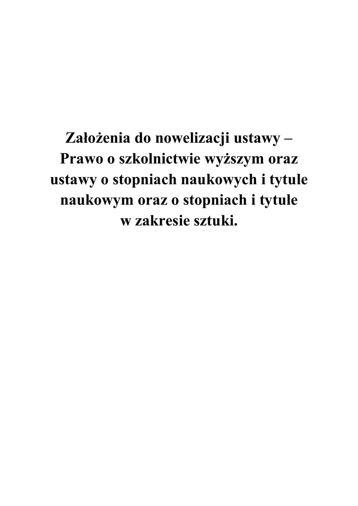 Założenia do nowelizacji ustawy – Prawo o szkolnictwie wyższym oraz ustawy o stopniach naukowych i tytule naukowym oraz o stopniach i tytule w zakresie sztuki. Założenia do nowelizacji ustawy – Prawo o szkolnictwie wyższym oraz ustawy o stopniach naukowych i tytule naukowym oraz o stopniach i tytule w zakresie sztuki. I. Potrzeby i cel uchwalenia zmian w ustawach…………………………………3 II. Aktualny stan stosunków społecznych w nauce i szkolnictwie wyższym……4 III. Aktualny stan prawny……………………………...……………………….14 IV. Możliwości podjęcia alternatywnych środków…………………………….15 V. Podmioty na które będą oddziaływać projektowane ustawy……………..…15 VI. Przewidywane skutki finansowe…………………………...………...…….16 VII. Propozycje rozstrzygnięć i ich uzasadnienie………...……………….…...17 1. Nowy model zarządzania szkolnictwem wyższym..……………...….….17 2. Model kariery naukowej……...…………………………………...…….32 3. Studia i studenci…………………………………………..……….…….42 VIII. Przepisy przejściowe i dostosowujące……………………………………49 IX. Przepisy upoważniające……………………..…...……………...…………50 X. Termin wejścia w życie…………………………………………….……….54 XI. Ocena przewidywanych skutków (kosztów i korzyści) społecznogospodarczych regulacji…………...………….…………….………………….54 2 I. Potrzeby i cel uchwalenia zmian w ustawach Obecny system szkolnictwa wyższego w Polsce jest niewystarczająco konkurencyjny na europejskim rynku edukacyjnym. W obliczu zbliżającego się głębokiego niżu demograficznego oraz reform, które przeprowadzane są we wszystkich krajach Unii Europejskiej niezbędne jest wprowadzenie zmian legislacyjnych, które doprowadzą do tego, aby nauka polska – podobnie jak zasilane nią szkolnictwo wyższe – mogły lepiej konkurować ze światem, a dla studentów i uczonych spoza Polski polskie środowisko akademickie stało się bardziej atrakcyjne. Reforma szkolnictwa wyższego odpowiadająca wyzwaniom cywilizacyjnym i ogólnoświatowym trendom jest dla Polski wyzwaniem o charakterze strategicznym, pozwalającym na wprowadzenie do naszego systemu najlepszych rozwiązań instytucjonalnych, prawnych i organizacyjnych sprawdzonych w krajach o najwyższym poziomie rozwoju społecznogospodarczego. Dokonanie projektowanych zmian systemowych powinno zapewnić polskim studentom wysokiej jakości kształcenie, polskim uczonym przyniesie szansę uczestnictwa w największych międzynarodowych przedsięwzięciach badawczych, a polskim uczelniom stworzy perspektywy systematycznego rozwoju i stałego zwiększania potencjału badawczo-dydaktycznego. Jednym z kluczowych środków służących osiągnięciu wyżej wymienionych celów jest stworzenie mechanizmów bardziej racjonalnego finansowania szkolnictwa wyższego opartego na osiągniętych efektach pracy naukowej i dydaktycznej. Służyć temu ma zmiana sposobu finansowania uczelni tak, aby coraz większa liczba funduszy rozdysponowywana była w drodze konkursów, a zakres finansowania z budżetu państwa zależał docelowo od jakości uczelni. Proponowane rozwiązania dotyczące zarówno systemu zarządzania szkołami wyższymi, modelu kariery akademickiej oraz praw i obowiązków studentów służyć mają też zmianie modelu kształcenia i ukierunkowaniu go na lepsze przygotowanie absolwentów, którzy posiadać będą nie tylko najnowszą, uniwersalną wiedzę, ale także umiejętności zgodne z wyzwaniami cywilizacyjnymi XXI wieku i potrzebami wynikającymi z rozwoju gospodarczego Polski. Przedstawione propozycje w systemie zarządzania uczelniami zmierzają przede wszystkim do zwiększenia autonomii szkół wyższych w zakresie prowadzenia dydaktyki. Wszystkie uczelnie zostaną uwolnione od skomplikowanych centralnych procedur administracyjnych, natomiast najlepsze otrzymają pełną swobodę w zakresie tworzenia autorskich, innowacyjnych i interdyscyplinarnych kierunków studiów. Promocji najlepszych służyć będzie również silniejsze powiązanie finansowania z efektami działalności dydaktycznej i naukowej. Wyłonione zostaną KNOW-y – Krajowe Naukowe Ośrodki Wiodące. Będzie to pierwszy krok w kierunku stworzenia w Polsce uczelni flagowych wyróżniających się jakością badań naukowych i dydaktyki w skali Europy. Priorytetowo będą również jednak traktowane te uczelnie, które poprzez integrację z regionalnym rynkiem pracy, środowiskiem gospodarczym oraz otoczeniem społecznym realizować będą zadania naukowo-badawcze specyficzne dla regionu. Jednym z instrumentów, który pozwoli na bardziej dynamiczną współpracę uczelni z otoczeniem społeczno-gospodarczym będzie wprowadzenie możliwości powołania rektora w drodze otwartego konkursu oraz zwiększenie jego kompetencji i zakresu odpowiedzialności. Drugim elementem reformy jest kariera naukowa. Struktura wiekowa oraz sposób awansu w Polsce znacząco odbiegają od standardów światowych. Stan ten nie znajduje uzasadnienia w osiągnięciach naukowych takich jak publikacje w międzynarodowych pismach recenzowanych, ilość i jakość cytowań, patenty, granty z instytucji zagranicznych: niski poziom powyższych 3 wskaźników nie odzwierciedla polskiego potencjału naukowego. Punktem zwrotnym mogą okazać się proponowane mechanizmy mające na celu podniesienie poziomu doktoratów, uproszczenie procedury habilitacyjnej, rozliczanie pracowników naukowych i naukowo-dydaktycznych z realnych osiągnięć naukowych oraz otwarcie uczelni na wybitnych naukowców z zagranicy. Filarem reformy są również rozwiązania dotyczące studentów. Mają one na celu zniesienie barier, szczególnie dla studentów pochodzących z rodzi