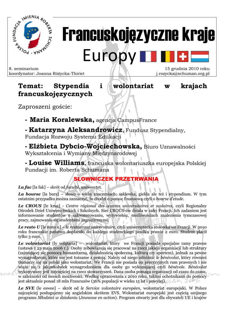Francuskojęzyczne kraje Europy 8. seminarium koordynator: Joanna Różycka-Thiriet 15 grudnia 2010 roku [email protected] [email protected] Temat: Stypendia francuskojęzycznych i wolontariat w krajach Zaproszeni goście: - Maria Koralewska, agencja CampusFrance - Katarzyna Aleksandrowicz, Fundusz Stypendialny, Fundacja Rozwoju Systemu Edukacji - Elżbieta Dybcio-Wojciechowska, Biuro Uznawalności Wykształcenia i Wymiany Międzynarodowej - Louise Williams, francuska wolontariuszka europejska Polskiej Fundacji im. Roberta Schumana SŁOWNICZEK PRZETRWANIA La fac [la fak] – skrót od faculté, uniwesytet. La bourse [la burs] – słowo o wielu znaczeniach: sakiewka, giełda ale też i stypendium. W tym ostatnim przypadku można zaznaczyć, że chodzi o pomoc finansową czyli o bourse d’etude. Le CROUS [le kruz] - Centre régional des œuvres universitaires et scolaires, czyli Regionalny Ośrodek Dzieł Uniwersyteckich i Szkolnych. Sieć CROUS-ów działa w całej Francji. Ich zadaniem jest informowanie studentów o zakwaterowaniu, wyżywieniu, możliwościach znalezienia tymczasowej pracy, zajmowanie się studentami zagranicznymi. Le resto U [le resto u] – le restaurant universitaire, czyli uniwersytecka stołówka we Francji. W 2010 roku francuskie państwo dopłacało do każdego studenckiego posiłku prawie 2 euro. Student płacił tylko 3 euro. Le volontariat [ly volątaria] – wolontariat, który we Francji posiada specjalne ramy prawne (ustawa z 23 maja 2006 r.). Osoby zobowiązują się pracować na rzecz jakiejś organizacji lub struktury (zajmującej się pomocą humanitarną, działalnością społeczną, kulturą czy sportem), jednak za pewne wynagrodzenie, które nie jest tożsame z pensją. Należy od niego odróżnić le bénévolat, który również tłumaczy się na polski jako wolontariat. We Francji nie posiada on precyzyjnych ram prawnych i nie wiąże się z jakimkolwiek wynagrodzeniem dla osoby go wykonującej czyli bénévole. Bénévolat wykonywany jest najczęściej na rzecz stowarzyszeń. Dana osoba pomaga organizacji od czasu do czasu, w zależności od swoich możliwości. Według opracowania z 2010 roku, takimi ochotnikami do pomocy jest aktualnie ponad 18 mln Francuzów (36% populacji w wieku 15 lat i powyżej). Le SVE (le eswee] – skrót od le Service volontaire européen, wolontariat europejski. W Polsce najczęściej posługujemy się angielskim skrótem EVS. Wolontariat europejski jest częścią unijnego programu Młodzież w działaniu (Jeunesse en action). Program otwarty jest dla obywateli UE i krajów partnerskich mających od 18 do 30 roku życia. Wolontariat europejski daje możliwość wyjazdu do innego kraju unijnego lub partnerskiego na 2 do 12 miesięcy. W tym okresie wolontariusz wykonuje w przyjmującej go organizacji pracę najczęściej o charakterze społecznym, rozwijając jednocześnie własne umiejętności. Aby zostać wolontariuszem nie potrzebny jest konkretny dyplom lub znajomość języka. Komisja Europejska opłaca koszty pobytu wolontariusza (zakwaterowanie, wyżywienie, kieszonkowe, ubezpieczenie). PORTRETY MNIEJ ZNANYCH MĘŻCZYZN I KOBIET Minister szkolnictwa wyższego i badań Valérie Pécresse jest absolwentką dwóch wielkich szkół - Ecole des hautes études commerciales (HEC) i Ecole nationale d’administration (ENA). Była rzeczniczka UMP podobno bywała nazywana „prawicową Ségolène” (w nawiązaniu do socjalistki Ségolène Royal). Niegdyś związana z otoczeniem Jacques’a Chiraca, ministrem została dopiero w rządzie François Fillon. Mimo napotkanych trudności w reformowaniu szkolnictwa wyższego (w tym protestów i okupacji uniwersytetów), utrzymuje się w kolejnych rządach Fillon od 2007 roku i to ciągle w tym samym resorcie. Od kilku lat francuskie szkolnictwo wyższe reformuje się, aby dostosować się do nowych wyzwań związanych np. z rynkiem pracy. Nazwisko minister nosi uchwalona w sierpniu 2007 roku ustawa o wolnościach i obowiązkach uniwersytetu (la loi Pércresse, nazywana też ustawą o autonomii uniwersytetów). W efekcie tej reformy w roku akademickim 2010/2011 autonomicznych będzie już 90% francuskich uniwersytetów. Rektorzy takich uczelni mają np. większą swobodę w prowadzeniu polityki kadrowej, dysponują całym budżetem danej uczelni. W 2009 roku nie bez oporów środowiska Pércresse zmieniła też dekret o statusie wykładowców – badaczy. Naukowcy uniwersyteccy zyskali większą elastyczność co do podziału czasu przeznaczonego na dydaktykę i badania. Ich praca będzie również co cztery lata oceniana. Zmieniają się zasady awansu. W 2010 roku najbardziej popularnymi wśród maturzystów kierunkami były prawo-ekonomiazarządzanie (26,44%). INTERNET – CO W TRAWIE PISZCZY Ciekawe strony strony internetowe o stypendiach: - Campus France - www.campusfrance.org - Ambasada Francji w Polsce – www.ambafrance-pl.org/france_pologne/spip.php?rubrique142 - Biuro Współpracy z Zagranicą Uniwersytetu Warszawskiego - www.bwz.uw.edu.pl - Fundusz stypendialny – stypendia doktorancie i postdoktorancie w Szwajcarii - www.sciex.pl - Biuro Uznawalności Wykształcenia i Wymiany Międzynarodowej – stypendia w różnych krajach europejskich i nie tylko - www.buwiwm.edu.pl O wolontariacie europejskim: - Program Młodzież w Działaniu, Agencja Narodowa w Polsce - http://mlodziez.org.pl - Polska Fundacja im. Roberta Schumana http://schuman.org.pl/index.php?option=com_content&view=article&id=101&Itemid=73&lang=pl JAK TO SIĘ JE, CZYLI O FRANCUSKICH ZWYCZAJACH Bonnes fêtes de fin d’année- Szczęśliwych świąt końca roku, to tradycyjna formułka wymieniana przez Francuzów w okolicach świąt Bożego Narodzenia. Ponieważ Francja jest krajem różnorakich religii, laickim i zateizowanym, zwrot ten jest bezpieczniejszy niż Joyeux Noel (Wesołych świąt Bożego Narodzenia), który odnosi się już bezpośrednio święta religijnego. Partnerem seminariów jest Funda