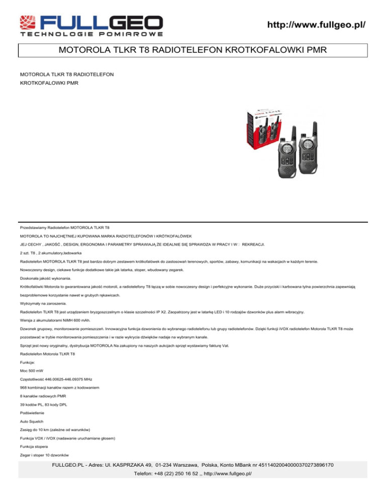 http://www.fullgeo.pl/ MOTOROLA TLKR T8 RADIOTELEFON KROTKOFALOWKI PMR MOTOROLA TLKR T8 RADIOTELEFON KROTKOFALOWKI PMR Przedstawiamy Radiotelefon MOTOROLA TLKR T8 MOTOROLA TO NAJCHĘTNIEJ KUPOWANA MARKA RADIOTELEFONÓW I KRÓTKOFALÓWEK JEJ CECHY , JAKOŚĆ , DESIGN, ERGONOMIA I PARAMETRY SPRAWIAJĄ ŻE IDEALNIE SIĘ SPRAWDZA W PRACY I W REKREACJI. 2 szt. T8 , 2 akumulatory,ładowarka Radiotelefon MOTOROLA TLKR T8 jest bardzo dobrym zestawem krótkofalówek do zastosowań terenowych, sportów, zabawy, komunikacji na wakacjach w każdym terenie. Nowoczesny design, ciekawe funkcje dodatkowe takie jak latarka, stoper, wbudowany zegarek. Doskonała jakość wykonania. Krótkofalówki Motorola to gwarantowana jakość motoroli, a radiotelefony T8 łączą w sobie nowoczesny design i perfekcyjne wykonanie. Duże przyciski i karbowana tylna powierzchnia zapewniają bezproblemowe korzystanie nawet w grubych rękawicach. Wytrzymały na zaroszenia. Radiotelefon TLKR T8 jest urządzeniem bryzgoszczelnym o klasie szczelności IP X2. Zaopatrzony jest w latarkę LED i 10 rodzajów dzwonków plus alarm wibracyjny. Wersja z akumulatorami NiMH 600 mAh. Dzwonek grupowy, monitorowanie pomieszczeń. Innowacyjna funkcja dzwonienia do wybranego radiotelefonu lub grupy radiotelefonów. Dzięki funkcji iVOX radiotelefon Motorola TLKR T8 może pozostawać w trybie monitorowania pomieszczenia i w razie wykrycia dźwięków nadaje na wybranym kanale. Sprzęt jest nowy oryginalny, dystrybucja MOTOROLA Na zakupiony na naszych aukcjach sprzęt wystawiamy fakturę Vat. Radiotelefon Motorola TLKR T8 Funkcje: Moc 500 mW Częstotliwość 446.00625-446.09375 MHz 968 kombinacji kanałów razem z kodowaniem 8 kanałów radiowych PMR 39 kodów PL, 83 kody DPL Podświetlenie Auto Squelch Zasięg do 10 km (zależne od warunków) Funkcja VOX / iVOX (nadawanie uruchamiane głosem) Funkcja stopera Zegar i stoper 10 dzwonków FULLGEO.PL - Adres: Ul. KASPRZAKA 49, 01-234 Warszawa, Polska, Konto MBank nr 45114020040000370273896170 Telefon: +48 (22) 250 16 52 ,, http://www.fullgeo.pl/ Telefon grupowy Call group, wywołanie bezpośrednie http://www.fullgeo.pl/ Latarka LED Akumulatory NiMH (niklowo-wodorkowe) możliwość pracy standardowych bateriach 4 x AAA Waga: 170g. Wymiary (mm): 120 (167 z anteną) x 55 x 39. Certyfikat CE, deklaracja zgodności. Zakres dostawy: Motorola TLKR T8 - 2 szt. Ładowarka stacjonarna procesorowa - 1 szt. Akumulatorki NiMH 600 mAh - 2 szt. Instrukcja w języku Polskim - 1 szt. Specyfikacja techniczna: MOTOROLA TLKR T8: Częstotliwość pracy: Pasmo PMR 446 MHz Wysokość anteny: 6 cm Klasa szczęlności: IP X2 Moc: 500 mW Zasięgi: maks. 3 km Gwarancja: 12 miesięc U nas również możesz dowolnie skonfigurować PRODUKTY według własnych potrzeb. Jeżeli interesuje cię ten lub inny produkt a masz pytania lub potrzebujesz jakiejkolwiek porady - zadzwoń, nasi konsultanci są do twojej dyspozycji! Kontakt bezpośredni tel. Kom. 0 696173537 Konsultacje handlowe i techniczne: Tel.: 22 250 16 52 Biuro handlowe: Tel.: 22 250 16 56 w godzinach 8-20 codziennie FULLGEO.PL - Adres: Ul. KASPRZAKA 49, 01-234 Warszawa, Polska, Konto MBank nr 45114020040000370273896170 Telefon: +48 (22) 250 16 52 ,, http://www.fullgeo.pl/ http://www.fullgeo.pl/ FULLGEO.PL - Adres: Ul. KASPRZAKA 49, 01-234 Warszawa, Polska, Konto MBank nr 45114020040000370273896170 Telefon: +48 (22) 250 16 52 ,, http://www.fullgeo.pl/