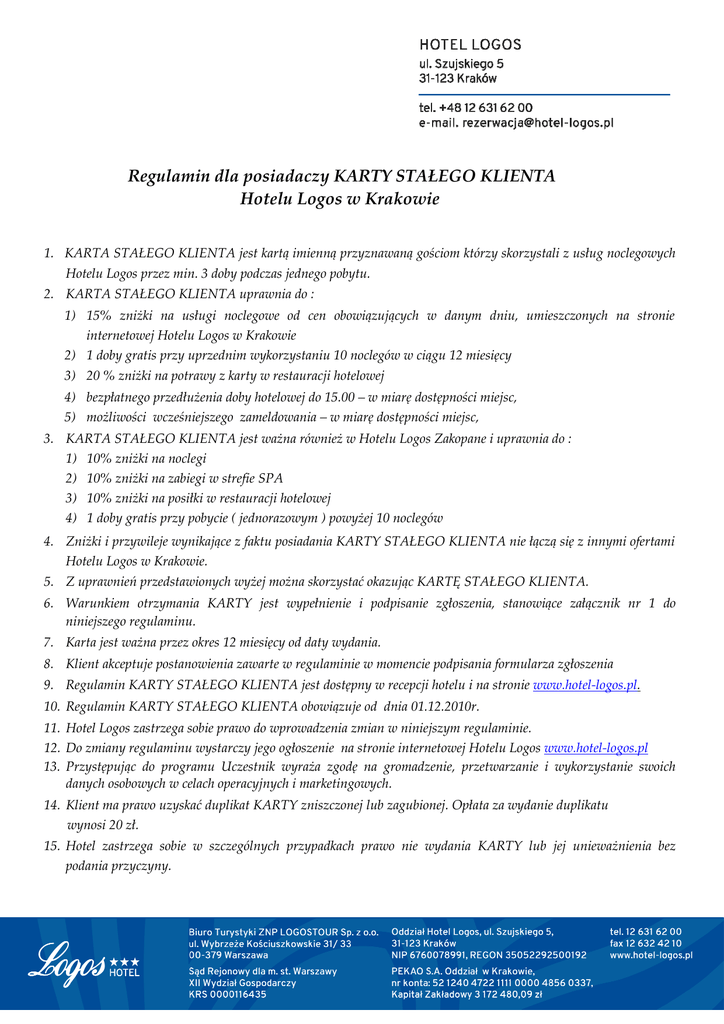 Regulamin dla posiadaczy KARTY STAŁEGO KLIENTA Hotelu Logos w Krakowie 1. KARTA STAŁEGO KLIENTA jest kartą imienną przyznawaną gościom którzy skorzystali z usług noclegowych Hotelu Logos przez min. 3 doby podczas jednego pobytu. 2. KARTA STAŁEGO KLIENTA uprawnia do : 1) 15% zniżki na usługi noclegowe od cen obowiązujących w danym dniu, umieszczonych na stronie internetowej Hotelu Logos w Krakowie 2) 1 doby gratis przy uprzednim wykorzystaniu 10 noclegów w ciągu 12 miesięcy 3) 20 % zniżki na potrawy z karty w restauracji hotelowej 4) bezpłatnego przedłużenia doby hotelowej do 15.00 – w miarę dostępności miejsc, 5) możliwości wcześniejszego zameldowania – w miarę dostępności miejsc, 3. KARTA STAŁEGO KLIENTA jest ważna również w Hotelu Logos Zakopane i uprawnia do : 1) 10% zniżki na noclegi 2) 10% zniżki na zabiegi w strefie SPA 3) 10% zniżki na posiłki w restauracji hotelowej 4) 1 doby gratis przy pobycie ( jednorazowym ) powyżej 10 noclegów 4. Zniżki i przywileje wynikające z faktu posiadania KARTY STAŁEGO KLIENTA nie łączą się z innymi ofertami Hotelu Logos w Krakowie. 5. Z uprawnień przedstawionych wyżej można skorzystać okazując KARTĘ STAŁEGO KLIENTA. 6. Warunkiem otrzymania KARTY jest wypełnienie i podpisanie zgłoszenia, stanowiące załącznik nr 1 do niniejszego regulaminu. 7. Karta jest ważna przez okres 12 miesięcy od daty wydania. 8. Klient akceptuje postanowienia zawarte w regulaminie w momencie podpisania formularza zgłoszenia 9. Regulamin KARTY STAŁEGO KLIENTA jest dostępny w recepcji hotelu i na stronie www.hotel-logos.pl. 10. Regulamin KARTY STAŁEGO KLIENTA obowiązuje od dnia 01.12.2010r. 11. Hotel Logos zastrzega sobie prawo do wprowadzenia zmian w niniejszym regulaminie. 12. Do zmiany regulaminu wystarczy jego ogłoszenie na stronie internetowej Hotelu Logos www.hotel-logos.pl 13. Przystępując do programu Uczestnik wyraża zgodę na gromadzenie, przetwarzanie i wykorzystanie swoich danych osobowych w celach operacyjnych i marketingowych. 14. Klient ma prawo uzyskać duplikat KARTY zniszczonej lub zagubionej. Opłata za wydanie duplikatu wynosi 20 zł. 15. Hotel zastrzega sobie w szczególnych przypadkach prawo nie wydania KARTY lub jej unieważnienia bez podania przyczyny.