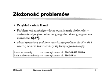 Złożoność problemów Przykład - wieże Hanoi Problem jest zamknięty (dolne ograniczenie złożoności = złożoność algorytmu rekurencyjnego lub iteracyjnego) i ma złożoność O(2N). Mnisi tybetańscy podobno rozwiązują problem dla N = 64 i wierzą, że nasz świat skończy się kiedy tego dokonają! 1 ruch na sekundę ⇒ czas wykonania ok. 586 549 402 018 lat 1 mln ruchów na sekundę ⇒ czas wykonania ok. 586 549 lat M.Rawski Wstęp do Informatyki 1 “Głupia” układanka Problem decyzyjny - taki problem algorytmiczny, który polega na znalezieniu odpowiedzi “tak” lub “nie” (często jest to odpowiedź na pytanie o istnienie rozwiązania problemu) Czy istnieje takie ułożenie kwadratu M x M z N = M 2 elementów, które spełnia wymagania układanki? • Dla układanki 5 X 5 1 mln układów na sekundę ⇒ czas sprawdzenia ok. 493 208 500 055 lat Problem decyzyjny - taki problem algorytmiczny, który polega na znalezieniu odpowiedzi “tak” lub “nie” (często jest to odpowiedź na pytanie o istnienie rozwiązania problemu) M.Rawski Wstęp do Informatyki 2 Wartości niektórych funkcji złożoności Funkcja log2 N N N ∗ log2 N N2 N3 10 3 10 33 100 1000 2N 1024 N! NN 3,6 mln (7 cyfr) 10 mld (11 cyfr) 50 5 50 282 2500 125 000 N 100 6 100 664 10 000 1 000 000 liczba 16 liczba 31 cyfrowa cyfrowa liczba 65 liczba 161 cyfrowa cyfrowa liczba 85 liczba 201 cyfrowa cyfrowa 300 1000 8 9 300 1000 2468 9965 90 000 1 000 000 27 mln 1 mld (8 cyfr) (10 cyfr) liczba 91 liczba 302 cyfrowa cyfrowa liczba 623 ∞ cyfrowa liczba 744 ∞ cyfrowa liczba protonów w widocznym wszechświecie ma 126 cyfr, a liczba mikrosekund od “wielkiego wybuchu” ma 24 cyfry M.Rawski Wstęp do Informatyki 3 Zapotrzebowanie na czas jedna instrukcja trwa mikrosekundę 1 milion instrukcji na sekundę N 10 20 50 100 300 Funkcja N2 1/10 000 1/2500 1/400 sek. 1/100 sek. 9/100 sek. sek. sek. 2N 1/1000 1 sekunda 35,7 lat 400 bilionów 75 cyfr. sek. stuleci liczba stuleci NN 2,8 3,3 biliony 70 cyfr. 185 cyfr. 728 cyfr. godziny lat liczba stuleci liczba stuleci liczba stuleci M.Rawski Wstęp do Informatyki 4 Tempo wzrostu niektórych funkcji złożoności Funkcja f(N) jest (asymptotycznie) ograniczona z góry przez funkcję g(N), jeśli ∃ N0 ∀ N ≥ N0 : f(N) ≤ g(N) - oznaczmy ten fakt przez f(N) ≤ g(N). Wtedy zachodzi log2 N ≤ N ≤ N ⋅ log2 N ≤ N ≤ 2 2N ≤N!≤N N 10 40 10 35 10 30 10 25 10 20 N N 2 N 1,2 N 15 10 12 10 9 10 6 10 1000 100 10 2 M.Rawski Wstęp do Informatyki N 5 N 3 5N 4 512 8 16 32 64 1 28 2 56 1024 5 N 10 4 0 Podział funkcji złożoności 10 35 10 30 10 25 10 20 N 2 N 1,2 15 10 12 10 10 9 6 10 1000 100 10 2 N N 5 N 3 5N Można także porównywać funkcje asymptotycznie w oparciu o poprzednio przyjęty warunek 4 8 16 32 64 1 28 5 12 2 56 1 024 f (N ) lim = 0 - oznaczmy ten fakt przez f(N) ∠ g(N). N →∞ g ( N ) Wtedy zachodzi 1 ∠ log2 log2 N ∠ log2 N ∠ N ∠ N ∠ N ⋅ log2 N ∠ N 2 ∠ N 3 ∠ N log N ∠ 2N ∠ N ! ∠ N N ∠ 22N Funkcje złożoności ogólnie dzielimy na: wielomianowe - ograniczone z góry przez N k dla pewnego k (tzn. ≤ N k lub ∠ N k ) ponadwielomianowe - wykładnicze i inne szybciej rosnące (tzn. nie istnieje dla nich takie k) algorytm wielomianowy = algorytm o złożoności wielomianowej O(N k) M.Rawski Wstęp do Informatyki 6 Sfery problemów algorytmicznych (podział zgrubny) PROBLEMY TRUDNO ROZWIĄZYWALNE PROBLEMY ŁATWO ROZWIĄZYWALNE Nie istnieją wielomianowe algorytmy Istnieją (rozsądne) wielomianowe algorytmy Kilka pytań w związku z “głupią” układanką: Czy nie można po prostu poczekać na zbudowanie dostatecznie szybkiego komputera? Czy brak rozsądnego algorytmu dla tego problemu nie jest rezultatem braku wiedzy i inwencji informatyków? Czy nie można by wykazać, że dolne ograniczenie złożoności dla tego problemu jest wykładnicze i dać sobie spokój? Czy nie jest on przypadkiem tak szczególnym, że można go pominąć? M.Rawski Wstęp do Informatyki 7 Szybszy komputer? Maksymalna liczba elementów układanki do sprawdzenia w godzinę Funkcja współczesny komputer 100 razy komputer 1000 razy komputer szybszy szybszy N2 K 10 ∗ K 31,6 ∗ K 2N L L+6 L + 10 M.Rawski Wstęp do Informatyki 8 Szczególny przypadek? “Głupia” układanka należy do klasy problemów NPC (ang. Nondeterministic Polynomial-time Complete) zwanych po polsku NP. - zupełnymi, która obejmuje prawie 1000 problemów algorytmicznych o jednakowych cechach: • dla wszystkich istnieją wątpliwe rozwiązania w postaci algorytmów wykładniczych • dla żadnego nie znaleziono rozsądnego rozwiązania w postaci algorytmu wielomianowego • dla żadnego nie udowodniono, że jego rozwiązania wymaga czasu wykładniczego • najlepsze znane dolne ograniczenia są liniowe, tzn. O(N) Nie wiadomo czy są one trudno, czy łatwo rozwiązywalne! Nowe problemy NP-zupełne powstają w kombinatoryce, badaniach operacyjnych, ekonometrii, teorii grafów, logice itd. M.Rawski Wstęp do Informatyki 9 Układanki dwuwymiarowe Powodem braku szybkiego rozwiązania jest istnienie wielu różnych rozwiązań częściowych, nie będących częścią rozwiązania pełnego – nie dających się rozszerzyć do jakiegoś rozwiązania pełnego Zwykłe układanki – Puzzle zazwyczaj mają złożoność czasową O(N 2) W ogólnym przypadku problem układanek jest także problemem NP – zupełnym M.Rawski Wstęp do Informatyki 10 6 Problem komiwojażera 3 9 8 4 3 Problem polega na znalezieniu w sieci 10 7 5 połączeń pomiędzy miastami najkrótszej 7 drogi, która pozwala odwiedzić każde z miast i powrócić do miasta wyjściowego Graf z wagami krawędzi (tzw. cykl). 6 Problem formułowany jest jako 3 4 poszukiwanie minimalnego pełnego 3 cyklu w grafie z wagami krawędzi 7 5 W wersji decyzyjnej problem polega na stwierdzeniu czy istnieje cykl o koszcie nie większym niż podana wartość K Minimalny cykl o koszcie 28 M.Rawski Wstęp do Informatyki 1