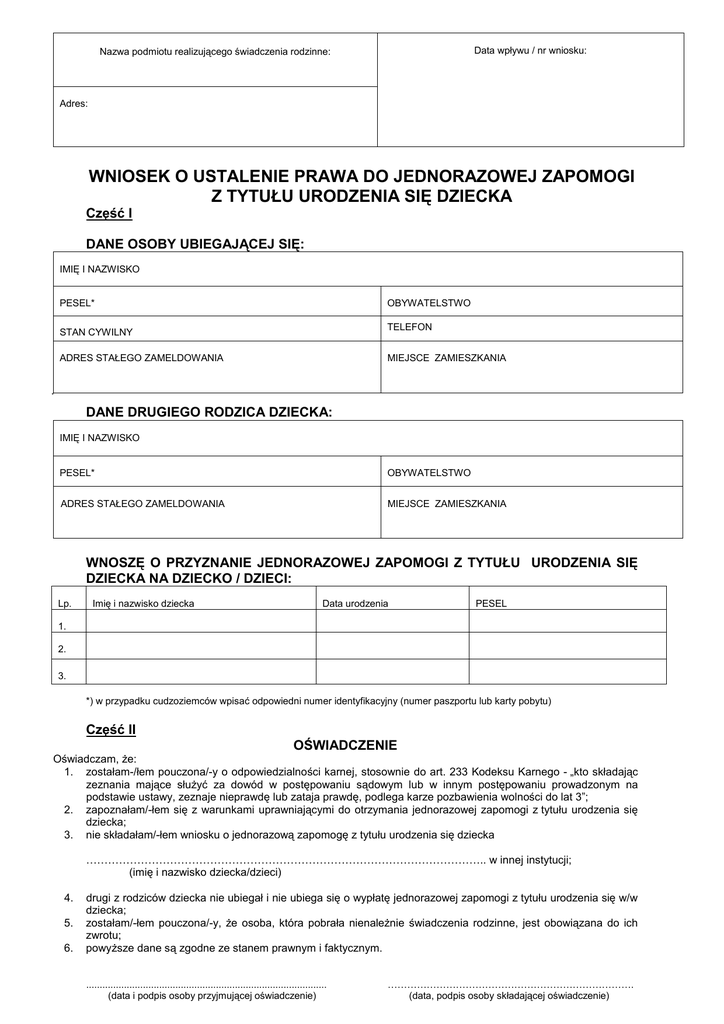 Data wpływu / nr wniosku: Nazwa podmiotu realizującego świadczenia rodzinne: Adres: WNIOSEK O USTALENIE PRAWA DO JEDNORAZOWEJ ZAPOMOGI Z TYTUŁU URODZENIA SIĘ DZIECKA Część I DANE OSOBY UBIEGAJĄCEJ SIĘ: IMIĘ I NAZWISKO PESEL* OBYWATELSTWO TELEFON STAN CYWILNY ADRES STAŁEGO ZAMELDOWANIA MIEJSCE ZAMIESZKANIA * DANE DRUGIEGO RODZICA DZIECKA: IMIĘ I NAZWISKO PESEL* OBYWATELSTWO A ADRES STAŁEGO ZAMELDOWANIA MIEJSCE ZAMIESZKANIA WNOSZĘ O PRZYZNANIE JEDNORAZOWEJ ZAPOMOGI Z TYTUŁU URODZENIA SIĘ DZIECKA NA DZIECKO / DZIECI: Lp. Imię i nazwisko dziecka Data urodzenia PESEL 1. 2. 3. *) w przypadku cudzoziemców wpisać odpowiedni numer identyfikacyjny (numer paszportu lub karty pobytu) Część II OŚWIADCZENIE Oświadczam, że: 1. zostałam-/łem pouczona/-y o odpowiedzialności karnej, stosownie do art. 233 Kodeksu Karnego - „kto składając zeznania mające służyć za dowód w postępowaniu sądowym lub w innym postępowaniu prowadzonym na podstawie ustawy, zeznaje nieprawdę lub zataja prawdę, podlega karze pozbawienia wolności do lat 3”; 2. zapoznałam/-łem się z warunkami uprawniającymi do otrzymania jednorazowej zapomogi z tytułu urodzenia się dziecka; 3. nie składałam/-łem wniosku o jednorazową zapomogę z tytułu urodzenia się dziecka ……………………………………………………………………………………………….. w innej instytucji; (imię i nazwisko dziecka/dzieci) 4. 5. 6. drugi z rodziców dziecka nie ubiegał i nie ubiega się o wypłatę jednorazowej zapomogi z tytułu urodzenia się w/w dziecka; zostałam/-łem pouczona/-y, że osoba, która pobrała nienależnie świadczenia rodzinne, jest obowiązana do ich zwrotu; powyższe dane są zgodne ze stanem prawnym i faktycznym. ......................................................................................... (data i podpis osoby przyjmującej oświadczenie) …………………………………………………………………. (data, podpis osoby składającej oświadczenie) Część III OŚWIADCZENIE DOTYCZĄCE FORMY PŁATNOŚCI Przyznaną zapomogę proszę przekazać w formie dostępnej w danej dzielnicy (zaznaczyć właściwe – w ustaleniu z WSZ dla danej dzielnicy): A. Przelew na konto: nr rachunku bankowego Właścicielem konta jest ……………………………………………………………………………………………………… B. Przekaz pocztowy na adres zamieszkania wskazany w Części I. C. Odbiór za pomocą posiadanej przeze mnie przedpłaconej karty bankomatowej. D. Odbiór gotówki w banku …………………………………………………….………… mieszczącym przy ul. …………………………………………………………………. E. Odbiór w Urzędzie Pocztowym Nr ……….. mieszczącym się przy ul. ………................................................................................................................................................................ (nazwa i adres właściwego urzędu pocztowego) …………........................................................................... (data, podpis osoby ubiegającej się o świadczenie) Do wniosku dołączam następujące dokumenty: 1. 2. 3. 4. 5. kserokopia odpisu skróconego / zupełnego / aktu urodzenia dziecka (oryginał do wglądu); zaświadczenie lekarskie lub zaświadczenie wystawione przez położną, potwierdzające co najmniej jedno badanie kobiety w okresie ciąży przeprowadzone przez lekarza ginekologa lub położną; kserokopia dokumentu (ze zdjęciem) potwierdzającego tożsamość osoby ubiegającej się (oryginał do wglądu); …………………………………………………………………………………………………………………………………. …………………………………………………………………………………………………………………………………. POUCZENIE Na podstawie Rozdziału 2a ustawy z dnia 28 listopada 2003r. o świadczeniach rodzinnych (Dz.U. z 2006r., Nr 139, poz.992 z późn.zm.) oraz ustawy z dnia 5 marca 2010r. o zmianie ustawy o świadczeniach rodzinnych oraz ustawy o świadczeniach opieki zdrowotnej finansowanych ze środków publicznych (Dz.U. 2010r., Nr50, poz.301) zwanej dalej „ustawą” jednorazowa zapomoga z tytułu urodzenia żywego dziecka: 1. 2. 3. 4. przysługuje ojcu lub matce dziecka, opiekunowi prawnemu albo opiekunowi faktycznemu dziecka – niezależnie od ich dochodów, pod warunkiem, że kobieta odbyła co najmniej jedno badanie przez lekarza ginekologa lub położną w okresie ciąży (pozostawanie pod opieką medyczną potwierdza się zaświadczeniem lekarskim lub zaświadczeniem wystawionym przez położną) - nie stosuje się do opiekuna prawnego lub faktycznego zapomoga przyznawana jest z tytułu urodzenia się żywego dziecka w wysokości 1 000 zł na jedno dziecko, wniosek o wypłatę zapomogi składa się w terminie 12 miesięcy od dnia narodzin dziecka, a w przypadku, gdy wniosek dotyczy dziecka objętego opieką prawną, opieką faktyczną albo dziecka przysposobionego – w terminie 12 miesięcy od dnia objęcia dziecka opieką albo przysposobienia nie późnie niż do ukończenia przez dziecko 18 roku życia. Wniosek złożony po terminie właściwy organ pozostawia bez rozpatrzenia. Zgodnie z art. 30, ust.1, ust.2 pkt 2 oraz ust.7 ustawy, świadczenia rodzinne przyznane lub wypłacone na podstawie fałszywych zeznań lub dokumentów albo w innych przypadkach świadomego wprowadzania w błąd przez osobę pobierającą te świadczenia, są świadczeniami nienależnie pobranymi. Osoba, która pobrała nienależne świadczenia rodzinne, jest zobowiązana do ich zwrotu. Nienależnie pobrane świadczenia podlegają egzekucji w trybie przepisów o postępowaniu egzekucyjnym w administracji. Jednorazowa zapomoga z tytułu urodzenia się dziecka może być wypłacana wyłącznie przez jeden organ w