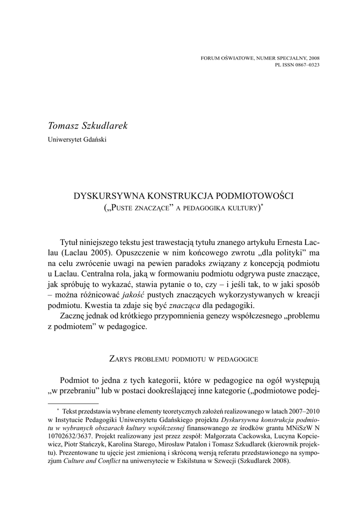FORUM OŚWIATOWE, numer specjalny, 2008 PL ISSN 0867–0323 Tomasz Szkudlarek Uniwersytet Gdański Dyskursywna konstrukcja podmiotowości („Puste znaczące” a pedagogika kultury)* Tytuł niniejszego tekstu jest trawestacją tytułu znanego artykułu Ernesta Laclau (Laclau 2005). Opuszczenie w nim końcowego zwrotu „dla polityki” ma na celu zwrócenie uwagi na pewien paradoks związany z koncepcją podmiotu u Laclau. Centralna rola, jaką w formowaniu podmiotu odgrywa puste znaczące, jak spróbuję to wykazać, stawia pytanie o to, czy – i jeśli tak, to w jaki sposób – można różnicować jakość pustych znaczących wykorzystywanych w kreacji podmiotu. Kwestia ta zdaje się być znacząca dla pedagogiki. Zacznę jednak od krótkiego przypomnienia genezy współczesnego „problemu z podmiotem” w pedagogice. Zarys problemu podmiotu w pedagogice Podmiot to jedna z tych kategorii, które w pedagogice na ogół występują „w przebraniu” lub w postaci dookreślającej inne kategorie („podmiotowe podej Tekst przedstawia wybrane elementy teoretycznych założeń realizowanego w latach 2007–2010 w Instytucie Pedagogiki Uniwersytetu Gdańskiego projektu Dyskursywna konstrukcja podmiotu w wybranych obszarach kultury współczesnej finansowanego ze środków grantu MNiSzW N 10702632/3637. Projekt realizowany jest przez zespół: Małgorzata Cackowska, Lucyna Kopciewicz, Piotr Stańczyk, Karolina Starego, Mirosław Patalon i Tomasz Szkudlarek (kierownik projektu). Prezentowane tu ujęcie jest zmienioną i skróconą wersją referatu przedstawionego na sympozjum Culture and Conflict na uniwersytecie w Eskilstuna w Szwecji (Szkudlarek 2008). * 126 Tomasz Szkudlarek ście”, „upodmiotowienie” etc.). To chyba nie jest przypadek, pedagogika bowiem – teoretyzując kategorię podmiotowości – czyni to zwykle konstruktywistycznie, traktując podmiot raczej jako „coś do zrobienia” niż jako coś, co istnieje uprzednio wobec projektowanych zabiegów, jest już „jakieś” ze swej natury i może być uznane za podstawę teoretyzacji innych kategorii. Wyjątek stanowią tu podejścia naturalistyczne (z Rousseau na czele) i pewne odmiany esencjalizmu (na przykład personalistycznego), gdzie podmiot traktowany jest jako „dana” narzucająca innym kategoriom swoją logikę. Na przełomie lat 70-tych i 80-tych XX w. popularna była pedagogika humanistyczna wyłaniająca się z inspiracji psychologią humanistyczną (głównie pracami Carla Rogersa), będąca odmianą Rousseańskiego naturalizmu (tendencja do samoaktualizacji traktowana jest w tym nurcie jako przyrodzona; podobnie Rousseańskie jest „domniemanie dobra” podmiotu). Ten nurt teorii spotykał się z podejściem hermeneutycznym, akcentującym dialogiczność wychowania – i w niektórych ujęciach – bezarbitralność wychowawczego dialogu (Rutkowiak 1984). Te nurty – przez pewien czas wyraźnie angażujące wyobraźnię badaczy i praktyków – spotkały się z krytyką kwestionującą „podmiotowe podejście” w edukacji z perspektyw krytycznej socjologii, ale także z pozycji zyskującego wtedy stopniowo na znaczeniu filozoficznego dekonstrukcjonizmu (Witkowski 1995). Ta krytyczna reakcja na powrót naturalizmu z jednej strony umocniła tradycyjny rys teorii wychowania (traktowanie podmiotu jako zadania w procesie wychowania), z drugiej – dokonała otwarcia na rozwijające się w światowej humanistyce krytyki podmiotu wywodzące się z tradycji strukturalistycznej, w których kategoria subiectum staje się korelatem zewnętrznych wobec niej struktur szeroko pojmowanego języka, a dokładniej – polem gry znaczących. Jak się wydaje, stale obecna w pedagogice wizja podmiotu jako tworu konstruowanego w relacjach społecznych, do niedawna skazująca myślenie pedagogiczne na nieuchronną marginalizację wobec silnych nurtów filozofii i psychologii badających różne warianty problemu ludzkiej „natury”, stała się podstawą zbliżenia pedagogiki i krytycznie uprawianej humanistyki. W zasadzie byliśmy świadkami przemieszczenia problematyki pedagogicznej (a przynajmniej pedagogom znanej jako pedagogiczna) z peryferii do centrum debaty humanistycznej. Tak zwany przełom postmodernistyczny uwydatnił – znane i dawniej, ale traktowane dość marginalnie – właśnie konstruktywistyczne, w tym dyskursywne i retoryczne wizje podmiotu jako swoistego „zadania”, nierozstrzygalnego problemu raczej niż punktu oparcia dla humanistycznej refleksji. W pewnym sensie nie jest więc tak, że to pedagogika „wpadła” w postmodernistyczne ujęcia podmiotowości; to raczej ponowoczesna humanistyka uznała coś, co w pedagogice stanowiło od wielu lat dość podstawowe (choć nie zawsze Dyskursywna konstrukcja podmiotowości 127 jasno werbalizowane) kategorie myślenia: mianowicie to, iż podmiot to raczej zadany niż dany wymiar człowieczeństwa, raczej problem niż podstawa działania. Gregory Ulmer stwierdził nawet w tym kontekście, że pedagogika „zawsze była postmodernistyczna” (Ulmer 1989, s. 42). Dyskursywna konstrukcja podmiotu W niniejszym tekście chciałbym dokonać prezentacji pewnego szczególnego problemu wyłaniającego się z recepcji poststrukturalnej teorii podmiotu. Problem ten stanowi jedną z kwestii podejmowanych w ramach projektu Dyskursywna konstrukcja podmiotu. Punktem wyjścia stała się dla nas teoria poststrukturalna „obudowana” odniesieniami do psychoanalizy, marksizmu (wraz z jego krytycznymi i zdystansowanymi wobec oryginału „postmarksizmami” – przede wszystkim teorią Pierre’a Bourdieu), feminizmu i pewnych nurtów współczesnej teologii oraz teorii polityki. Nie wnikając w tej chwili w jej bardzo liczne niuanse, wewnętrzne spory i kontrowersje tego konglomeratu idei, skupię się w tym momencie na jednej tylko koncepcji, dość dobrze ilustrującej sposób ujmowania podmiotu w tym obszarze myśli. Ernesto Laclau od wielu lat stanowi jedną 
