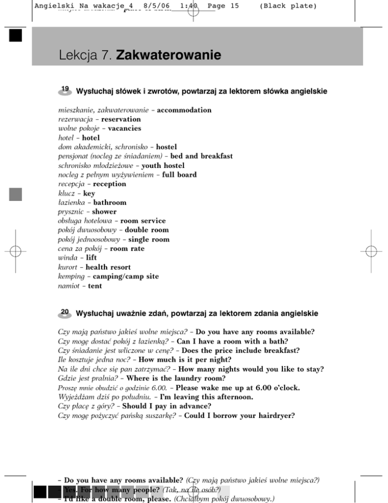 data urodzenia – date of birth Angielski wakacje_4 miejsceNa urodzenia – place 8/5/06 of birth 1:40 Page 15 (Black plate) Lekcja 7. Zakwaterowanie 19 Wys∏uchaj s∏ówek i zwrotów, powtarzaj za lektorem s∏ówka angielskie mieszkanie, zakwaterowanie – accommodation rezerwacja – reservation wolne pokoje – vacancies hotel – hotel dom akademicki, schronisko – hostel pensjonat (nocleg ze Êniadaniem) – bed and breakfast schronisko m∏odzie˝owe – youth hostel nocleg z pe∏nym wy˝ywieniem – full board recepcja – reception klucz – key ∏azienka – bathroom prysznic – shower obs∏uga hotelowa – room service pokój dwuosobowy – double room pokój jednoosobowy – single room cena za pokój – room rate winda – lift kurort – health resort kemping – camping/camp site namiot – tent 20 Wys∏uchaj uwa˝nie zdaƒ, powtarzaj za lektorem zdania angielskie Czy majà paƒstwo jakieÊ wolne miejsca? – Do you have any rooms available? Czy mog´ dostaç pokój z ∏azienkà? – Can I have a room with a bath? Czy Êniadanie jest wliczone w cen´? – Does the price include breakfast? Ile kosztuje jedna noc? – How much is it per night? Na ile dni chce si´ pan zatrzymaç? – How many nights would you like to stay? Gdzie jest pralnia? – Where is the laundry room? Prosz´ mnie obudziç o godzinie 6.00. – Please wake me up at 6.00 o’clock. Wyje˝d˝am dziÊ po po∏udniu. – I’m leaving this afternoon. Czy p∏ac´ z góry? – Should I pay in advance? Czy mog´ po˝yczyç paƒskà suszark´? – Could I borrow your hairdryer? – Do you have any rooms available? (Czy majà paƒstwo jakieÊ wolne miejsca?) – Yes. For how many people? (Tak, na ile osób?) – I’d like a double room, please. (Chcia∏bym pokój dwuosobowy.) Czy p∏ac´ góry? – Should8/5/06 I pay in advance? Angielski Na zwakacje_4 1:40 Page 16 (Black plate) Czy mog´ po˝yczyç paƒskà suszark´? – Could I borrow your hairdryer? 21 Wys∏uchaj dialogu, powtarzaj poszczególne zwroty za lektorem At reception (W recepcji hotelowej) – – – – – – Do you have any rooms available? (Czy majà paƒstwo jakieÊ wolne miejsca?) Yes. For how many people? (Tak, na ile osób?) I’d like a double room, please. (Chcia∏bym pokój dwuosobowy.) How long would you like to stay for? (Jak d∏ugo planuje pan zostaç?) 3 days. (3 dni.) Would you prefer a room with a bathroom or without a bathroom? (Chcia∏by pan pokój z ∏azienkà czy bez?) – I’d like a room with a bathroom and a 6.00 a.m. wake up call please. (Chcia∏bym pokój z ∏azienkà i poprosz´ o budzenie telefoniczne o 6 rano.) – No problem, could I have your name and credit card number please? (Nie ma problemu, czy mog∏abym prosiç o paƒskie nazwisko i numer karty kredytowej?) – Ethan Smith. And I’d prefer to pay in cash. (Ethan Smith. Chcia∏bym zap∏aciç gotówkà.) – Certainly, Sir. (OczywiÊcie, prosz´ pana.) – Thank you. (Dzi´kuj´.) – Thank you. (Dzi´kuj´.) S∏ówka dodatkowe lodówka – refrigerator/fridge otwieracz do puszek – tin opener jednopi´trowy domek – bungalow Êpiwór – sleeping bag latarka – torch kuchnia – kitchen ∏ó˝ko – bed sypialnia – bedroom toaleta – toilet recepcjonista – receptionist danie dnia – dish of the day kuchnia – kitchen