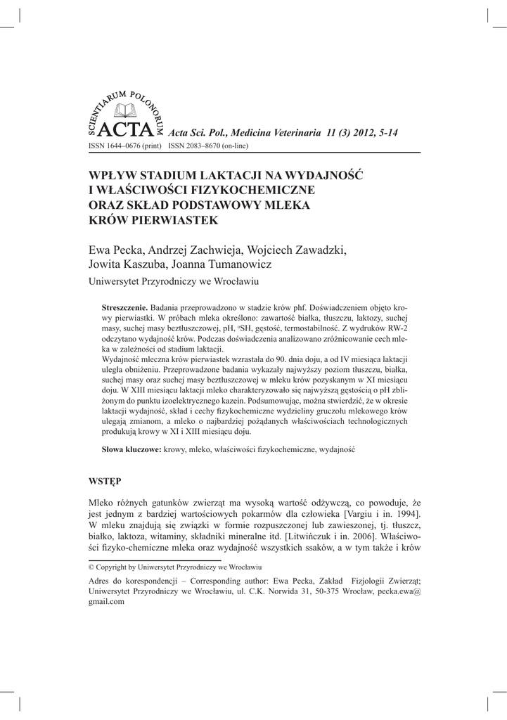 WPŁYW STADIUM LAKTACJI NA WYDAJNOŚĆ I WŁAŚCIWOŚCI