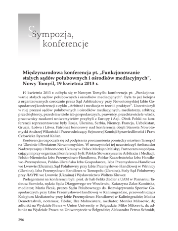 SSympozja, konferencje Międzynarodowa konferencja pt. „Funkcjonowanie stałych sądów polubownych i ośrodków mediacyjnych”, Nowy Tomyśl, 19 kwietnia 2013 r. 19 kwietnia 2013 r. odbyła się w Nowym Tomyślu konferencja pt. „Funkcjonowanie stałych sądów polubownych i ośrodków mediacyjnych”. Była to już kolejna z organizowanych corocznie przez Sąd Arbitrażowy przy Nowotomyskiej Izbie Gospodarczej konferencji z cyklu „Arbitraż i mediacja w teorii i praktyce”. Uczestniczyli w niej prezesi sądów polubownych i ośrodków mediacyjnych, mediatorzy, arbitrzy, przedsiębiorcy, przedstawiciele izb gospodarczych, prawnicy, przedstawiciele władz, pracownicy naukowi uniwersytetów przybyli z Europy i Azji. Obok Polski na konferencji reprezentowane były Rosja, Ukraina, Serbia, Niemcy, Francja, Uzbekistan, Gruzja, Łotwa i Litwa. Patronat honorowy nad konferencją objęli Starosta Nowotomyski Andrzej Wikoński i Przewodniczący Sejmowej Komisji Sprawiedliwości i Praw Człowieka Ryszard Kalisz. Konferencja rozpoczęła się od podpisania porozumienia pomiędzy miastem Tarnopol na Ukrainie i Powiatem Nowotomyskim. W uroczystości tej uczestniczył Ambasador Nadzwyczajny i Pełnomocny Ukrainy w Polsce Markijan Malskyj. Partnerami współpracującymi przy organizacji konferencji byli: Polskie Stowarzyszenie Arbitrażu i Mediacji, Polsko-Niemiecka Izba Przemysłowo-Handlowa, Polsko-Kazachstańska Izba Handlowo-Przemysłowa, Polsko-Ukraińska Izba Gospodarcza, Izba Przemysłowo-Handlowa we Lwowie (Ukraina), Sąd Polubowny przy Izbie Przemysłowo-Handlowej w Winnicy (Ukraina), Izba Przemysłowo Handlowa w Tarnopolu (Ukraina), Stały Sąd Polubowny przy ЛАУРН we Lwowie (Ukraina) i Wydawnictwo Wolters Kluwer. Prelegentami na konferencji byli: prof. dr hab Feliks Zedler z UAM w Poznaniu; Tadeusz Szewioła, sędzia Sądu Okręgowego we Wrocławiu; Katarzyna Zalas-Kamińska, mediator; Maria Ficak, prezes Sądu Polubownego ds. Rozwiązywania Sporów Gospodarczych przy Izbie Przemysłowo-Handlowej w Kaliningradzie, przewodnicząca Kolegium Mediatorów przy Izbie Przemysłowo-Handlowej w Kaliningradzie; Medea Demetrashvili, notariusz, Tibilisi; Ilze Mālmeistere, mediator; Monika Milosevic, dr, adiunkt na Wydziale Prawa w Union University w Belgradzie; Milos Milosevic, dr, adiunkt na Wydziale Prawa na Uniwersytecie w Belgradzie; Aleksandra Petrus Schmidt, 296 7–8/2013 Sympozja, konferencje wiceprezes Polskiego Stowarzyszenia Arbitrażu i Mediacji w Poznaniu, arbiter Sądu Arbitrażowego przy Nowotomyskiej Izbie Gospodarczej, mediator; Krystian Mularczyk, radca prawny, arbiter i mediator, sekretarz redakcji kwartalnika ADR; Markian Malskyy, adwokat, partner w Kancelarii Arzinger w Kijowie; Yussuf Nazarov, prof. na Wydziale Prawa Krajowego Uniwersytetu w Taszkiencie; Karol Zawiślak, adwokat, arbiter Sądu Arbitrażowego przy Nowotomyskiej Izbie Gospodarczej w Nowym Tomyślu; Mikhail Savranskyy, prof., Niezależna Izba Arbitrażowa Rosji w Moskwie, arbiter Międzynarodowego Sądu Arbitrażowego przy Izbie Przemysłowo-Handlowej Rosji; Andrzej Kąkolecki, radca prawny, arbiter międzynarodowy; Karl Pörnbacher, partner w kancelarii Hogan Lovells, Monachium; Aleksander Kostenetskyi, prezes Sądu Polubownego przy Izbie Przemysłowo-Handlowej w Winnicy; Włodzimierz Brych, arbiter międzynarodowy, mediator, prezes Sądu Arbitrażowego przy Nowotomyskiej Izbie Gospodarczej, prezes Polskiego Stowarzyszenia Arbitrażu i Mediacji; Maria Hauser-Morel, dr, radca prawny, Counsel ICC Court w Paryżu; Routh Mosh, członek Komitetu Wykonawczego Niemieckiego Instytutu Arbitrażowego (DIS) w Koloni; Vytautas Nekrošius, prof. dr hab., prezes Wileńskiego Sądu Arbitrażowego (VCCA); Igor Dutka, dyrektor Oddziału Zachodniego Izby Arbitrażowej we Lwowie. Moderatorami poszczególnych paneli byli uznani specjaliści z zakresu arbitrażu i mediacji, a mianowicie: Joachim Hilla, radca prawny, Rechtsanwalt, arbiter międzynarodowy, Frankfurt n. Menem, Agnieszka Rękas, Społeczna Rada ds. Alternatywnych Metod Rozwiązywania Konfliktów i Sporów przy Ministrze Sprawiedliwości, Andrzej Szumański, adwokat, arbiter międzynarodowy, profesor w Katedrze Prawa Gospodarczego Uniwersytetu Jagiellońskiego w Krakowie oraz Piotr Nowaczyk, adwokat, arbiter międzynarodowy, przedstawiciel RP przy ICC w Paryżu, partner w kancelarii DENTONS w Warszawie. Podsumowania konferencji dokonał Włodzimierz Brych, który zwrócił się do uczestników o wystąpienie z apelem do Komisji Europejskiej o jak najszybsze podpisanie z Ukrainą umowy stowarzyszeniowej z Unią Europejską. Inicjatywa ta spotkała się z uznaniem uczestników konferencji. Warto nadmienić, że w tegorocznej imprezie uczestniczyło blisko 180 osób. Włodzimierz Brych 297