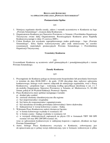 REGULAMIN KONKURSU NA OPRACOWANIE LOGO „POWIATU SZTUMSKIEGO” Postanowienia Ogólne §1 1. Niniejszy regulamin określa zasady, zakres i warunki uczestnictwa w Konkursie na logo „Powiatu Sztumskiego”, zwanym dalej Konkursem. 2. Organizatorem Konkursu jest Starostwo Powiatowe w Sztumie i Powiślańska Organizacja Turystyczna zwane dalej Organizatorem. Rozstrzygnięcie Konkursu przez Kapitułę Konkursową nastąpi w dniu 15 czerwca 2009 r. 3. Celem Konkurs jest uzyskanie zaprojektowanego znaku graficznego – logo „Powiatu Sztumskiego”, który będzie wykorzystywany jako znak umieszczany na szeroko rozumianych materiałach promocyjnych Powiatu Sztumskiego i Powiślańskiej Organizacji Turystycznej. Uczestnicy Konkursu §2 Uczestnikami Konkursu są uczniowie szkół gimnazjalnych i ponadgimnazjalnych z terenu Powiatu Sztumskiego. Zasady Konkursu §3 1. Przystąpienie do Konkursu polega na dostarczeniu bezpośrednio lub przesłaniu listownym w terminie do dnia 08.06.2009 r. do godz. 15:00 (decyduje data wpływu) zgłoszenia konkursowego, którego wzór stanowi załącznik do niniejszego regulaminu, wraz z Pracą Konkursową – projektem logo – wykonaną według specyfikacji określonej w ust. 2 i 3 do siedziby Organizatora: Starostwo Powiatowe w Sztumie, ul. Mickiewicza 31, 82-400 Sztum, pokój nr 26 Wydział Edukacji, Promocji i Sportu. 2. Praca Konkursowa musi spełniać następujące warunki: a) działać jako symbol b) zawierać elementy charakterystyczne dla regionu c) być niepowtarzalna i oryginalna d) być łatwa do rozpoznawania i zapamiętywania e) być niezależna od środka powielania (uniwersalna) i łatwo skalowalna f) funkcjonować w wersji kolorowej i czarno – białej. 3. Wykonane Prace Konkursowe należy dostarczyć łącznie: a) w formie kolorowego wydruku w rozmiarze A4 b) w formie czarno - białego wydruku w rozmiarze A4 c) w wersjach elektronicznych zapisanych na płycie CD w formatach TIFF 300 DPI rozmiar A4 oraz JPG 200 DPI rozmiar A4, wraz ze zgłoszeniem konkursowym w zaklejonej kopercie z napisem „Konkurs na logo Powiatu Sztumskiego’”. 4. Autor, którego Praca Konkursowa zwycięży w Konkursie, zobowiązany jest do opracowania jej w pełnej wersji elektronicznej, tym w formacie wektorowym w pliku 1 CDR (CorelDraw) lub GIMP, łącznie z opisem technicznym bez dodatkowego wynagrodzenia. 5. Prace Konkursowe o innej tematyce niż określona w ust. 1 niniejszego paragrafu nie będą brane pod uwagę w Konkursie. 6. Uczestnik może zgłosić do udziału w Konkursie nie więcej niż trzy Prace Konkursowe, przy czym każda Praca Konkursowa winna być złożona wraz z odrębnym zgłoszeniem konkursowym, każda w oddzielnej kopercie opisanej dodatkowo „Praca Konkursowa 1”, „Praca Konkursowa 2” itd. 7. Praca Konkursowa nie może mieć więcej niż jednego autora. 8. Przystąpienie do Konkursu i podanie danych osobowych jest dobrowolne, a Uczestnicy Konkursu mają prawo wglądu w swoje dane oraz ich poprawiania. Dane osobowe Uczestników po zakończeniu Konkursu zostaną zniszczone. 9. Z dniem przystąpienia do Konkursu, Uczestnik zobowiązuje się, w przypadku wygranej, przenieść na Organizatora wszelkie autorskie prawa majątkowe i prawa pokrewne (w tym wyłączne prawa do zezwalania na wykonywanie zależnych praw autorskich oraz przenoszenia praw nabytych na inne osoby), do Pracy Konkursowej dostarczonej Organizatorowi wraz z prawem do dokonywania w niej zmian oraz do nieograniczonego w czasie korzystania i rozporządzania w kraju i za granicą, na polach eksploatacji określonych w art. 50 Ustawy z dnia 4 lutego 1994 r. o prawie autorskim i prawach pokrewnych ( Dz. U. z 2000r. Nr 80, poz. 904 ze zm.) w szczególności na polu eksploatacji związanym z działalnością promocyjną, marketingową i reklamową, w tym prawo do: a) wyłącznego używania i wykorzystania utworów we wszelkiej działalności promocyjnej reklamowej, informacyjnej i usługowej, b) utrwalania i zwielokrotniania utworów wszelkimi technikami graficznymi, c) zwielokrotniania poprzez dokonywanie zapisu utworów na nośnikach elektronicznych, d) publicznego wystawiania i wyświetlania na wszelkich imprezach otwartych i zamkniętych, e) wprowadzania do obrotu, wydawania i rozpowszechniania materiałów promocyjnych i reklamowych f) wprowadzania do pamięci komputera j umieszczania w sieci Internet g) publicznego wystawiania h) najmu, dzierżawy i bezpłatnego użyczenia. 10. Zwycięzca Konkursu zobowiązuje się do niezgłaszania żadnych roszczeń względem Organizatora Konkursu z tytułu wykorzystania przez niego Pracy Konkursowej nadesłanej wraz ze zgłoszeniem konkursowym. 11. Uczestnik Konkursu oświadcza, iż jest autorem nadesłanej przez siebie Pracy Konkursowej oraz, że jego Praca Konkursowa nie narusza praw osób trzecich ani bezwzględnie obowiązujących przepisów prawa. 12. Uczestnik ponosi pełną odpowiedzialność w przypadku, gdy osoba trzecia będzie sobie rościć prawa do nadesłanej przez Uczestnika Pracy Konkursowej. 13. Prace Konkursowe naruszające prawa osób trzecich lub bezwzględnie obowiązujące przepisy prawa nie będą brane pod uwagę w Konkursie. 2 Rozstrzygnięcie Konkursu §4 1. Nad przebiegiem Konkursu będzie czuwać Kapituła Konkursowa w składzie minimum 3 osobowym wyłoniona przez Organizatora Konkursu. 2. Kapituła Konkursowa dokonuje oceny prac i wskazuje zwycięzców Konkursu, których przedstawia do akceptacji Organizatorowi Konkursu. 3. Organizator Konkursu akceptuje wskazanie Kapituły Konkursowej, o którym mowa w ust. 2 lub podejmuje decyzję o unieważnieniu Konkursu. 4. Rozstrzygnięcie Konkursu nastąpi do dnia 15.06.2009 roku. 5. Ogłoszenie wyników Konkursu nastąpi na stronie internetowej Organizatora. 6. Uczestnicy Konkursu, których Praca Konkursowa zostanie uznana przez Komisję Konkursową za najlepsze spośród wszystkich ocenianych prac, zostaną powiadomieni o swoim zwycięstwie oraz o terminie i miejscu wr