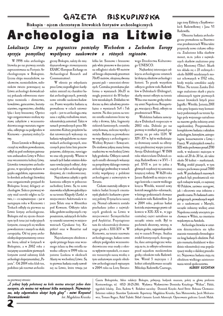 Biskupin − ojcem chrzestnym litewskich festynów archeologicznych Archeologia na Litwie Lokalizacja Litwy na pograniczu pomiędzy Wschodem a Zachodem Europy sprzyja pomyślnej współpracy naukowców z różnych regionów. W 1998 roku archeologia litewska po raz pierwszy została zaprezentowana na Festynie Archeologicznym w Biskupinie. Liczna ekipa muzealników, naukowców, rzemieślników, miłośników świeżo powstającej na Litwie archeologii doświadczalnej pokazała odtworzone starożytne rzemiosła – złotnictwo, kowalstwo, garncarstwo, bursztyniarstwo, rogownictwo, obróbkę łyka i kory brzozowej. Oprócz tego zorganizowano niedużą wystawę zabytków z wczesnośredniowiecznego warsztatu rogownika, odkrytego na podgrodziu w Kiernowie – prastarej stolicy Litwy. Dzień Litewski w Biskupinie cieszył się wielkim powodzeniem, odbył się pod osobistym patronatem ambasadora Litwy w Polsce oraz wiceministra kultury Litwy. Litewskie towarzystwo archeologiczne, w specjalnym wydaniu w języku angielskim, zaprezentowało dorobek archeologii litewskiej oraz zorganizowało przyjazd do Biskupina licznej delegacji archeologów. Sukces pierwszej wizyty miał szeroki odgłos na Litwie, i – co najważniejsze – już w następnym roku w Kiernowie i Trokach odbyły się pierwsze na Litwie festyny archeologiczne. Biskupin stał się ojcem chrzestnym tych teraz już tradycyjnych festynów, cieszących się wielkim powodzeniem i znanych na skalę europejską. Od tej pory archeolodzy-eksperymentatorzy corocznie biorą udział w festynach w Biskupinie, a w 2002 roku z inicjatywy uczestników pierwszych festynów został założony klub archeologii eksperymentalnej „Pajauta”. Od 2004 roku klub ten, podobnie jak rezerwat archeolo- giczny Biskupin, należy do międzynarodowego stowarzyszenia EXARC (European Exchange on Archaeological Research and Communication). W okresie po odzyskaniu przez Litwę niepodległości kardynalnie zmienił się charakter badań archeologicznych, powstały nowe ośrodki naukowo-badawcze. Prawie wszystkie badania są prowadzone w celach ratowniczych – jest to archeologia związana z szybką rozbudową miast, rekonstrukcją autostrad. Także w ramach prowadzonych przez Ministerstwo Kultury projektów badań ratowniczych wykonuje się badania wykopaliskowe na stanowiskach archeologicznych, niszczonych przez leśne linie przeciwpożarowe, elektryczne, rurociągowe oraz siły przyrody. Właśnie w ramach tych badań ostatnio dokonano rewelacyjnych odkryć, dotyczących nie tylko archeologii pradziejowej, ale i średniowiecznej. Najciekawsze zabytki z epoki kamienia odkryto w północnozachodniej Litwie. Są to nowe stanowiska schyłkowo-paleolityczne na terenie Kłajpedy (Zarda), w miejscowości Aukštumala w rejonie Šilute oraz w Altoniškes pod Kownem. Odkryto także kilka grobów neolitycznych z wyposażeniem, należących do kultury ceramiki sznurowej w miejscowościach Gyvakarai (rej. Kupiškis) oraz w Benaičiai nad Bałtykiem. Najciekawszym obiektem z epoki późnego brązu oraz wczesnego żelaza są dwa osiedla nawodne odkryte w 1999 roku na jeziorze Luokesa w okolicach Alanty we wschodniej Litwie. Są to pierwsze badania osady nawodnej na Litwie, które trwają już na pierwszej stronie: „Z jednej bryły położonej na kole można utoczyć jedno duże naczynie, ale można też wykonać kilka mniejszych. Najważniejsze, żeby odpowiednio ułożyć bryłę gliny” - mówi Krzysztof Dziewientkowski fot. Magdalena Kruszka kilka lat. Sosnowe i brzozowe pale wbite pionowo w dno jeziora na odległości około 40 metrów od brzegu obejmowały przestrzeń 70x45 metrów, okrążoną dwoma pasami pali – umocnień obronnych. Centralna prostokątna platforma o wymiarach 30x35 m mogła pomieścić do 10 budynków mieszkalnych. Dokładnie widoczne są dwie zabudowy prostokątne o wymiarach 5x4 i 7x6 metrów. Na dnie jeziora na terenie osiedla znaleziono liczne wyroby z drewna, łyka, fragmenty siekierek kamiennych, ceramikę sztrychowaną, nieliczne wyroby z metalu. Badania są prowadzone we współpracy z archeologami z Wielkiej Brytanii i Szwajcarii. Do niedawna jedyną znaną formą osadnictwa we wschodniej Litwie były grodziska. Odkrycie nawodnych osiedli obronnych wskazuje na perspektywy dalszego rozwoju archeologii podwodnej w ramach ścisłej współpracy z polskimi archeologami z uniwersytetu w Toruniu. Ciekawe materiały odkryto w trakcie badań licznych cmentarzysk płaskich i kurhanów z pierwszej połowy II tysiąclecia naszej ery. Niemal całkowicie zostało przebadane jedno z największych grodzisk na Litwie w miejscowości Šeimyniškeliai pod Anykščiai. Przystąpiono tam do rekonstrukcji drewnianego grodu z XIII-XIV w. W Kiernowie, na terenie rezerwatu archeologicznego, badano nowo odkryte podgrodzie wczesnośredniowieczne oraz osady z okresu wpływów rzymskich, co znacznie rozszerzyło naszą wiedzę o tym unikatowym zespole obiektów archeologicznych wpisanym w 2004 roku na Listę Świato- wego Dziedzictwa Kulturowego UNESCO. Najbardziej interesujące odkrycia archeologiczne ostatnich lat dotyczą obiektów archeologii i historii. To przede wszystkim odkrycie grobów rodu Radziwiłłów w Dubinkach (Dubingiai), skarby monet odkryte na terenie Wilna oraz masowe groby żołnierzy armii Napoleona Bonapartego, wracającej z Rosji, odkryte na przedmieściach Wilna. Wieloletnie badania zamczyska w Dubinkach rozpoczęto w 2003 roku. Dubinki po raz pierwszy w źródłach pisanych pojawiają się po roku 1334. W XIV–XV w. był to wielkoksiążęcy drewniany zamek na olbrzymiej przybrzeżnej wyspie jeziora Asveja (Dubińskiego). W 1508 roku właścicielami Dubinek zostają Radziwiłłowie i w XVI – 1 poł. XVII w. jest to jedna z głównych rezydencji tej zamożnej książęcej rodziny. W 1620 roku Janusz Radziwiłł na miejscu starego kościoła z czasów wielkiego księcia Witolda, wzniósł nowy kościół ewangelicko–reformacki, w którego po